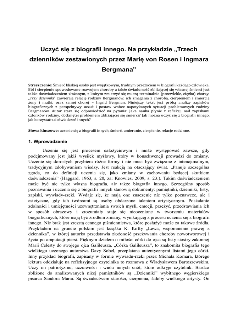 Uczyć się z biografii innego. Na przykładzie „Trzech dzienników zestawionych przez Marię von Rosen i Ingmara Bergmana” Streszczenie: Śmierć bliskiej osoby jest wyjątkowym, trudnym przeżyciem w biografii każdego człowieka. Ból i cierpienie spowodowane rozwojem choroby a także świadomość zbliżającej się własnej śmierci jest także doświadczeniem złożonym, z którym zmierzyć się muszą terminalnie (przewlekle, ciężko) chorzy. „Trzy dzienniki” zawierają relację rodziny Bergmanów, ich zmagania z chorobą, cierpieniem i śmiercią żony i matki, oraz samej chorej – Ingrid Bergman. Niniejszy tekst jest próbą analizy zapisków biograficznych z perspektywy uczuć i postaw wobec napotykanych sytuacji problemowych rodziny Bergmanów. Autor stara się odpowiedzieć na pytania: Jaka nauka płynie z refleksji nad zapiskami członków rodziny, dotkniętej problemem zbliżającej się śmierci? Jak można uczyć się z biografii innego, jak korzystać z doświadczeń innych? Słowa kluczowe: uczenie się z biografii innych, śmierć, umieranie, cierpienie, relacje rodzinne. 1. Wprowadzenie Uczenie się jest procesem całożyciowym i może występować zawsze, gdy podejmowany jest jakiś wysiłek myślowy, który w konsekwencji prowadzi do zmiany. Uczenie się dorosłych przybiera różne formy i nie musi być związane z intencjonalnym, tradycyjnym zdobywaniem wiedzy. Jest reakcją na otaczający świat. „Panuje szczególna zgoda, co do definicji uczenia się, jako zmiany w zachowaniu będącej skutkiem doświadczenia” (Haggard, 1963, s. 20, za: Knowles, 2009, s. 23.). Takim doświadczeniem może być nie tylko własna biografia, ale także biografia innego. Szczególny sposób poznawania i uczenia się z biografii innych stanowią dokumenty: pamiętniki, dzienniki, listy, zapiski, wywiady-rzeki. Wydaje się, że mają one znaczenie nie tylko poznawcze, ale i estetyczne, gdy ich twórcami są osoby obdarzone talentem artystycznym. Posiadanie zdolności i umiejętności uzewnętrzniania swoich myśli, emocji, przeżyć, przedstawiania ich w sposób obrazowy i zrozumiały staje się nieocenione w tworzeniu materiałów biograficznych, które mają być źródłem zmiany, wynikającej z procesu uczenia się z biografii innego. Nie brak jest zresztą cennego piśmiennictwa, które posłużyć może za takowe źródła. Przykładem na gruncie polskim jest książka K. Kofty „Lewa, wspomnienie prawej z dziennika”, w której autorka przedstawia złożoność przeżywania choroby nowotworowej i życia po amputacji piersi. Pięknym dziełem o miłości córki do ojca są listy siostry zakonnej Marii Celesty do swojego ojca Galileusza. „Córka Galileusza”, to znakomita biografia tego wielkiego uczonego autorstwa Davy Sobel, przeplatana autentycznymi listami jego córki. Inny przykład biografii, zapisany w formie wywiadu-rzeki przez Michała Komara, którego lektura oddziałuje na refleksyjnego czytelnika to rozmowa z Władysławem Bartoszewskim. Uczy on patriotyzmu, uczciwości i wielu innych cnót, które odkryje czytelnik. Bardzo zbliżone do analizowanych niżej pamiętników są „Dzienniki” wybitnego węgierskiego pisarza Sandora Marai. Są świadectwem starości, cierpienia, żałoby wielkiego artysty. On Uczyć się z biografii Innego. Na przykładzie „Trzech Dzienników… także zmaga się z chorobą terminalną ukochanej żony, z jej śmiercią i samotnością. Jest to perspektywa katolika, artysty, humanisty, obserwatora życia, obawiającego się niedołężnej starości. Można zatem uczyć się z biografii innego. W przypadku dzienników rodziny Bergmanów można z trzech źródeł – trzech dzienników uczestników tragicznych przeżyć związanych z chorobą nowotworową, uczyć się pokory, miłości, szacunku dla drugiego, a przede wszystkim – takie są moje odczucia i moja nauka – zrozumieć ciężko chorego i jego najbliższych. Jest to okazja do wzięcia lekcji umierania oraz życia w cierpieniu i żałobie 1. 2. Analiza dzienników rodziny Bergmanów Ingrid jest matką 4 dzieci, ostatnie z nich – Maria pochodzi ze związku z wybitnym reżyserem Ingmarem Bergmanem. To właśnie tych dwoje ludzi: mąż i córka będą najbliższymi osobami w ostatnich latach życia Ingrid, a w szczególności ostatnich miesięcy, które naznaczone zostały cierpieniem i powolnym odchodzeniem. Ingrid jest oszczędna w słowach, ale treści zapisków są najczęściej rzeczowe, dosadne, mocne, bezpardonowe. Niejednokrotnie jednak chcąc, przypuszczalnie, uwolnić swoje myśli od trudnej sytuacji, narratorka pomija w swoich notatkach najważniejsze wydarzenia dnia, zapisując mało istotne informacje. Opisuje zdawkowo pogodę, swoje samopoczucie, swój sen, przedstawia terminy badań. Jednak to, co najczęściej zaprząta myśli chorej Ingrid, to przede wszystkim troska o innych, a w szczególności o Ingmara. Zarówno ona jak i on niejednokrotnie dają dowód swojej miłości i troski względem siebie, Ingrid pisze: „(…) Tylko tęsknię do Ciebie, Twojego poczucia bezpieczeństwa, miłości i Twojej słabości, czuję, jakby płynął między nami strumień dobra, delikatności i miłości. Dobre, co? Więc niech tak będzie: trzeba stanąć jedną nogą w grobie, aby o tym pomyśleć. Kocham Cię!” (Ingrid, s. 42). Chce być silna i chronić najbliższych, niepokoi się o nich: „… Ingmar jest bardzo smutny, biedactwo” (Ingrid, s. 28). Stara się zrozumieć intencje i uczucia najbliższych: „Dobrze spałam. Mam kłopoty po każdym posiłku. Jest tu Maria, wychodzimy na trochę, ja na bardzo drżących nogach. Przez cały dzień czuję żołądek. Męczące. Ingmar z wizytą. Przygnębiam go, on tak się niepokoi, że przyjadę do domu, i to się udziela” (Ingrid, s. 176). Stale myśli o śmierci. Ostatni zapis chorej: „Spałam dobrze, ale moje nogi opuchły jak kłody. Nie chcę odwiedzin. Jestem słaba” (Ingrid, s. 213). Jak