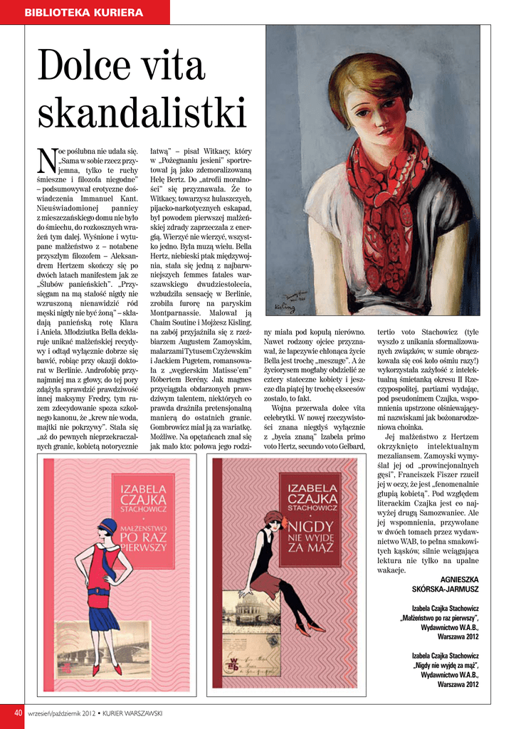 biblioteka kuriera Dolce vita skandalistki N oc poślubna nie udała się. „Sama w sobie rzecz przyjemna, tylko te ruchy śmieszne i filozofa niegodne” – podsumowywał erotyczne doś wiadczenia Immanuel Kant. Nieuświadomionej pannicy z mieszczańskiego domu nie było do śmiechu, do rozkosznych wrażeń tym dalej. Wyśnione i wytupane małżeństwo z – notabene przyszłym filozofem – Aleksan drem Hertzem skończy się po dwóch latach manifestem jak ze „Ślubów panieńskich”. „Przy sięgam na mą stałość nigdy nie wzruszoną nienawidzić ród męski nigdy nie być żoną” – składają panieńską rotę Klara i Aniela. Młodziutka Bella deklaruje unikać małżeńskiej recydywy i odtąd wyłącznie dobrze się bawić, robiąc przy okazji doktorat w Berlinie. Androfobię przynajmniej ma z głowy, do tej pory zdążyła sprawdzić prawdziwość innej maksymy Fredry, tym ra zem zdecydowanie spoza szkolnego kanonu, że „krew nie woda, majtki nie pokrzywy”. Stała się „aż do pewnych nieprzekraczalnych granic, kobietą notorycznie łatwą” – pisał Witkacy, który w „Pożegnaniu jesieni” sportretował ją jako zdemoralizowaną Helę Bertz. Do „atrofii moralności” się przyznawała. Że to Witkacy, towarzysz hulaszczych, pijacko-narkotycznych eskapad, był powodem pierwszej małżeńskiej zdrady zaprzeczała z energią. Wierzyć nie wierzyć, wszystko jedno. Była muzą wielu. Bella Hertz, niebieski ptak międzywojnia, stała się jedną z najbarwniejszych femmes fatales warszawskiego dwudziestolecia, wzbudziła sensację w Berlinie, zrobiła furorę na paryskim Montparnassie. Malował ją Chaim Soutine i Mojżesz Kisling, na zabój przyjaźniła się z rzeźbiarzem Augustem Zamoyskim, malarzami Tytusem Czyżewskim i Jackiem Pugetem, romansowała z „węgierskim Matisse’em” Róbertem Berény. Jak magnes przyciągała obdarzonych prawdziwym talentem, niektórych co prawda drażniła pretensjonalną manierą do ostatnich granic. Gombrowicz miał ją za wariatkę. Możliwe. Na opętańcach znał się jak mało kto: połowa jego rodzi- ny miała pod kopułą nierówno. Nawet rodzony ojciec przyznawał, że łapczywie chłonąca życie Bella jest trochę „meszuge”. A że życiorysem mogłaby obdzielić ze cztery stateczne kobiety i jeszcze dla piątej by trochę ekscesów zostało, to fakt. Wojna przerwała dolce vita celebrytki. W nowej rzeczywistości znana niegdyś wyłącznie z „bycia znaną” Izabela primo voto Hertz, secundo voto Gelbard, tertio voto Stachowicz (tyle wyszło z unikania sformalizowanych związków, w sumie obrączkowała się coś koło ośmiu razy!) wykorzystała zażyłość z intelektualną śmietanką okresu II Rze czypospolitej, partiami wydając, pod pseudonimem Czajka, wspomnienia upstrzone olśniewającymi nazwiskami jak bożonarodzeniowa choinka. Jej małżeństwo z Hertzem okrzyknięto intelektualnym mezaliansem. Zamoyski wymyślał jej od „prowincjonalnych gęsi”, Franciszek Fiszer rzucił jej w oczy, że jest „fenomenalnie głupią kobietą”. Pod względem literackim Czajka jest co najwyżej drugą Samozwaniec. Ale jej wspomnienia, przywołane w dwóch tomach przez wydawnictwo WAB, to pełna smakowitych kąsków, silnie wciągająca lektura nie tylko na upalne wakacje. Agnieszka Skórska-Jarmusz Izabela Czajka Stachowicz „Małżeństwo po raz pierwszy”, Wydawnictwo W.A.B., Warszawa 2012 Izabela Czajka Stachowicz „Nigdy nie wyjdę za mąż”, Wydawnictwo W.A.B., Warszawa 2012 40 wrzesień/październik 2012 • kurier warszawski