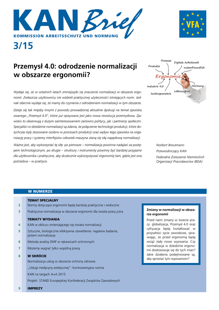 KAN KOMMISSION ARBEITSSCHUTZ UND NORMUNG 3/15 Przemysł 4.0: odrodzenie normalizacji w obszarze ergonomii? Wydaje się, że w ostatnich latach zmniejszyło się znaczenie normalizacji w obszarze ergonomii. Zwłaszcza użytkownicy nie widzieli praktycznej użyteczności istniejących norm. Jednak obecnie wydaje się, że mamy do czynienia z odrodzeniem normalizacji w tym obszarze. Dzieje się tak między innymi z powodu prowadzonej aktualnie dyskusji na temat zjawiska zwanego „Przemysł 4.0”, które już opisywane jest jako nowa rewolucja przemysłowa. Zjawisko to obserwują z dużym zainteresowaniem zarówno politycy, jak i partnerzy społeczni. Specjaliści w dziedzinie normalizacji są zdania, że połączenie technologii produkcji, które dotychczas były stosowane osobno w procesach produkcji oraz wpływ tego zjawiska na organizację pracy i systemy interfejsów człowiek-maszyna staną się siłą napędową normalizacji. Ważne jest, aby wykorzystać tę siłę: po pierwsze – normalizacja powinna nadążać za postę- Norbert Breutmann pem technologicznym, po drugie – struktury i instrumenty powinny być bardziej przyjazne Przewodniczący KAN dla użytkownika i praktyczne, aby skutecznie wykorzystywać ergonomię tam, gdzie jest ona Federalne Zrzeszenie Niemieckich Organizacji Pracodawców (BDA) potrzebna – w praktyce. W NUMERZE 2 TEMAT SPECJALNY N ormy dotyczące ergonomii będą bardziej praktyczne i widoczne 3 Praktyczna normalizacja w obszarze ergonomii dla świata pracy jutra 4 KAN w obliczu zmieniającego się świata normalizacji 5 S ztuczne, biologicznie efektywne oświetlenie: najpierw badania, potem normalizacja 6 Metoda analizy DMF w rękawicach ochronnych 7 Możemy wygrać tylko wspólną pracą 8 W SKRÓCIE Normalizacja usług w obszarze ochrony zdrowia „Usługi medycyny estetycznej”: kontrowersyjna norma KAN na targach A+A 2015 TEMATY WYDANIA Projekt STAND Europejskiej Konfederacji Związków Zawodowych 9 IMPREZY Zmiany w normalizacji w obszarze ergonomii Przed nami zmiany w świecie pracy: globalizacja, Przemysł 4.0 oraz cyfryzacja będą kształtować w przyszłości życie zawodowe, sprawiając, że przed ergonomią będą wciąż stały nowe wyzwania. Czy normalizacja w dziedzinie ergonomii dostosowuje się do tych mian? Jakie działania podejmowane są, aby sprostać tym wyzwaniom? TEMAT SPECJALNY Normy dotyczące ergonomii będą bardziej praktyczne i widoczne Ergonomia jest w normalizacji dyscypliną horyzontalną. Ma wpływ na projektowanie systemów, wyrobów i usług poprzez uwzględnianie cech charakterystycznych, potrzeb i możliwości człowieka. Georg Krämer, który do 2015 roku pełnił funkcję przewodniczącego komitetu technicznego ISO/TC 159 ds. ergonomii oraz jego następca, Peter Frener przedstawiają działania, które są aktualnie podejmowane w obszarze normalizacji dotyczącej ergonomii, aby była ona bardziej widoczna we wszystkich dziadzinach, w których ma zastosowanie. Jakie aspekty normalizacji w obszarze ergonomii zmieniły się w ostatnich latach? Georg Krämer: Normalizacja dotycząca ergonomii obejmuje wiele obszarów działalności, które są zorganizowane w najbardziej zróżnicowane grupy robocze. Aby działalność normalizacyjna była prowadzona w sposób skuteczny i angażowała istniejącą już grupę ekspertów, konieczne było zharmonizowanie struktur międzynarodowych, europejskich i krajowych komitetów. Do realizacji tego celu dążono w sposób rozważny i obecnie mamy jasną strukturę funkcji i współpracy. Georg Krämer Przewodniczący komitetu technicznego ISO/TC 159 ds. ergonomii od roku 2015 Jeśli chodzi o treści, normalizacja w obszarze ergonomii na początkowym etapie zajmowała się głównie projektowaniem miejsc pracy. Z biegiem czasu konieczne stało się rozszerzenie zakresu ergonomii poza miejsca pracy i opisanie wymagań ergonomicznych w normie podstawowej. Powstała norma EN ISO 26800 – dokument, w którym po raz pierwszy ustalono przepisy normatywne dla ergonomii i zasady dla całego cyklu życia wyrobów we wszystkich dziedzinach życia. Największe wyzwanie stanowi ogromna różnorodność zastosowań ergonomii. Aby normy odzwierciedlały najnowsze osiągnięcia, niezbędna jest wszechstronna wiedza w wielu dziedzinach. Aby wygenerować tę wiedzę, powstała sieć instytucji i kontaktów. Krajowe towarzystwa ergonomiczne oraz ich odpowiedniki europejskie i międzynarodowe, takie jak FEES1 oraz IEA2 to jedni z naszych najważniejszych partnerów. Peter Frener Przewodniczący komitetu technicznego ISO/TC 159 ds. ergonomii do roku 2015 1 Federation of European Ergonomics Societies – Federacja Europejskich Towarzystw Ergonomicznych, www.ergonomics-fees.eu 2 International Ergonomics Association - Międzynarodowe Stowarzyszenie Ergonomiczne, www.iea.cc Jakie działania podejmowane są w przypadku niesatysfakcjonującego stosowania norm dotyczących ergonomii, co jest niezmiennie krytykowane? Komitet ISO/TC 159 został powołany w 1974 roku i do dziś opublikował 120 norm z dziedziny ergonomii. Generalnie jednak normy te dotarły tylko do niewielkiej grupy ekspertów i nie zostały (jeszcze) upowszechnione w takim stopniu, w jakim powinny. Powinniśmy więc nie tylko działać, ale również upowszechniać wyniki naszej pracy. Ważne jest, aby zidentyfikować sposoby, dzięki którym podniesiemy świadomość istnienia norm. Grupa robocza działająca w ramach komitetu technicznego CEN/TC 122 podjęła się tego zadania i wspólnie z FEES przeprowadziła badanie na 2 KANBrief 3|15 temat stosowania i korzyści wynikających ze stosowania norm z dziedziny ergonomii. Poszczególne grupy robocze zajmą się teraz opracowywaniem wyników tego badania. Przykładem jest rekomendacja, aby wstęp do normy opracowywany był pod kątem użytkownika, już podczas pisania projektu normy lub jej rewizji, aby podkreślić korzyści płynące ze stosowania normy, a także określić w sposób bardzi