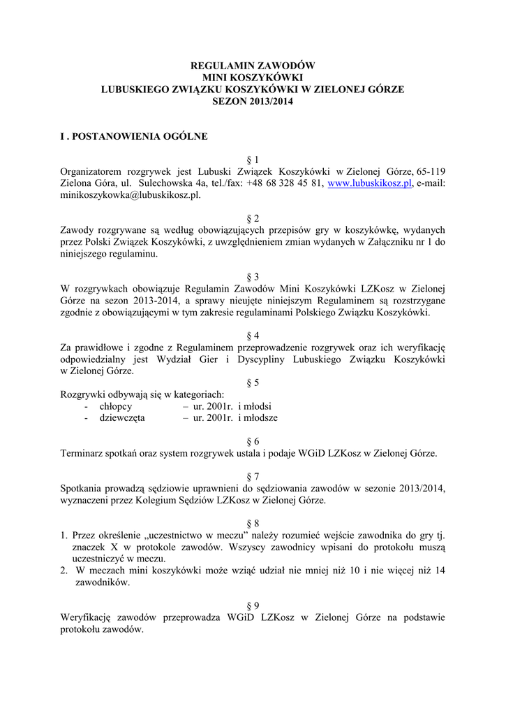 REGULAMIN ZAWODÓW MINI KOSZYKÓWKI LUBUSKIEGO ZWIĄZKU KOSZYKÓWKI W ZIELONEJ GÓRZE SEZON 2013/2014 I . POSTANOWIENIA OGÓLNE §1 Organizatorem rozgrywek jest Lubuski Związek Koszykówki w Zielonej Górze, 65-119 Zielona Góra, ul. Sulechowska 4a, tel./fax: +48 68 328 45 81, www.lubuskikosz.pl, e-mail: [email protected]. §2 Zawody rozgrywane są według obowiązujących przepisów gry w koszykówkę, wydanych przez Polski Związek Koszykówki, z uwzględnieniem zmian wydanych w Załączniku nr 1 do niniejszego regulaminu. §3 W rozgrywkach obowiązuje Regulamin Zawodów Mini Koszykówki LZKosz w Zielonej Górze na sezon 2013-2014, a sprawy nieujęte niniejszym Regulaminem są rozstrzygane zgodnie z obowiązującymi w tym zakresie regulaminami Polskiego Związku Koszykówki. §4 Za prawidłowe i zgodne z Regulaminem przeprowadzenie rozgrywek oraz ich weryfikację odpowiedzialny jest Wydział Gier i Dyscypliny Lubuskiego Związku Koszykówki w Zielonej Górze. §5 Rozgrywki odbywają się w kategoriach: - chłopcy – ur. 2001r. i młodsi - dziewczęta – ur. 2001r. i młodsze §6 Terminarz spotkań oraz system rozgrywek ustala i podaje WGiD LZKosz w Zielonej Górze. §7 Spotkania prowadzą sędziowie uprawnieni do sędziowania zawodów w sezonie 2013/2014, wyznaczeni przez Kolegium Sędziów LZKosz w Zielonej Górze. §8 1. Przez określenie „uczestnictwo w meczu” należy rozumieć wejście zawodnika do gry tj. znaczek X w protokole zawodów. Wszyscy zawodnicy wpisani do protokołu muszą uczestniczyć w meczu. 2. W meczach mini koszykówki może wziąć udział nie mniej niż 10 i nie więcej niż 14 zawodników. §9 Weryfikację zawodów przeprowadza WGiD LZKosz w Zielonej Górze na podstawie protokołu zawodów. § 10 1. Wszelkiego rodzaju odwołania są wystąpieniem o zmianę decyzji wydanej przez organa do tego upoważnione. 2. Równocześnie z wnioskiem odwołania musi być wniesiona opłata manipulacyjna w wysokości 25 zł, a do wniosku dołączony dowód wpłaty (kserokopia). 3. Bez spełnienia powyższych wymagań odwołanie nie będzie rozpatrywane. § 11 1. Protest dotyczący przebiegu i wyniku meczu należy zgłosić w ciągu 48 godzin po jego zakończeniu, po spełnieniu warunków określonych w przepisach gry w koszykówkę. 2. Równocześnie ze złożeniem protestu musi być wpłacona kaucja w wysokości 200 zł, a do wniosku dołączony dowód wpłaty (kserokopia). 3. W przypadku odrzucenia protestu kaucja przepada na rzecz LZKosz w Zielonej Górze. II. PRAWA I OBOWIĄZKI DRUŻYN § 12 Zespoły uczestniczące w rozgrywkach oraz trenerzy i osoby towarzyszące drużynie zobowiązane są do przestrzegania postanowień regulaminów i przepisów gry pod rygorem stosowania kar regulaminowych. § 13 1. Gospodarz turnieju wyznacza organizatora zawodów, którego nazwisko zostaje wpisane do protokołu zawodów. 2. Do obowiązków organizatora turnieju należy: a) powiadomienie pocztą elektroniczną, najpóźniej na 7 dni przed terminem turnieju lub meczu, przeciwników i LZKosz w Zielonej Górze, b) prawidłowe przygotowanie sali do gry (min. temp. powietrza 15 C) oraz udostępnienie na minimum godzinę przed meczem oddzielnych szatni dla drużyn i sędziów, c) gospodarz decyduje czy turniej rozgrywany jest na kosze obniżone (2,65m) czy normalne (3,05m), d) turnieje rozgrywane są piłkami w rozmiarze „5”, e) zapewnienie prawidłowego funkcjonowania wyposażenia technicznego w czasie turnieju, f) zapewnienie opieki medycznej w czasie, jak i po zakończeniu spotkania. Przedstawiciel opieki medycznej jest zobowiązany potwierdzić swoją obecność pieczątką w protokole, g) przesłanie oryginałów protokołów do LZKosz w Zielonej Górze natychmiast po zakończeniu turnieju. § 14 Koszty organizacyjne turnieju ponoszą gospodarze zawodów, a drużyny gości uczestniczą w zawodach całkowicie na koszt własny. § 15 1. Termin zgłaszania drużyn do rozgrywek mini koszykówki w sezonie 2013/2014 upływa 16.10.2013 r. 2. Warunkiem przyjęcia zespołu do rozgrywek mini koszykówki jest dostarczenie do dnia 16.10.2013 r., na adres LZKosz w Zielonej Górze, dwóch egzemplarzy list zawodników, które powinny zawierać: nazwisko i imię, datę urodzenia, PESEL, nr licencji zawodnika PZKosz (o której mowa w § 15, pkt 3), imię i nazwisko trenera oraz nr licencji trenerskiej Każdy zawodnik biorący udział w zawodach mini koszykówki Lubuskiego Związku Koszykówki w Zielonej Górze musi posiadać licencję zawodnika PZKosz. 3. Uprawniony do gry jest zawodnik zgłoszony w sposób określony wyżej i potwierdzony do rozgrywek przez WGiD LZKosz w Zielonej Górze. § 16 Po rozpoczęciu rozgrywek można dodatkowo zgłosić zawodnika do gry, pod warunkiem, że zawodnik ten nie był wcześniej zgłoszony przez inny zespół. Zawodnik może reprezentować barwy tylko jednego zespołu. § 17 Spotkania muszą być rozegrane zgodnie z terminarzem i w godzinach podanych przez organizatora zawodów. § 18 Zmiany zaplanowanych terminów meczów mogą być dokonywane jedynie w wyjątkowych przypadkach i tylko za zgodą WGiD LZKosz w Zielonej Górze, po wcześniejszym uzgodnieniu między zespołami nowego terminu, zaakceptowanego przez WGiD. § 19 WGiD LZKosz w Zielonej Górze ma prawo, w szczególnych przypadkach, zmienić termin spotkania „z urzędu”, (z ważnych przyczyn). § 20 1. W rozgrywkach mogą uczestniczyć tylko zawodnicy zgłoszeni i uprawnieni do gry w danym zespole oraz potwierdzeni przez WGiD LZKosz w Zielonej Górze, posiadający odpowiednie licencje. 2. Podstawą do udziału zespołu w turnieju bądź meczu jest okazanie listy zawodników potwierdzonej przez LZKosz w Zielonej Górze. 3. Udział w meczu zawodnika, którego nie ma na liście skutkuje zweryfikowaniem meczu jako walkower na korzyść drużyny przeciwnej. 4. Nie okazanie sędziemu głównemu przed zawodami dokumentu tożsamości zawodnika powoduje, że zawodnik ten nie może brać udziału w zawodac