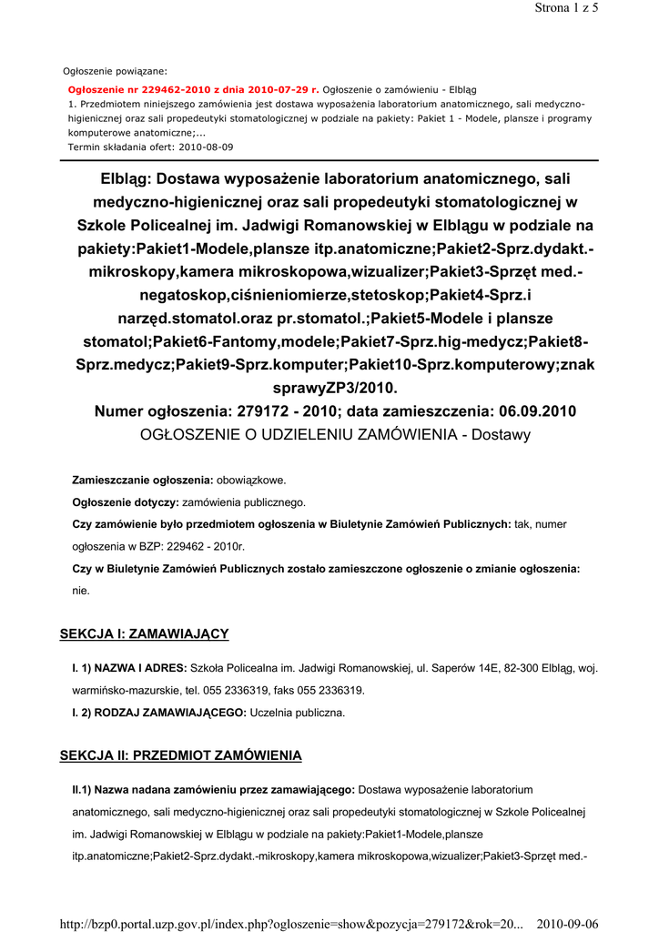 Strona 1 z 5 Ogłoszenie powiązane: Ogłoszenie nr 229462-2010 z dnia 2010-07-29 r. Ogłoszenie o zamówieniu - Elbląg 1. Przedmiotem niniejszego zamówienia jest dostawa wyposażenia laboratorium anatomicznego, sali medycznohigienicznej oraz sali propedeutyki stomatologicznej w podziale na pakiety: Pakiet 1 - Modele, plansze i programy komputerowe anatomiczne;... Termin składania ofert: 2010-08-09 Elbląg: Dostawa wyposażenie laboratorium anatomicznego, sali medyczno-higienicznej oraz sali propedeutyki stomatologicznej w Szkole Policealnej im. Jadwigi Romanowskiej w Elblągu w podziale na pakiety:Pakiet1-Modele,plansze itp.anatomiczne;Pakiet2-Sprz.dydakt.mikroskopy,kamera mikroskopowa,wizualizer;Pakiet3-Sprzęt med.negatoskop,ciśnieniomierze,stetoskop;Pakiet4-Sprz.i narzęd.stomatol.oraz pr.stomatol.;Pakiet5-Modele i plansze stomatol;Pakiet6-Fantomy,modele;Pakiet7-Sprz.hig-medycz;Pakiet8Sprz.medycz;Pakiet9-Sprz.komputer;Pakiet10-Sprz.komputerowy;znak sprawyZP3/2010. Numer ogłoszenia: 279172 - 2010; data zamieszczenia: 06.09.2010 OGŁOSZENIE O UDZIELENIU ZAMÓWIENIA - Dostawy Zamieszczanie ogłoszenia: obowiązkowe. Ogłoszenie dotyczy: zamówienia publicznego. Czy zamówienie było przedmiotem ogłoszenia w Biuletynie Zamówień Publicznych: tak, numer ogłoszenia w BZP: 229462 - 2010r. Czy w Biuletynie Zamówień Publicznych zostało zamieszczone ogłoszenie o zmianie ogłoszenia: nie. SEKCJA I: ZAMAWIAJĄCY I. 1) NAZWA I ADRES: Szkoła Policealna im. Jadwigi Romanowskiej, ul. Saperów 14E, 82-300 Elbląg, woj. warmińsko-mazurskie, tel. 055 2336319, faks 055 2336319. I. 2) RODZAJ ZAMAWIAJĄCEGO: Uczelnia publiczna. SEKCJA II: PRZEDMIOT ZAMÓWIENIA II.1) Nazwa nadana zamówieniu przez zamawiającego: Dostawa wyposażenie laboratorium anatomicznego, sali medyczno-higienicznej oraz sali propedeutyki stomatologicznej w Szkole Policealnej im. Jadwigi Romanowskiej w Elblągu w podziale na pakiety:Pakiet1-Modele,plansze itp.anatomiczne;Pakiet2-Sprz.dydakt.-mikroskopy,kamera mikroskopowa,wizualizer;Pakiet3-Sprzęt med.- http://bzp0.portal.uzp.gov.pl/index.php?ogloszenie=show&pozycja=279172&rok=20... 2010-09-06 Strona 2 z 5 negatoskop,ciśnieniomierze,stetoskop;Pakiet4-Sprz.i narzęd.stomatol.oraz pr.stomatol.;Pakiet5-Modele i plansze stomatol;Pakiet6-Fantomy,modele;Pakiet7-Sprz.hig-medycz;Pakiet8-Sprz.medycz;Pakiet9Sprz.komputer;Pakiet10-Sprz.komputerowy;znak sprawyZP3/2010.. II.2) Rodzaj zamówienia: Dostawy. II.3) Określenie przedmiotu zamówienia: 1. Przedmiotem niniejszego zamówienia jest dostawa wyposażenia laboratorium anatomicznego, sali medyczno-higienicznej oraz sali propedeutyki stomatologicznej w podziale na pakiety: Pakiet 1 - Modele, plansze i programy komputerowe anatomiczne; Pakiet 2 - Sprzęt dydaktyczny - mikroskopy, kamera mikroskopowa, wizualizer; Pakiet 3 - Sprzęt medyczny - negatoskop, ciśnieniomierze, stetoskop; Pakiet 4 - Sprzęt i narzędzia stomatologiczne oraz program komputerowy do prowadzenia gabinetu stomatologicznego; Pakiet 5 - Modele i plansze stomatologiczne; Pakiet 6 - Fantomy, manekiny i modele pielęgnacyjne; Pakiet 7 - Sprzęt higieniczno-medyczny - łóżka, sprzęt przyłóżkowy, szafki przyłóżkowe, parawany; Pakiet 8 Sprzęt medyczny - termometry, ciśnieniomierze; Pakiet 9 - Sprzęt komputerowy, zestaw interaktywny, laserowe urządzenie wielofunkcyjne; Pakiet 10 - Sprzęt komputerowy, zestawy interaktywne, laserowe urządzenia wielofunkcyjne; 2. Szczegółowe opisy przedmiotu zamówienia zostały określone w Formularzach wymaganych warunków technicznych, dla poszczególnych pakietów, o których mowa w części II SIWZ, stanowiących załączniki od 3.1 do 3.10. II.4) Wspólny Słownik Zamówień (CPV): 39.16.21.00-0, 33.10.00.00-1, 32.32.20.00-6, 33.11.00.00-4, 30.21.30.00-5, 30.21.31.00-6, 48.00.00.00-8. SEKCJA III: PROCEDURA III.1) TRYB UDZIELENIA ZAMÓWIENIA: Przetarg nieograniczony III.2) INFORMACJE ADMINISTRACYJNE Zamówienie dotyczy projektu/programu finansowanego ze środków Unii Europejskiej: tak, projekt/program: Projekt pn. Modernizacja i wyposażenie laboratorium anatomicznego, sali medycznohigienicznej oraz sali propedeutyki stomatologicznej w Szkole Policealnej im. Jadwigi Romanowskiej w Elblągu. Projekt dofinansowany ze środków Unii Europejskiej EuropejskiegoFunduszu Rozwoju Regionalnego w ramach Regionalnego Programu Operacyjnego Warmia i Mazury na lata 2007-2013.. SEKCJA IV: UDZIELENIE ZAMÓWIENIA Część NR: 1 Nazwa: Pakiet 1 - Modele,plansze i programy komputerowe anatomiczne; IV.1) DATA UDZIELENIA ZAMÓWIENIA: 29.07.2010. IV.2) LICZBA OTRZYMANYCH OFERT: 2. IV.3) LICZBA ODRZUCONYCH OFERT: 0. IV.4) NAZWA I ADRES WYKONAWCY, KTÓREMU UDZIELONO ZAMÓWIENIA: http://bzp0.portal.uzp.gov.pl/index.php?ogloszenie=show&pozycja=279172&rok=20... 2010-09-06 Strona 3 z 5 KSEDMED Sławomir Kusiak, Rybie 47, 22-360 Rejowiec, kraj/woj. mazowieckie. IV.5) Szacunkowa wartość zamówienia (bez VAT): 78819,34 PLN. IV.6) INFORMACJA O CENIE WYBRANEJ OFERTY ORAZ O OFERTACH Z NAJNIŻSZĄ I NAJWYŻSZĄ CENĄ Cena wybranej oferty: 47000,00 Oferta z najniższą ceną: 47000,00 / Oferta z najwyższą ceną: 51148,07 Waluta: PLN. Część NR: 2 Nazwa: Pakiet 2 - Sprzęt dydaktyczny - mikroskopy, kamera mikroskopowa, wizualizer. IV.1) DATA UDZIELENIA ZAMÓWIENIA: 29.07.2010. IV.2) LICZBA OTRZYMANYCH OFERT: 2. IV.3) LICZBA ODRZUCONYCH OFERT: 0. IV.4) NAZWA I ADRES WYKONAWCY, KTÓREMU UDZIELONO ZAMÓWIENIA: EDUKO Jolanta Maciejczyk, ul. Konstruktorska 4, 02-673 Warszawa, kraj/woj. mazowieckie. IV.5) Szacunkowa wartość zamówienia (bez VAT): 13023,27 PLN. IV.6) INFORMACJA O CENIE WYBRANEJ OFERTY ORAZ O OFERTACH Z NAJNIŻSZĄ I NAJWYŻSZĄ CENĄ Cena wybranej oferty: 11433,60 Oferta z najniższą ceną: 11433,60 / Oferta z najwyższą ceną: 16300,00 Waluta: PLN. Część NR: 3 Nazwa: Pakiet 3 - Sprzęt medyczny - negatoskop, ciśnieniomierze, stetoskop. IV.1) DATA UDZIELENIA ZAMÓWIENIA: 29.07.2010. IV.2) LICZBA OTRZYMANYCH OFERT: 3. IV.3) LIC