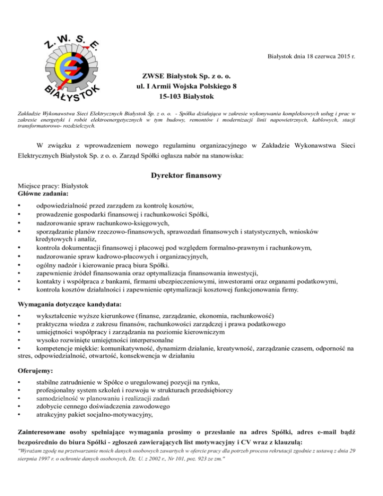 Białystok dnia 18 czerwca 2015 r. ZWSE Białystok Sp. z o. o. ul. I Armii Wojska Polskiego 8 15-103 Białystok Zakładzie Wykonawstwa Sieci Elektrycznych Białystok Sp. z o. o. - Spółka działająca w zakresie wykonywania kompleksowych usług i prac w zakresie energetyki i robót elektroenergetycznych w tym budowy, remontów i modernizacji linii napowietrznych, kablowych, stacji transformatorowo- rozdzielczych. W związku z wprowadzeniem nowego regulaminu organizacyjnego w Zakładzie Wykonawstwa Sieci Elektrycznych Białystok Sp. z o. o. Zarząd Spółki ogłasza nabór na stanowiska: Dyrektor finansowy Miejsce pracy: Białystok Główne zadania: • • • • • • • • • • odpowiedzialność przed zarządem za kontrolę kosztów, prowadzenie gospodarki finansowej i rachunkowości Spółki, nadzorowanie spraw rachunkowo-księgowych, sporządzanie planów rzeczowo-finansowych, sprawozdań finansowych i statystycznych, wniosków kredytowych i analiz, kontrola dokumentacji finansowej i płacowej pod względem formalno-prawnym i rachunkowym, nadzorowanie spraw kadrowo-płacowych i organizacyjnych, ogólny nadzór i kierowanie pracą biura Spółki. zapewnienie źródeł finansowania oraz optymalizacja finansowania inwestycji, kontakty i współpraca z bankami, firmami ubezpieczeniowymi, inwestorami oraz organami podatkowymi, kontrola kosztów działalności i zapewnienie optymalizacji kosztowej funkcjonowania firmy. Wymagania dotyczące kandydata: • wykształcenie wyższe kierunkowe (finanse, zarządzanie, ekonomia, rachunkowość) • praktyczna wiedza z zakresu finansów, rachunkowości zarządczej i prawa podatkowego • umiejętności współpracy i zarządzania na poziomie kierowniczym • wysoko rozwinięte umiejętności interpersonalne • kompetencje miękkie: komunikatywność, dynamizm działanie, kreatywność, zarządzanie czasem, odporność na stres, odpowiedzialność, otwartość, konsekwencja w działaniu Oferujemy: • • • • • stabilne zatrudnienie w Spółce o uregulowanej pozycji na rynku, profesjonalny system szkoleń i rozwoju w strukturach przedsiębiorcy samodzielność w planowaniu i realizacji zadań zdobycie cennego doświadczenia zawodowego atrakcyjny pakiet socjalno-motywacyjny, Zainteresowane osoby spełniające wymagania prosimy o przesłanie na adres Spółki, adres e-mail bądź bezpośrednio do biura Spółki - zgłoszeń zawierających list motywacyjny i CV wraz z klauzulą: "Wyrażam zgodę na przetwarzanie moich danych osobowych zawartych w ofercie pracy dla potrzeb procesu rekrutacji zgodnie z ustawą z dnia 29 sierpnia 1997 r. o ochronie danych osobowych, Dz. U. z 2002 r., Nr 101, poz. 923 ze zm." Termin składania aplikacji – do dnia 30 czerwca 2015 r. Zarząd Spółki zastrzega sobie prawo unieważnienia postępowania bez podania przyczyny.