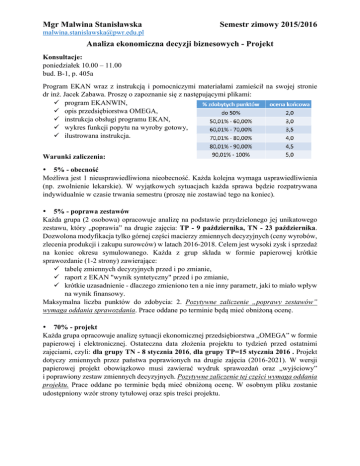 Mgr Malwina Stanisławska Semestr zimowy 2015/2016 [email protected] Analiza ekonomiczna decyzji biznesowych - Projekt Konsultacje: poniedziałek 10.00 – 11.00 bud. B-1, p. 405a Program EKAN wraz z instrukcją i pomocniczymi materiałami zamieścił na swojej stronie dr inż. Jacek Zabawa. Proszę o zapoznanie się z następującymi plikami: ü program EKANWIN, ü opis przedsiębiorstwa OMEGA, ü instrukcja obsługi programu EKAN, ü wykres funkcji popytu na wyroby gotowy, ü ilustrowana instrukcja. Warunki zaliczenia: • 5% - obecność Możliwa jest 1 nieusprawiedliwiona nieobecność. Każda kolejna wymaga usprawiedliwienia (np. zwolnienie lekarskie). W wyjątkowych sytuacjach każda sprawa będzie rozpatrywana indywidualnie w czasie trwania semestru (proszę nie zostawiać tego na koniec). • 5% - poprawa zestawów Każda grupa (2 osobowa) opracowuje analizę na podstawie przydzielonego jej unikatowego zestawu, który „poprawia” na drugie zajęcia: TP - 9 października, TN - 23 października. Dozwolona modyfikacja tylko górnej części macierzy zmiennych decyzyjnych (ceny wyrobów, zlecenia produkcji i zakupu surowców) w latach 2016-2018. Celem jest wysoki zysk i sprzedaż na koniec okresu symulowanego. Każda z grup składa w formie papierowej krótkie sprawozdanie (1-2 strony) zawierające: ü tabelę zmiennych decyzyjnych przed i po zmianie, ü raport z EKAN "wynik syntetyczny" przed i po zmianie, ü krótkie uzasadnienie - dlaczego zmieniono ten a nie inny parametr, jaki to miało wpływ na wynik finansowy. Maksymalna liczba punktów do zdobycia: 2. Pozytywne zaliczenie „poprawy zestawów” wymaga oddania sprawozdania. Prace oddane po terminie będą mieć obniżoną ocenę. • 70% - projekt Każda grupa opracowuje analizę sytuacji ekonomicznej przedsiębiorstwa „OMEGA” w formie papierowej i elektronicznej. Ostateczna data złożenia projektu to tydzień przed ostatnimi zajęciami, czyli: dla grupy TN - 8 stycznia 2016, dla grupy TP=15 stycznia 2016 . Projekt dotyczy zmiennych przez państwa poprawionych na drugie zajęcia (2016-2021). W wersji papierowej projekt obowiązkowo musi zawierać wydruk sprawozdań oraz „wyjściowy” i poprawiony zestaw zmiennych decyzyjnych. Pozytywne zaliczenie tej części wymaga oddania projektu. Prace oddane po terminie będą mieć obniżoną ocenę. W osobnym pliku zostanie udostępniony wzór strony tytułowej oraz spis treści projektu. Mgr Malwina Stanisławska Semestr zimowy 2015/2016 [email protected] • 15% - prezentacja Każda grupa zobowiązana jest do przedstawienia 10-12 minutowej prezentacji przygotowanej w Power Poincie. Prezentacja jest „wycinkiem” projektu. Maksymalna ilość punktów za prezentacje to 5. Oceniana będzie m.in. zawartość merytoryczna, sposób prezentacji oraz szata graficzna. Prezentacja powinna zawierać min. 20 slajdów. Obowiązkowa na każdym slajdzie jest stopka – imię i nazwisko, nr slajdu/liczbę slajdów. Slajdy powinny być tekstowe oraz graficzne. Wystąpienie powinno mieć wstęp, część analityczną (przedstawiającą daną część projektu) oraz podsumowanie. Pozytywne zaliczenie tej części wymaga zaprezentowania. W przypadku nieprzygotowania prezentacji w uzgodnionym wcześniej terminie przewiduję punkty ujemne. Na zajęciach na których odbywają się prezentacje każda z grup „nieprezentujących” musi pokazać wykonaną część projektu. Każda z grup będzie z tego rozliczana. W przypadku nieprzygotowania przewiduję punkty ujemne. • 5% - „wyścig szczurów” Gra kierownicza „wyścig szczurów” polega na poprawie wyników finansowych w programie EKAN (podobnie jak w zadaniu na drugie zajęcia). Różnice: ü symulacja obejmuje dłuższy okres (2016-2021), ü zmieniać można wszystkie zmienne tj. zlecenia na produkcję wyrobów, ceny wyrobów gotowych, harmonogram zakupu surowców, udział dywidendy zwykł., wskaźnik zadłużenia, emisje akcji oraz numery uruchamianych projektów inwestycyjnych, ü cała grupa otrzymuje ten sam zestaw zmiennych. Celem jest wysoki zysk i sprzedaż na koniec okresu symulowanego. Termin oddania „wyścigu szczurów” to ostatnie zajęcia czyli dla grupy TN - 15 stycznia 2016, dla grupy, TP=22 stycznia 2016. Wtedy też zostanie ustalone miejsce w rankingu w danej grupie projektowej (im wyższe miejsce w rankingu tym większa ilość przyznanych dla danej grupy punktów). Pozytywne zaliczenie tej części wymaga oddania sprawozdania. Sprawozdanie musi zawierać tabele zmiennych decyzyjnych po zmianie oraz raport raport z EKAN "wynik syntetyczny" przed i po zmianie.
