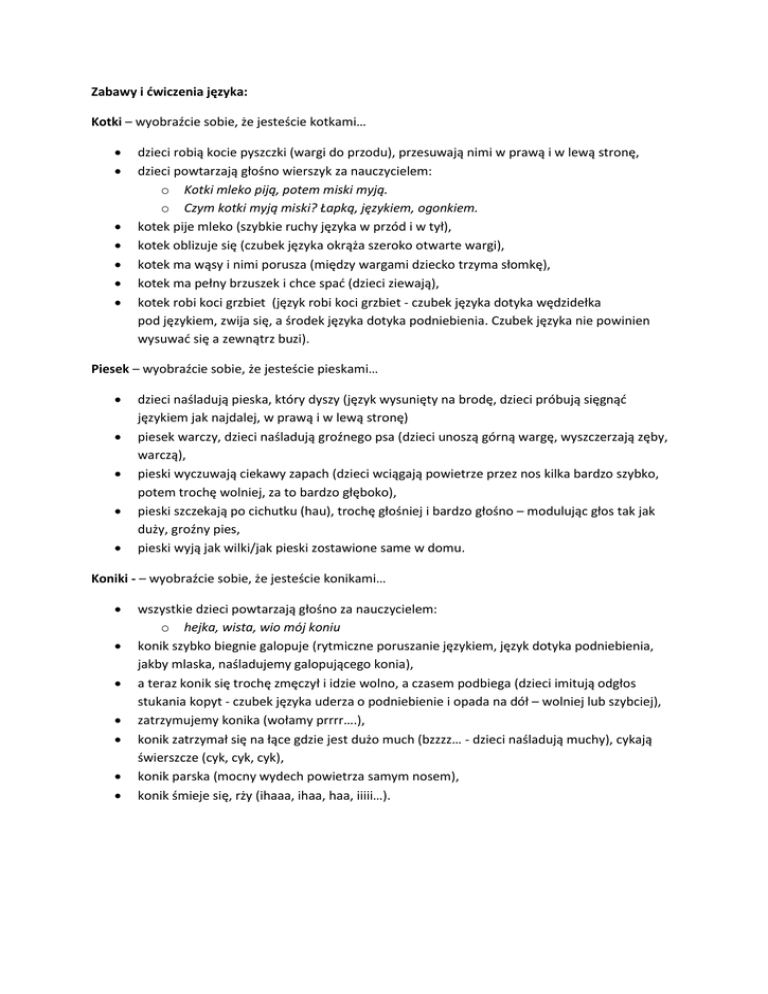 Zabawy i ćwiczenia języka: Kotki – wyobraźcie sobie, że jesteście kotkami… dzieci robią kocie pyszczki (wargi do przodu), przesuwają nimi w prawą i w lewą stronę, dzieci powtarzają głośno wierszyk za nauczycielem: o Kotki mleko piją, potem miski myją. o Czym kotki myją miski? Łapką, językiem, ogonkiem. kotek pije mleko (szybkie ruchy języka w przód i w tył), kotek oblizuje się (czubek języka okrąża szeroko otwarte wargi), kotek ma wąsy i nimi porusza (między wargami dziecko trzyma słomkę), kotek ma pełny brzuszek i chce spać (dzieci ziewają), kotek robi koci grzbiet (język robi koci grzbiet - czubek języka dotyka wędzidełka pod językiem, zwija się, a środek języka dotyka podniebienia. Czubek języka nie powinien wysuwać się a zewnątrz buzi). Piesek – wyobraźcie sobie, że jesteście pieskami… dzieci naśladują pieska, który dyszy (język wysunięty na brodę, dzieci próbują sięgnąć językiem jak najdalej, w prawą i w lewą stronę) piesek warczy, dzieci naśladują groźnego psa (dzieci unoszą górną wargę, wyszczerzają zęby, warczą), pieski wyczuwają ciekawy zapach (dzieci wciągają powietrze przez nos kilka bardzo szybko, potem trochę wolniej, za to bardzo głęboko), pieski szczekają po cichutku (hau), trochę głośniej i bardzo głośno – modulując głos tak jak duży, groźny pies, pieski wyją jak wilki/jak pieski zostawione same w domu. Koniki - – wyobraźcie sobie, że jesteście konikami… wszystkie dzieci powtarzają głośno za nauczycielem: o hejka, wista, wio mój koniu konik szybko biegnie galopuje (rytmiczne poruszanie językiem, język dotyka podniebienia, jakby mlaska, naśladujemy galopującego konia), a teraz konik się trochę zmęczył i idzie wolno, a czasem podbiega (dzieci imitują odgłos stukania kopyt - czubek języka uderza o podniebienie i opada na dół – wolniej lub szybciej), zatrzymujemy konika (wołamy prrrr….), konik zatrzymał się na łące gdzie jest dużo much (bzzzz… - dzieci naśladują muchy), cykają świerszcze (cyk, cyk, cyk), konik parska (mocny wydech powietrza samym nosem), konik śmieje się, rży (ihaaa, ihaa, haa, iiiii…). Szczoteczka – pobawimy się w mycie zębów, nasz język zamieni się w szczoteczkę język to szczoteczka do zębów, która po kolei czyści zęby górne od strony zewnętrznej i wewnętrznej, a następnie zęby dolne z obu stron, w trakcie zabawy naśladujemy płukanie buzi wodą – powietrze z jednego policzka przechodzi do drugiego. Bajka o borsuku Pewnego dnia borsuk robił wielkie porządki w swojej norce, najpierw dokładnie zamiótł korytarze (przesuwamy językiem po zewnętrznej stronie zębów z jednej i drugiej strony na dole). Potem borsuk umył sufit (przesuwamy językiem po zewnętrznej stronie zębów z jednej i z drugiej strony – na górze). Borsuk umył podłogę bardzo dokładnie (opuszczony język jak najniżej i myjemy dolne dziąsła). Borsuk umył też okna, najpierw na zewnątrz (język wędruje po zewnętrznej stronie), potem myje okna wewnątrz (język wędruje po wewnętrznej stronie). Potem umył przedsionek (język przesuwa się w stronę dolnej wargi i wysuwa na brodę). Wyczyścił dokładnie wejście do swojej norki (język dokładnie i możliwie jak najdalej czyści brodę i powoli przesuwa się i próbuje dotknąć nosa). Potem borsuk przewietrzył swoją norkę i wpuścił tam dużo świeżego powietrza (nabieramy dużo powietrza i powietrze wędruje po całej buzi od policzka do policzka – podobnie jak byśmy płukali buzię po myciu zębów). Teraz cała norka jest już czysta. Potem borsuk zobaczył niedaleko swojego domku żmije, która robiła (sss..- wszyscy powtarzają) i wysuwała język (język wysunięty, szybkie ruchy języka z boku na bok). Borsuk schował się do domku i odpoczął (język chowa się do norki, rozluźniamy język, język odpoczywa). Bajka o osiołki Na polanie bardzo smacznie spał sobie osiołek (chrapanie). Gdy się obudził otworzył swoją buzię i ziewną (ziewanie). Poczuł się głodny i zaczął ssać najpierw swoje wargi (masowanie warg – ssanie dolnej i górnej wargi). Osiołek poczuł różne przyjemne zapachy kwiatów i ziół, zaczął wąchać kwiatki i zioła (wdech – zatrzymujemy powietrze w płucach i po chwili, powoli wypuszczamy powietrze). Następnie zaczął smakować różne zioła (otwieranie i zamykanie ust, pokazujemy wargami zrywanie trawy). I dokładnie zaczął je żuć (żucie). Śniadanko osiołkowi bardzo smakowało, więc się oblizał (język oblizuje wargi). Osiołek wyczyścił dokładnie swoje ząbki. Każdy ząbek po kolei (przesuwanie językiem po zębach). Jedno źdźbło przykleiło się do podniebienia, trzeba je koniecznie oderwać (przesuwanie językiem po podniebieniu). Osiołek chodził po łące i cmokał (cmokanie), aż usłyszał najpierw kukułkę (kuku-kuku – dzieci powtarzają), potem brzęczenie pszczółek zbierających nektar (bzzz – powtarzamy), a na koniec usłyszał krówkę muczącą (muuuu- dzieci muczą, „m” oraz „u” wymawiane są długo, wydłużając fazę wydechową). Osiołek odpowiedział krówce (iiiiiiiii…). I pobiegł galopem (rytmiczne poruszanie językiem, język dotyka podniebienia, jakby mlaska, naśladujemy galopującego konia/osiołka) do krówki, po drodze przebiegł przez strumyk (chlap, chlap…). Aż dotarł do krówki i bawił się z nią do południa.