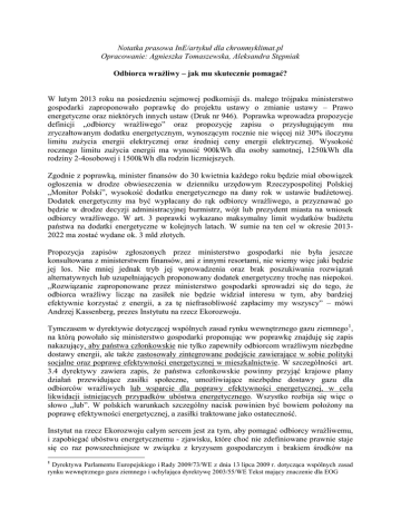 Notatka prasowa InE/artykuł dla chronmyklimat.pl Opracowanie: Agnieszka Tomaszewska, Aleksandra Stępniak Odbiorca wrażliwy – jak mu skutecznie pomagać? W lutym 2013 roku na posiedzeniu sejmowej podkomisji ds. małego trójpaku ministerstwo gospodarki zaproponowało poprawkę do projektu ustawy o zmianie ustawy – Prawo energetyczne oraz niektórych innych ustaw (Druk nr 946). Poprawka wprowadza propozycje definicji „odbiorcy wrażliwego” oraz propozycję zapisu o przysługującym mu zryczałtowanym dodatku energetycznym, wynoszącym rocznie nie więcej niż 30% iloczynu limitu zużycia energii elektrycznej oraz średniej ceny energii elektrycznej. Wysokość rocznego limitu zużycia energii ma wynosić 900kWh dla osoby samotnej, 1250kWh dla rodziny 2-4osobowej i 1500kWh dla rodzin liczniejszych. Zgodnie z poprawką, minister finansów do 30 kwietnia każdego roku będzie miał obowiązek ogłoszenia w drodze obwieszczenia w dzienniku urzędowym Rzeczypospolitej Polskiej „Monitor Polski”, wysokość dodatku energetycznego na dany rok w ustawie budżetowej. Dodatek energetyczny ma być wypłacany do rąk odbiorcy wrażliwego, a przyznawać go będzie w drodze decyzji administracyjnej burmistrz, wójt lub prezydent miasta na wniosek odbiorcy wrażliwego. W art. 3 poprawki wykazano maksymalny limit wydatków budżetu państwa na dodatki energetyczne w kolejnych latach. W sumie na ten cel w okresie 20132022 ma zostać wydane ok. 3 mld złotych. Propozycja zapisów zgłoszonych przez ministerstwo gospodarki nie była jeszcze konsultowana z ministerstwem finansów, ani z innymi resortami, nie wiemy więc jaki będzie jej los. Nie mniej jednak tryb jej wprowadzenia oraz brak poszukiwania rozwiązań alternatywnych lub uzupełniających proponowany dodatek energetyczny trochę nas niepokoi. „Rozwiązanie zaproponowane przez ministerstwo gospodarki sprowadzi się do tego, że odbiorca wrażliwy licząc na zasiłek nie będzie widział interesu w tym, aby bardziej efektywnie korzystać z energii, a za tę niefrasobliwość zapłacimy my wszyscy” – mówi Andrzej Kassenberg, prezes Instytutu na rzecz Ekorozwoju. Tymczasem w dyrektywie dotyczącej wspólnych zasad rynku wewnętrznego gazu ziemnego 1, na którą powołało się ministerstwo gospodarki proponując ww poprawkę znajduję się zapis nakazujący, aby państwa członkowskie nie tylko zapewniły odbiorcom wrażliwym niezbędne dostawy energii, ale także zastosowały zintegrowane podejście zawierające w sobie polityki socjalne oraz poprawę efektywności energetycznej w mieszkalnictwie. W szczególności art. 3.4 dyrektywy zawiera zapis, że państwa członkowskie powinny przyjąć krajowe plany działań przewidujące zasiłki społeczne, umożliwiające niezbędne dostawy gazu dla odbiorców wrażliwych lub wsparcie dla poprawy efektywności energetycznej, w celu likwidacji istniejących przypadków ubóstwa energetycznego. Wszystko rozbija się więc o słowo „lub”. W polskich warunkach szczególny nacisk powinien być bowiem położony na poprawę efektywności energetycznej, a zasiłki traktowane jako ostateczność. Instytut na rzecz Ekorozwoju całym sercem jest za tym, aby pomagać odbiorcy wrażliwemu, i zapobiegać ubóstwu energetycznemu - zjawisku, które choć nie zdefiniowane prawnie staje się co raz powszechniejsze w związku z kryzysem gospodarczym i brakiem środków na 1 Dyrektywa Parlamentu Europejskiego i Rady 2009/73/WE z dnia 13 lipca 2009 r. dotycząca wspólnych zasad rynku wewnętrznego gazu ziemnego i uchylająca dyrektywę 2003/55/WE Tekst mający znaczenie dla EOG opłaty za energię. „Chcielibyśmy jednak, aby pomoc udzielana przez państwo miała charakter bardziej kompleksowy i strategiczny oraz wiązała się z poprawą efektywności energetycznej budynków zamieszkiwanych przez odbiorców wrażliwych. Tego typu programy realizowane są w innych krajach z korzyścią nie tylko dla odbiorcy wrażliwego, ale też dla całego społeczeństwa, o czym piszemy w naszej najnowszej analizie pt. „Ubóstwo energetyczne a efektywność energetyczna - analiza problemu i rekomendacje” – mówi Agnieszka Tomaszewska z Instytut na rzecz Ekorozwoju. Takie programy pomagają likwidować problem w sposób trwały i skuteczny a nie tylko doraźnie. Walka z ubóstwem energetycznym poprzez poprawę efektywności energetycznej, którą promuje Instytut na rzecz Ekorozwoju, może przynieść szereg długofalowych korzyści nie tylko społecznych ale też gospodarczych. Może on m.in. dać impuls na rynku budowlanym, gdzie w ostatnim czasie wiele firm upadło z powodu braku nowych kontraktów. Firmy te tymczasem mogłyby się zająć termomodernizacją. Takie podejście sprzyjałoby także tworzeniu lokalnych miejsc pracy i nowej oferty usług adresowanych do gospodarstw domowych w postaci doradztwa energetycznego, czy wymiany i montażu bardziej efektywnego energetycznie sprzętu, systemu ogrzewania czy urządzeń do kontroli zużycia energii. Co ważne, takie programy pomagają likwidować problem ubóstwa energetycznego w sposób trwały i skuteczny, bo to leży w interesie państwa, a nie tylko doraźnie, bo „dyrektywa nakazuje coś z tym problemem zrobić”.