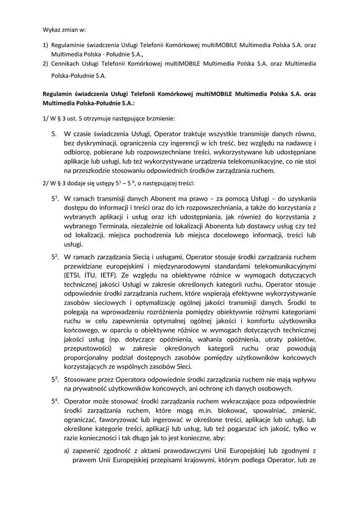 Wykaz zmian w: 1) Regulaminie świadczenia Usługi Telefonii Komórkowej multiMOBILE Multimedia Polska S.A. oraz Multimedia Polska - Południe S.A., 2) Cennikach Usługi Telefonii Komórkowej multiMOBILE Multimedia Polska S.A. oraz Multimedia Polska-Południe S.A. Regulamin świadczenia Usługi Telefonii Komórkowej multiMOBILE Multimedia Polska S.A. oraz Multimedia Polska-Południe S.A.: 1/ W § 3 ust. 5 otrzymuje następujące brzmienie: 5. W czasie świadczenia Usługi, Operator traktuje wszystkie transmisje danych równo, bez dyskryminacji, ograniczenia czy ingerencji w ich treść, bez względu na nadawcę i odbiorcę, pobierane lub rozpowszechniane treści, wykorzystywane lub udostępniane aplikacje lub usługi, lub też wykorzystywane urządzenia telekomunikacyjne, co nie stoi na przeszkodzie stosowaniu odpowiednich środków zarządzania ruchem. 2/ W § 3 dodaje się ustępy 51 – 5 6, o następującej treści: 51. W ramach transmisji danych Abonent ma prawo – za pomocą Usługi – do uzyskania dostępu do informacji i treści oraz do ich rozpowszechniania, a także do korzystania z wybranych aplikacji i usług oraz ich udostępniania, jak również do korzystania z wybranego Terminala, niezależnie od lokalizacji Abonenta lub dostawcy usług czy też od lokalizacji, miejsca pochodzenia lub miejsca docelowego informacji, treści lub usługi. 52. W ramach zarządzania Siecią i usługami, Operator stosuje środki zarządzania ruchem przewidziane europejskimi i międzynarodowymi standardami telekomunikacyjnymi (ETSI, ITU, IETF). Ze względu na obiektywne różnice w wymogach dotyczących technicznej jakości Usługi w zakresie określonych kategorii ruchu, Operator stosuje odpowiednie środki zarządzania ruchem, które wspierają efektywne wykorzystywanie zasobów sieciowych i optymalizację ogólnej jakości transmisji danych. Środki te polegają na wprowadzeniu rozróżnienia pomiędzy obiektywnie różnymi kategoriami ruchu w celu zapewnienia optymalnej ogólnej jakości i komfortu użytkownika końcowego, w oparciu o obiektywne różnice w wymogach dotyczących technicznej jakości usług (np. dotyczące opóźnienia, wahania opóźnienia, utraty pakietów, przepustowości) w zakresie określonych kategorii ruchu oraz powodują proporcjonalny podział dostępnych zasobów pomiędzy użytkowników końcowych korzystających ze wspólnych zasobów Sieci. 53. Stosowane przez Operatora odpowiednie środki zarządzania ruchem nie mają wpływu na prywatność użytkowników końcowych, ani ochronę ich danych osobowych. 54. Operator może stosować środki zarządzania ruchem wykraczające poza odpowiednie środki zarządzania ruchem, które mogą m.in. blokować, spowalniać, zmienić, ograniczać, faworyzować lub ingerować w określone treści, aplikacje lub usługi, lub określone kategorie treści, aplikacji lub usług, lub też pogarszać ich jakość, tylko w razie konieczności i tak długo jak to jest konieczne, aby: a) zapewnić zgodność z aktami prawodawczymi Unii Europejskiej lub zgodnymi z prawem Unii Europejskiej przepisami krajowymi, którym podlega Operator, lub ze zgodnymi z prawem Unii Europejskiej środkami służącymi wykonaniu takich aktów prawodawczych Unii Europejskiej lub przepisów krajowych, w tym z orzeczeniami sądowymi lub decyzjami organów publicznych dysponujących odpowiednimi uprawnieniami, b) utrzymać integralność i bezpieczeństwo Sieci, usług świadczonych za pośrednictwem Sieci oraz urządzeń końcowych użytkowników końcowych, c) zapobiec grożącym przeciążeniom Sieci oraz łagodzić skutki wyjątkowego lub tymczasowego przeciążenia Sieci, o ile równoważne rodzaje transferu danych są traktowane równo. 55. Stałe lub regularnie powtarzające się istotne rozbieżności pomiędzy faktycznym wykonaniem Usługi w zakresie transmisji danych pod względem prędkości lub innych parametrów jakości Usługi, a wykonaniem opisanym w ust. 5 – 54 powyżej i ust. 151 – 154 poniżej, ustalone przy pomocy mechanizmu monitorowania certyfikowanego przez Prezesa Urzędu Komunikacji Elektronicznej, stanowią nienależyte wykonanie Umowy Abonenckiej zawartej z konsumentem. 6 5 .W przypadkach stałych lub regularnie powtarzających się rozbieżności pomiędzy faktycznym wykonaniem Usługi w zakresie transmisji danych pod względem prędkości lub innych parametrów jakości Usługi, a wykonaniem opisanym w ust. 5 – 54 powyżej i ust. 151 – 154 poniżej, Abonentowi będącemu konsumentem przysługują środki ochrony prawnej opisane w § 17 oraz § 16 ust.18 niniejszego Regulaminu. 3/ W § 3 dodaje się ustępy 151 – 154 , o następującej treści: 151. Operator w Cenniku lub w Umowie Abonenckiej określa szacunkowe maksymalne prędkości pobierania i wysłania danych w zakresie usługi transmisji danych. 152 Rzeczywista osiągalna prędkość pobierania i wysłania danych zależy od wielu czynników, w tym od wykorzystywanego Terminala, jego kategorii i oprogramowania, w tym działających aplikacji, wykorzystywanej technologii sieciowej, siły i jakości sygnału radiowego, odległości od stacji bazowej, czynników wpływających na propagację fal radiowych (takich jak uwarunkowania geograficzne, urbanistyczne, atmosferyczne, struktury i tłumienności materiałów budowlanych użytych do konstrukcji budynku), ilości i aktywności innych użytkowników końcowych obsługiwanych przez poszczególne stacje bazowe, rodzaju wykorzystywanej Karty SIM. Na niektórych obszarach Polski dostępne są tylko wybrane technologie sieciowe, a zatem parametry Usługi mogą być różne w zależności od miejsca korzystania z tej Usługi. 153 Limity ilości danych, ograniczenia prędkości oraz inne parametry jakości Usługi (takie jak opóźnienie, wahanie opóźnienia, utrata pakietów), mogą wpływać na jakość Usługi w zakresie transmisji danych poprzez spowolnienie wysyłania lub odbierania danych lub ograniczenie dostępnoś