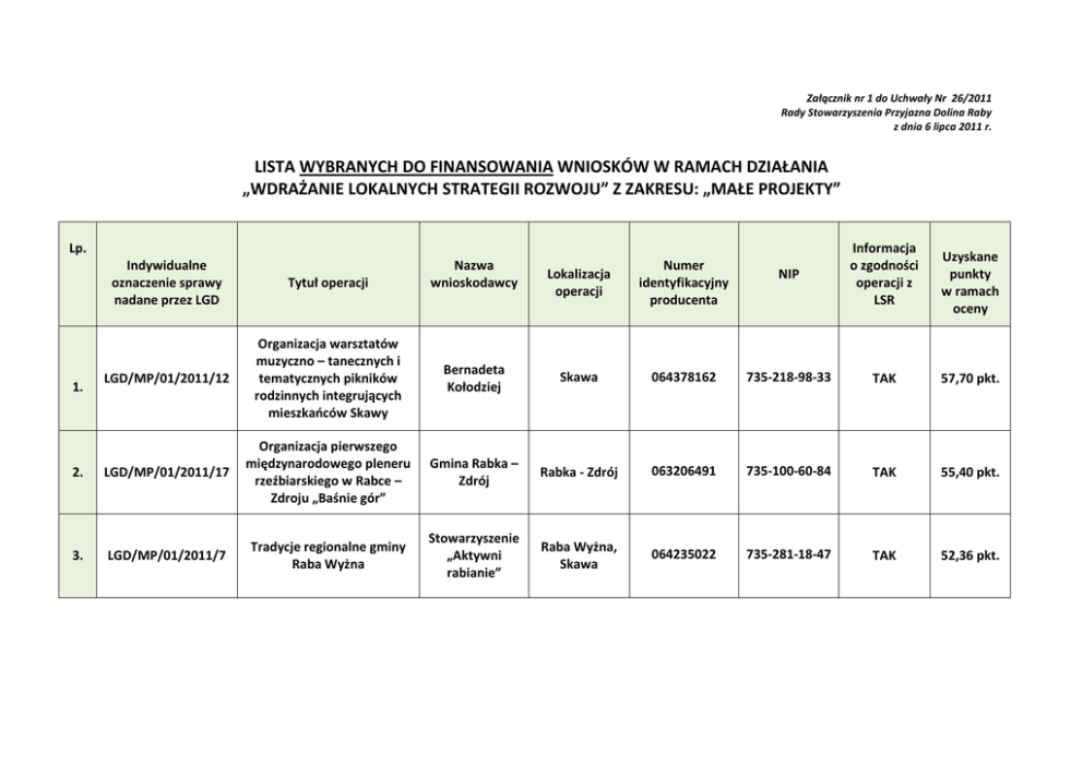 Załącznik nr 1 do Uchwały Nr 26/2011 Rady Stowarzyszenia Przyjazna Dolina Raby z dnia 6 lipca 2011 r. LISTA WYBRANYCH DO FINANSOWANIA WNIOSKÓW W RAMACH DZIAŁANIA „WDRAŻANIE LOKALNYCH STRATEGII ROZWOJU” Z ZAKRESU: „MAŁE PROJEKTY” Lp. Indywidualne oznaczenie sprawy nadane przez LGD Tytuł operacji LGD/MP/01/2011/12 Organizacja warsztatów muzyczno – tanecznych i tematycznych pikników rodzinnych integrujących mieszkaoców Skawy 2. 3. 1. Nazwa wnioskodawcy NIP Informacja o zgodności operacji z LSR 064378162 735-218-98-33 TAK 57,70 pkt. Rabka - Zdrój 063206491 735-100-60-84 TAK 55,40 pkt. Raba Wyżna, Skawa 064235022 735-281-18-47 TAK 52,36 pkt. Lokalizacja operacji Numer identyfikacyjny producenta Bernadeta Kołodziej Skawa LGD/MP/01/2011/17 Organizacja pierwszego międzynarodowego pleneru rzeźbiarskiego w Rabce – Zdroju „Baśnie gór” Gmina Rabka – Zdrój LGD/MP/01/2011/7 Tradycje regionalne gminy Raba Wyżna Stowarzyszenie „Aktywni rabianie” Uzyskane punkty w ramach oceny 4. LGD/MP/01/2011/15 5. LGD/MP/01/2011/13 6. LGD/MP/01/2011/6 7. 8. 9. LGD/MP/01/2011/11 LGD/MP/01/2011/19 LGD/MP/01/2011/1 Regionalna pracownia stolarsko – rzeźbiarska „ZELEŹNIOK” Rozwijanie aktywności dzieci i młodzieży ze Skawy poprzez organizację warsztatów muzycznych i przeciw-pożarniczych Wykonanie regionalnego budynku i ogrodzenia oraz renowacja drewnianej figury św. Ambrożego na potrzeby istniejącej odrestaurowanej pasieki pszczelarskiej w Spytkowicach Promocja lokalnej twórczości regionalnej poprzez wydanie płyty CD z pieśniami ze Spytkowic i okolicy Geolokalizacyjny Portal Turystyczny i sied szlaków na terenie LGD „Przyjazna Dolina Raby” Do Taoca – Do Różaoca – dwuksiąg poezji góralskiej Marcin Czyszczoo Ponice, Rabka - Zdrój 065152634 735-277-29-17 TAK 52,18 pkt. Ochotnicza Straż Pożarna w Skawie Skawa 064570312 735-227-13-97 TAK 51,09 pkt. Gmina Spytkowice Spytkowice 062726270 735-270-31-93 TAK 51,00 pkt. Związek Podhalan w Ludźmierzu Rabka – Zdrój, Spytkowice 063867142 735-100-19-39 TAK 50,20 pkt. Stowarzyszenie Promocji Kultury i Edukacji „RABKON” Raba Wyżna, Chabówka, Rabka – Zdrój, Spytkowice 064830855 735-280-76-56 TAK 50,00 pkt. Izabela Zając Bielanka, Bukowina Osiedle, Harkabuz, Podsarnie, 064518016 735-140-13-43 TAK 49,27 pkt. Raba Wyżna, Rokiciny Podhalaoskie, Sieniawa, Skawa, Rabka – Zdrój, Spytkowice 10. 11. 12. 13. LGD/MP/01/2011/18 Wypożyczalnia sprzętu rowerowego na terenie Rabki - Zdroju Stowarzyszenie Promocji Kultury i Edukacji „RABKON” Rabka – Zdrój 064830855 735-280-76-56 TAK 49,00 pkt. LGD/MP/01/2011/5 Budowa małej infrastruktury turystycznej i rekreacyjnej poprzez zagospodarowanie terenu w plac zabaw, w celu stworzenia i rozwoju miejsc wypoczynkowych Gmina Raba Wyżna Bielanka 063172762 735-104-44-17 TAK 48,25 pkt. LGD/MP/01/2011/9 Święto bez granic Gminny Ośrodek Kultury w Rabie Wyżnej Raba Wyżna 063173816 735-185-36-48 TAK 47,91 pkt. LGD/MP/01/2011/3 Zakup instrumentów muzycznych w celu promocji lokalnej twórczości kulturalnej reprezentowanej przez Orkiestrę Dętą w Rabie Wyżnej Ochotnicza Straż Pożarna w Rabie Wyżnej Raba Wyżna 065706822 735-238-17-37 TAK 46,09 pkt. LGD/MP/01/2011/2 Bieg na Stare Wierchy POLSKI KLUB ADVENTURE RACING Rabka - Zdrój 065232471 583-298-95-73 TAK 44,64 pkt. LGD/MP/01/2011/4 Wydanie Słownika Biograficznego Rabki Miejski Ośrodek Kultury w Rabce - Zdroju Rabka - Zdrój 065658523 735-100-51-91 TAK 44,00 pkt. LGD/MP/01/2011/16 Promocja i kultywowanie lokalnej twórczości muzycznej poprzez nagranie płyty demo oraz utworzenie strony www. poświęconej muzyce Paweł Pietraszek Skawa 064986284 735-244-71-52 TAK 44,00 pkt. 17. LGD/MP/01/2011/10 Wyposażenie świetlicy przy OSP Ochotnicza Straż Pożarna w Rokicinach Podhalaoskich Rokiciny Podhalaoskie 065705934 735-228-20-18 TAK 43,81 pkt. 18. LGD/MP/01/2011/14 Baza noclegowo informacyjna Jan Świder Ponice, Rabka - Zdrój 063818272 736-116-73-38 TAK 43,70 pkt. LGD/MP/01/2011/8 Budowa stawu rybnego w gospodarstwie agroturystycznym Anna Filas Ponice 054185832 735-109-16-70 TAK 42,00 pkt. 14. 15. 16. 19.