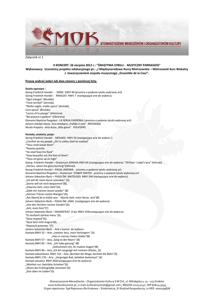 Załącznik nr 1 II KONCERT: 26 sierpnia 2012 r.: ”ŚWIĄTYNIA SYBILLI - MUZYCZNY PARNASSOS” Wykonawcy: Uczestnicy projektu edukacyjnego pt.: „I Międzynarodowe Kursy Mistrzowskie – Mistrzowski Kurs Wokalny z towarzyszeniem zespołu muzycznego „Ensamble de la Cour”. Proszę wybrać jeden lub dwa utwory z poniższej listy. Dzieła operowe : Georg Friedrich Handel - SERSE HWV 40 (prosimy o podanie tytułu wybranej arii) Georg Friedrich Handel - RINALDO HWV 7 (następujące arie do wyboru): “Ogni indugio” (Rinaldo) “Furie terribili” (Armida) “Molto voglio, molto spero“ (Armida) Cara sposa” (Rinaldo) “Lascia ch'io pianga” (Almirena) “Bel piacere e godere” (Almirena) Giovanni Baptista Pergolesi - LA SERVA PADRONA ( prosimy o podanie tytułu wybranej arii) Johann Adolph Hasse -Aria Artabano „Pallido il sole” ARTASERSE Nicolo Porpora - Aria Acisa „Alto giove” POLIFEMO Kantaty ,oratoria, pasje: Georg Friedrich Handel - MESJASZ HWV 56 (następujące arie do wyboru ): „Comfort ye my people „/Ev’ry valley shall be exalted” ”Thou shalt break them” “Reyoice greatly ”He shall feed His flock” “How beautiful are the feet of them” “Thou art gone up on high” Georg Friedrich Handel – Oratorium JOSHUA HWV 64 (następujące arie do wyboru): “Oh!had I Jubal’s lyre” (Achsah) „Heroes, when the glory burning”(Othniel) Georg Friedrich Handel – PASJA JANOWA - prosimy o podanie tytułu wybranej arii Giovanni Baptista Pergolesi – Oratorium STABAT MATER - prosimy o podanie tytułu wybranej arii Johann Sebastian Bach – PASJA ŚW. MATEUSZA BWV 244 (następujące arie do wyboru): „Ich will dir mein Herze schenken“ (S), „Gerne will ich mich bequemen“(B), „Erbarme dich, mein Gott“(A), „Gebt mir meinen Jesum wieder“ (B) „Können Tränen meine Wangen“(A), „Am Abend da es kühle war - Mache dich, mein Herze, rein“(B) Johann Sebastian Bach – PASJA ŚW. JANA (następujące arie do wyboru): „Von den Stricken meiner Sünden“(A) „Ach, mein Sinn“(T) Johann Sebastian Bach – MAGNIFIKAT D dur BWV 243(następujące arie do wyboru): “Et exultavit spiritus meus ‘(S), “Quia respexit”(S), “Quia fecit mihi magna’(B), “Deposuit potentes “(T) Johann Sebastian Bach - Arie z kantat do wyboru: Kantata BWV 32 – Arie „Liebster Jesu, mein Verlangern“ (S) „Hier,in meines Vaters Stätte“(B) Kantata BWV 57 – Aria „Selig ist der Mann“ (B) Kantata BWV 82 – Arie „Ich habe genung” (B) „Schlummert ein, ihr matten Augen“(B) Kantata BWV 84 – Aria „Ich bin vergnügt mit meinem Glücke„ (S) Kantata adwentowa BWV 132 – Aria „Bereitet die Wege, bereitet die Bahn“(S) Kantata BWV 170 – Aria „Vergnügte Ruh, beliebte Seelenlust“ (A) Kantata weselna BWV 202(następujące arie do wyboru): „Weichet nur, betrübte Schatten“(S) „Wenn die Frühlingslüfte streichen“(S) „Sich üben im Lieben“(S) Stowarzyszenie Menedżerów i Organizatorów Kultury S M O K, ul. Mikołajska 2, 31 – 027 Kraków www.kulturalnysmok.pl ; e-mail: [email protected] ; REGON 121241247 ; NIP 6762423133 Organ rejestrowy: Sąd Rejonowy dla Krakowa – Śródmieścia, XI Wydział Gospodarczy, nr KRS 0000299878
