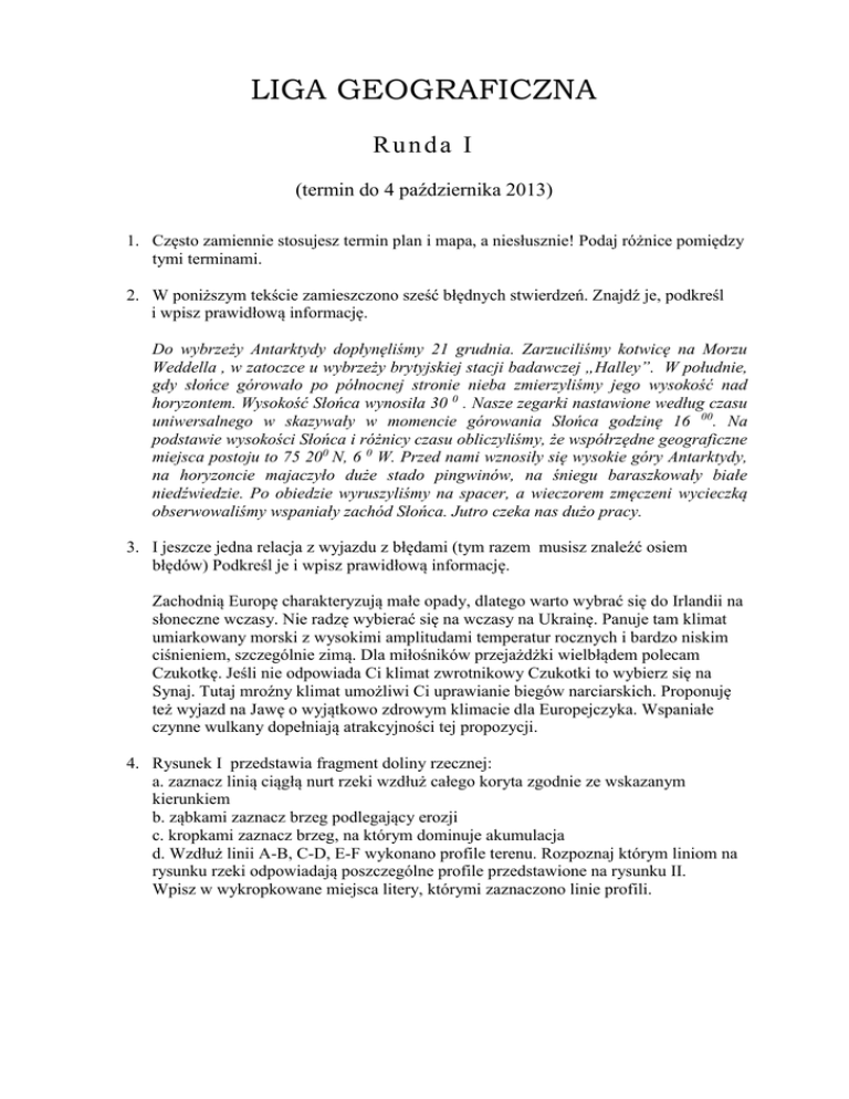 LIGA GEOGRAFICZNA Runda I (termin do 4 października 2013) 1. Często zamiennie stosujesz termin plan i mapa, a niesłusznie! Podaj różnice pomiędzy tymi terminami. 2. W poniższym tekście zamieszczono sześć błędnych stwierdzeń. Znajdź je, podkreśl i wpisz prawidłową informację. Do wybrzeży Antarktydy dopłynęliśmy 21 grudnia. Zarzuciliśmy kotwicę na Morzu Weddella , w zatoczce u wybrzeży brytyjskiej stacji badawczej „Halley”. W południe, gdy słońce górowało po północnej stronie nieba zmierzyliśmy jego wysokość nad horyzontem. Wysokość Słońca wynosiła 30 0 . Nasze zegarki nastawione według czasu uniwersalnego w skazywały w momencie górowania Słońca godzinę 16 00. Na podstawie wysokości Słońca i różnicy czasu obliczyliśmy, że współrzędne geograficzne miejsca postoju to 75 200 N, 6 0 W. Przed nami wznosiły się wysokie góry Antarktydy, na horyzoncie majaczyło duże stado pingwinów, na śniegu baraszkowały białe niedźwiedzie. Po obiedzie wyruszyliśmy na spacer, a wieczorem zmęczeni wycieczką obserwowaliśmy wspaniały zachód Słońca. Jutro czeka nas dużo pracy. 3. I jeszcze jedna relacja z wyjazdu z błędami (tym razem musisz znaleźć osiem błędów) Podkreśl je i wpisz prawidłową informację. Zachodnią Europę charakteryzują małe opady, dlatego warto wybrać się do Irlandii na słoneczne wczasy. Nie radzę wybierać się na wczasy na Ukrainę. Panuje tam klimat umiarkowany morski z wysokimi amplitudami temperatur rocznych i bardzo niskim ciśnieniem, szczególnie zimą. Dla miłośników przejażdżki wielbłądem polecam Czukotkę. Jeśli nie odpowiada Ci klimat zwrotnikowy Czukotki to wybierz się na Synaj. Tutaj mroźny klimat umożliwi Ci uprawianie biegów narciarskich. Proponuję też wyjazd na Jawę o wyjątkowo zdrowym klimacie dla Europejczyka. Wspaniałe czynne wulkany dopełniają atrakcyjności tej propozycji. 4. Rysunek I przedstawia fragment doliny rzecznej: a. zaznacz linią ciągłą nurt rzeki wzdłuż całego koryta zgodnie ze wskazanym kierunkiem b. ząbkami zaznacz brzeg podlegający erozji c. kropkami zaznacz brzeg, na którym dominuje akumulacja d. Wzdłuż linii A-B, C-D, E-F wykonano profile terenu. Rozpoznaj którym liniom na rysunku rzeki odpowiadają poszczególne profile przedstawione na rysunku II. Wpisz w wykropkowane miejsca litery, którymi zaznaczono linie profili. Rysunek I Rysunek II