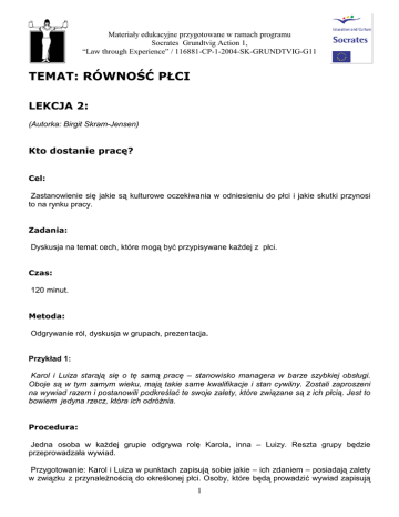 Materiały edukacyjne przygotowane w ramach programu Socrates Grundtvig Action 1, “Law through Experience” / 116881-CP-1-2004-SK-GRUNDTVIG-G11 TEMAT: RÓWNOŚĆ PŁCI LEKCJA 2: (Autorka: Birgit Skram-Jensen) Kto dostanie pracę? Cel: Zastanowienie się jakie są kulturowe oczekiwania w odniesieniu do płci i jakie skutki przynosi to na rynku pracy. Zadania: Dyskusja na temat cech, które mogą być przypisywane kaŜdej z płci. Czas: 120 minut. Metoda: Odgrywanie ról, dyskusja w grupach, prezentacja. Przykład 1: Karol i Luiza starają się o tę samą pracę – stanowisko managera w barze szybkiej obsługi. Oboje są w tym samym wieku, mają takie same kwalifikacje i stan cywilny. Zostali zaproszeni na wywiad razem i postanowili podkreślać te swoje zalety, które związane są z ich płcią. Jest to bowiem jedyna rzecz, która ich odróŜnia. Procedura: Jedna osoba w kaŜdej grupie odgrywa rolę Karola, inna – Luizy. Reszta grupy będzie przeprowadzała wywiad. Przygotowanie: Karol i Luiza w punktach zapisują sobie jakie – ich zdaniem – posiadają zalety w związku z przynaleŜnością do określonej płci. Osoby, które będą prowadzić wywiad zapisują 1 pytania, które zamierzają zadać aplikantom. Ich zadaniem jest skupić się na tych codziennych sytuacjach w pracy, gdzie płeć moŜe być dodatkowym atutem albo przeszkodą. Po wywiadzie Karol i Luiza wychodzą z sali. Pozostała część grupy decyduje które z nich dostanie pracę. Decyzję podejmują w oparciu o to, kto bardziej przekonywująco przedstawił swoje atuty. Cała grupa/klasa omawia wspólnie, jakie role i cechy dotyczące płci zostały przedstawione podczas wywiadu. Przykład 2: Karol i Luiza dostają zaproszenie z lokalnej telewizji na dyskusję panelową dotyczącą włączania problematyki płci do głównego nurtu polityki (gender mainstreming). KaŜde z nich ma przedstawić przed kamerami swój pogląd na ten temat. Mają powiedzieć czy ich zdaniem jest sens, dawać kobietom pierwszeństwo przy przyjmowaniu do pracy w zawodach zdominowanych przez męŜczyzn. Procedura: Role Karola i Luizy mogą być odgrywane przez te same lub nowe osoby. Wybierana jest teŜ osoba, która będzie prowadziła dyskusję. Reszta grupy wystąpi w roli uczestników debaty. Prowadzący udziela głosu osobom, które się zgłosiły. MoŜe teŜ zapisywać róŜne opinie wyraŜone podczas dyskusji. Przygotowanie: Karol i Luiza przygotowują osobno krótkie wystąpienia w oparciu o doświadczenie wyniesione z wywiadu o pracę. Reszta uczestników przygotowuje pytania, które zamierza zadać podczas debaty. Mogą się one opierać na następujących zagadnieniach? Dlaczego na stanowiskach managerskich jest więcej męŜczyzn niŜ kobiet? Jakie znaczenie dla kariery zawodowej kobiet ma fakt, Ŝe mają przerwę w pracy w okresie urlopu macierzyńskiego? Dlaczego większość męŜczyzn niechętnie prosi o zwolnienie w związku z narodzinami ich dziecka? Czy są jakieś zawody, których kobietom nie zezwala się wykonywać ze względu na ich płeć? Jakie problemy mogą się pojawić w chwili, gdy męŜczyzna podejmuje pracę uznaną za typowo kobiecą, lub odwrotnie? Czy moŜna realizować równe prawa poprzez przyznanie kobietom pierwszeństwa na określonych stanowiskach? Na końcu dyskusji osoba prowadząca podsumowuje, jakie stanowiska zostały przedstawione w trakcie jej trwania. 2