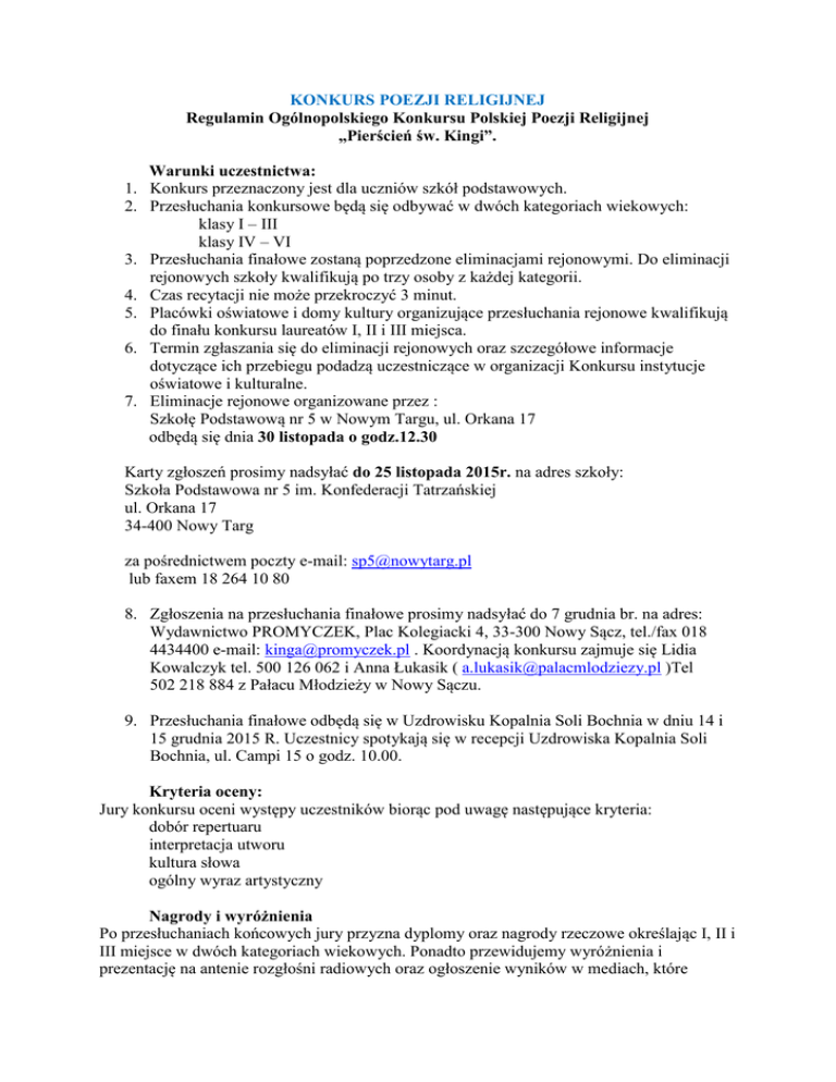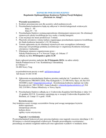 KONKURS POEZJI RELIGIJNEJ Regulamin Ogólnopolskiego Konkursu Polskiej Poezji Religijnej „Pierścień św. Kingi”. Warunki uczestnictwa: 1. Konkurs przeznaczony jest dla uczniów szkół podstawowych. 2. Przesłuchania konkursowe będą się odbywać w dwóch kategoriach wiekowych: klasy I – III klasy IV – VI 3. Przesłuchania finałowe zostaną poprzedzone eliminacjami rejonowymi. Do eliminacji rejonowych szkoły kwalifikują po trzy osoby z każdej kategorii. 4. Czas recytacji nie może przekroczyć 3 minut. 5. Placówki oświatowe i domy kultury organizujące przesłuchania rejonowe kwalifikują do finału konkursu laureatów I, II i III miejsca. 6. Termin zgłaszania się do eliminacji rejonowych oraz szczegółowe informacje dotyczące ich przebiegu podadzą uczestniczące w organizacji Konkursu instytucje oświatowe i kulturalne. 7. Eliminacje rejonowe organizowane przez : Szkołę Podstawową nr 5 w Nowym Targu, ul. Orkana 17 odbędą się dnia 30 listopada o godz.12.30 Karty zgłoszeń prosimy nadsyłać do 25 listopada 2015r. na adres szkoły: Szkoła Podstawowa nr 5 im. Konfederacji Tatrzańskiej ul. Orkana 17 34-400 Nowy Targ za pośrednictwem poczty e-mail: [email protected] lub faxem 18 264 10 80 8. Zgłoszenia na przesłuchania finałowe prosimy nadsyłać do 7 grudnia br. na adres: Wydawnictwo PROMYCZEK, Plac Kolegiacki 4, 33-300 Nowy Sącz, tel./fax 018 4434400 e-mail: [email protected] . Koordynacją konkursu zajmuje się Lidia Kowalczyk tel. 500 126 062 i Anna Łukasik ( [email protected] )Tel 502 218 884 z Pałacu Młodzieży w Nowy Sączu. 9. Przesłuchania finałowe odbędą się w Uzdrowisku Kopalnia Soli Bochnia w dniu 14 i 15 grudnia 2015 R. Uczestnicy spotykają się w recepcji Uzdrowiska Kopalnia Soli Bochnia, ul. Campi 15 o godz. 10.00. Kryteria oceny: Jury konkursu oceni występy uczestników biorąc pod uwagę następujące kryteria: dobór repertuaru interpretacja utworu kultura słowa ogólny wyraz artystyczny Nagrody i wyróżnienia Po przesłuchaniach końcowych jury przyzna dyplomy oraz nagrody rzeczowe określając I, II i III miejsce w dwóch kategoriach wiekowych. Ponadto przewidujemy wyróżnienia i prezentację na antenie rozgłośni radiowych oraz ogłoszenie wyników w mediach, które przyjęły patronat nad konkursem, a także na stronach internetowych organizatorów. Informacje dla finalistów Koszt pobytu (nocleg, wyżywienie i zwiedzanie Kopalni Soli) od jednej osoby wynosi 100 zł. Organizatorzy dzięki sponsorom i dotacjom pokrywają ponad 60 % kosztów, a pozostałe 40% wpłacają uczestnicy w formie akredytacji w dniu przyjazdu czyli 35 zł – dziecko 50 zł – opiekun Ponadto jako organizatorzy zapraszamy jednego przedstawiciela instytucji koordynujących przesłuchania w rejonach dla którego pobyt jest bezpłatny. Pozostałe uwagi. Pomocą w doborze repertuaru może być książka: „Promyki dobroci i radości – Antologia poezji religijnej dla dzieci” dostępna w księgarniach lub u organizatora tel. 018 4434400, www.sklep.promyczek.pl W publikacji znajdzie się ponad 300 utworów blisko 30 autorów aktualnie piszących dla dzieci. Szanowni Państwo! Gorąco zapraszamy do współpracy przy organizacji Ogólnopolskiego Konkursu Polskiej Poezji Religijnej „Pierścień św. Kingi”. Konkurs pragniemy poprzedzić eliminacjami rejonowymi przeprowadzonymi przez Pałace Młodzieży oraz Domy Kultury na terenie całego kraju. Nasze dwunastoletnie doświadczenie organizacji konkursu w Małopolsce świadczy, że zainteresowanie dzieci poezją jest bardzo duże i nie zabraknie chętnych do udziału w konkursie. Niewątpliwą atrakcją Konkursu jest jego finał, który organizujemy w niezwykłej scenerii Uzdrowiska Kopalni Soli – Bochnia. Uczestnicy finału mogą również liczyć na wiele atrakcji przygotowanych przez organizatorów, m.in. zwiedzanie Kopalni Soli, nocleg 240 metrów pod ziemią oraz warsztaty prowadzone przez znanych aktorów. O honorowy patronat nad Konkursem zostali poproszeni Prezydent Nowego Sącza oraz Burmistrzowie Bochni i Starego Sącza. Organizatorzy: Pałac Młodzieży w Nowym Sączu, Kopalnia Soli - Bochnia Wydawnictwo Diecezji Tarnowskiej PROMYCZEK Patronat medialny: TVP Kraków, Radio RDN Małopolska, Dziennik Polski, Ziemia Bocheńska, Promyczek Dobra. LISTA KOORDYNATORÓW REJONOWYCH OGÓLNOPOLSKIEGO KONKURSU POLSKIEJ POEZJI RELIGIJNEJ „PIERŚCIEŃ ŚW. KINGI” 1. Pałac Młodzieży Nowy Sącz - Lidia Kowalczyk, Anna Łukasik; Rynek 14, 33-300 Nowy Sącz 2. Pałac Młodzieży Tarnów - Renata Małek; ul. Piłsudskiego 24, 33-100 Tarnów 3. Pałac Młodzieży Katowice – Bogumiła Kurcab; ul. Mikołowska 26, 40-226 Katowice 4. Młodzieżowy Dom Kultury Gorlice - Tomasz Kubala; dyrektor , 38- 300 Gorlice, Rynek 11 5. Młodzieżowy Dom Kultury przy Al. 29listopada 102Kraków – Joanna Stachowicz al. 29 Listopada 100 i 102,31 – 406 Kraków 6. Młodzieżowy Dom Kultury nr 1 Bytom - Agnieszka Szymańska; ul. Powstańców Warszawskich 12, 41-902 Bytom 7. Powiatowy Młodzieżowy Dom Kultury Trzebinia – Agnieszka Niemiec- Kłaput ; ul. Kościuszki 70, 32-540 Trzebinia 8. SP nr 7 Bochnia – Alicja Świątek; ul. Jakubowskiego 12, 32-700 Bochnia 9. Zespół Szkół Publicznych Łaszczówka – Teresa Gawęda; Spółdzielcza 2; 22-600 Tomaszów Lubelski 10. Młodzieżowy Dom Kultury Oświęcim - Bogumiła Goryczka ; dyrektor, ul. Olszewskiego 1, 32-602 Oświęcim 11. SP Dziekanowice - Alina Windak; Dziekanowice 66; 32-410 Dobczyce 12. Publiczna SP nr 9 im. Dębickich Saperów - ul. Grottgera 3, 39-200 Dębica 13. Szkoła Podstawowa nr 5 Nowy Targ – Alicja Gruszka; Szkoła Podstawowa Nr 5 im. Konfederacji Tatrzańskiej w Nowym Targu ul. Orkana 17, 34-400 Nowy Targ 14. Szkoła Podstawowa nr 15 Rzeszów- Renata Kędzierska, Dyrektor; ul. Budziwojska 154, 35-317 Rzeszów KONKURS SZOPEK Regulamin XIX GMINNEGO KONKURSU SZOPEK ROGOŹNIK 17 GRUDNIA 2015 R. ORGANIZATORZY: Szkoła Podstawowa im. ks. prof. J