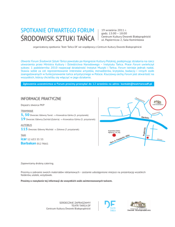 19 września 2011 r. godz. 13:00 – 18:00 Centrum Kultury Dworek Białoprądnicki ul. Papiernicza 2, Sala Kominkowa organizatorzy spotkania: Teatr Tańca DF we współpracy z Centrum Kultury Dworek Białoprądnicki Otwarte Forum Środowisk Sztuki Tańca powstało po Kongresie Kultury Polskiej, podejmując działania na rzecz utworzenia przez Ministra Kultury i Dziedzictwa Narodowego – Instytutu Tańca. Prace Forum uwieńczył sukces: 1 października 2010 rozpoczął działalność Instytut Muzyki i Tańca. Forum istnieje jednak nadal. Stawia sobie za cel reprezentowanie interesów artystów, menadżerów, krytyków, badaczy i innych osób zaangażowanych w funkcjonowanie tańca artystycznego w Polsce. Kluczową cechą Forum jest otwartość na wszystkich, którzy chcieliby się włączyć w jego działanie. Zgłoszenia uczestnictwa w Forum prosimy przesyłać do 12 września na adres: [email protected] INFORMACJE PRAKTYCZNE Bia łop rąd nic ka Dojazd z dworca PKP TRAMWAJE a rnicz Papie 5, 50 Dworzec Główny Tunel → Krowodrza Górka (5. przystanek) 19 Dworzec Główny Zachód (Galeria) → Krowodrza Górka (5. przystanek) Opolska 115 Dworzec Główny Wschód → Zdrowa (7. przystanek) Krowodrza Górka PĘTLA (5, 19, 50) TAXI icar 12 653 55 55 Barbakan 012 9661 . Gen A. F Nila rfa– o ield Prądnicka AUTOBUS Zapewniamy drobny catering. Prosimy o zabranie swoich materiałów reklamowych – zostanie udostępnione miejsce na prezentację wszelkich folderów, ulotek, wizytówek. Prosimy o rozsyłanie tej informacji do wszystkich osób zainteresowanych tańcem. SERDECZNIE ZAPRASZAMY! TEATR TAŃCA DF Centrum Kultury Dworek Białoprądnicki 115 Zdrowa