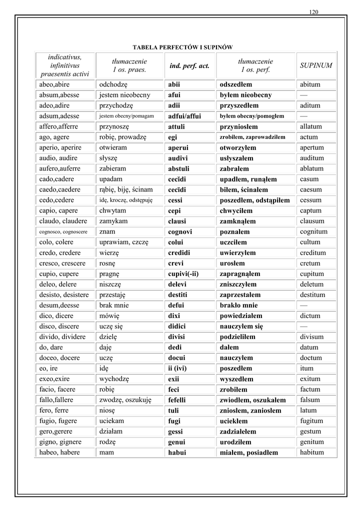 120 TABELA PERFECTÓW I SUPINÓW indicativus, infinitivus praesentis activi abeo,abire absum,abesse adeo,adire adsum,adesse affero,afferre ago, agere aperio, aperire audio, audire aufero,auferre cado,cadere caedo,caedere cedo,cedere capio, capere claudo, claudere cognosco, cognoscere colo, colere credo, credere cresco, crescere cupio, cupere deleo, delere desisto, desistere desum,deesse dico, dicere disco, discere divido, dividere do, dare doceo, docere eo, ire exeo,exire facio, facere fallo,fallere fero, ferre fugio, fugere gero,gerere gigno, gignere habeo, habere tłumaczenie 1 os. praes. odchodzę jestem nieobecny przychodzę jestem obecny/pomagam przynoszę robię, prowadzę otwieram słyszę zabieram upadam rąbię, biję, ścinam idę, kroczę, odstępuję chwytam zamykam znam uprawiam, czczę wierzę rosnę pragnę niszczę przestaję brak mnie mówię uczę się dzielę daję uczę idę wychodzę robię zwodzę, oszukuję niosę uciekam działam rodzę mam ind. perf. act. abii afui adii adfui/affui attuli egi aperui audivi abstuli cecĭdi cecīdi cessi cepi clausi cognovi colui credidi crevi cupivi(-ii) delevi destiti defui dixi didici divisi dedi docui ii (ivi) exii feci fefelli tuli fugi gessi genui habui tłumaczenie 1 os. perf. odszedłem byłem nieobecny przyszedłem byłem obecny/pomogłem przyniosłem zrobiłem, zaprowadziłem otworzyłem usłyszałem zabrałem upadłem, runąłem biłem, ścinałem poszedłem, odstąpiłem chwyciłem zamknąłem poznałem uczciłem uwierzyłem urosłem zapragnąłem zniszczyłem zaprzestałem brakło mnie powiedziałem nauczyłem się podzieliłem dałem nauczyłem poszedłem wyszedłem zrobiłem zwiodłem, oszukałem zniosłem, zaniosłem uciekłem zadziałełem urodziłem miałem, posiadłem SUPINUM abitum — aditum — allatum actum apertum auditum ablatum casum caesum cessum captum clausum cognitum cultum creditum cretum cupitum deletum destitum — dictum — divisum datum doctum itum exitum factum falsum latum fugitum gestum genitum habitum 121 iaceo, iacēre iacio, iacere iubeo, iubere lego, legere malo, malle maneo, manere mitto, mittere moveo, movere noceo, nocere nolo, nolle pando,pandere pango,pangere parco,parcere pario,parere pello, pellere pereo,perire peto, petere pono, ponere possum, posse praesum,praeesse puto, putare quaero, quaerere redeo,redire rego, regere relinquo, relinquere respondeo, respondere scribo, scribere sentio, sentire sino, sinere solvo, solvere specto, spectare spero, sperare sterno,sternere sto, stare sum, esse sumo, sumere tango, tangere teneo, tenere tero,terere timeo, timere leżę rzucam rozkazuję czytam wolę pozostaję posyłam poruszam szkodzę nie chcę rozwijam wbijam, spajam iacui ieci iussi legi malui mansi misi movi nocui nolui pandi oszczędzam, zaniechuję peperci peperi pepuli perii petivi posui potui praefui putavi quaesivi redii rexi reliqui respondi scripsi sensi sivi solvi spectavi speravi stravi steti fui sumpsi tetigi tenui trivi timui wydaję, rodzę uderzam ginę żądam kładę mogę stoję na czele sądzę pytam, proszę wracam kieruje opuszczam odpowiadam piszę czuję pozwalam rozwiązuję oglądam mam nadzieję rozciągać stoję jestem biorę dotykam trzymam trę boję się pepegi /panxi leżałem rzuciłem rozkazałem przeczytałem wolałem pozostałem posłałem poruszyłem zaszkodziłem nie zechciałem rozwinąłem wbiłem, spoiłem oszczędziłem, zaniechałem wydałem, zrodziłem uderzyłem zginąłeś zażądałem położyłem mogłem stanąłem na czele osądziłem zapytałem, poprosiłem wróciłem pokierowałem opuściłem odpowiedziałem napisałem poczułem pozwoliłem rozwiązałem obejrzałem miałem nadzieję rozciągnąłem stanąłem byłem wziąłem dotknąłem (za)trzymałem starłem bałem się — iactum iussum lectum — mansum missum motum nocitum — passum pactum (parsurus) partum pulsum peritum petitum positum — — putatum quaesitum reditum rectum relictum responsum scriptum sensum situm solutum spectatum speratum stratum (staturus) — sumptum tactum — tritum — 122 tollo, tollere traho, trahere uro,urere vado, vadere venio, venire video, videre vinco, vincere vivo, vivere volo, velle biorę ciągnę palę idę przybywam widzę zwyciężam żyję chcę sustuli traxi ussi vasi veni vidi vici vixi volui zabrałem zaciągnąłem spaliłem poszedłem przybyłem zobaczyłem zwyciężyłem przeżyłem zechciałem sublatum tractum ustum (e)vasum ventum visum victum victum — 123 LECTIO SEPTIMA SEPTIMA DECIMA PLUSQUAMPERFECTUM INDICATIVUS PLUSQUAMPERFECTI I FUTURI EXACTI ACTIVI CZAS NA TEMACIE PERFECTI PLUSQUAMPERFECTUM jest czasem zaprzeszłym. Używa się go zwykle dla wyrażenia czynności przeszłej uprzedniej w stosunku do innej czynności przeszłej (wyrażonej przez imperfectum lub perfectum). Np.: Themistocles muros, quos Persae deleverant, restituit. = Temistokles mury, które Persowie zburzyli (byli), odbudował. Stronę czynną tworzymy na bazie TEMATU PERFECTI, dodając bezpośrednio do niego formy czasownika esse w imperfectum (eram, eras, erat, eramus, eratis, erant) Końcówki indicatiwu plusquamperfecti activi sing. pl. 1. - eram - eramus 2. - eras - eratis 3. - erat - erant Zauważ, że jest to odmiana czasownika esse w imperfectum infinitivus perf. act.- isse I laudav1 laudav-eram 2 3 1 2 3 II III IV monumonu-eram mismis-eram audivaudiv-eram pochwaliłem byłem upomniałem byłem posłałem byłem usłyszałem byłem laudav-eras laudav-erat laudav-eramus laudav-eratis laudav-erant monu-eras monu-erat monu-eramus monu-eratis monu-erant mis-eras mis-erat mis-eramus mis-eratis mis-erant audiv-eras audiv-erat audiv-eramus audiv-eratis audiv-erant 124 CZAS NA TEMACIE PERFECTI FUTURUM EXACTUM (II) jest czasem przyszłym uprzednim. Używany jest zwykle dla oznaczenia czynności przyszłej uprzedniej (wcześniejszej) w stosunku do innej czynności przyszłej (wyrażonej przez futurum I). Np.: Ut semetem feceris, ita metes = Jak wykonasz z