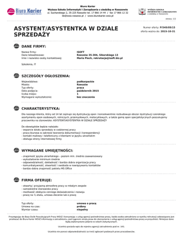 Biuro Karier Wyższa Szkoła Informatyki i Zarządzania z siedzibą w Rzeszowie ul. Sucharskiego 2, 35-225 Rzeszów tel. 17 866 14 44 / fax 17 866 12 32 [email protected] / www.biurokarier.wsiz.pl strona: 1/2 ASYSTENT/ASYSTENTKA W DZIALE SPRZEDAŻY Numer oferty: P/549/09/15 oferta ważna do: 2015-10-31 DANE FIRMY: Nazwa firmy: Dane teleadresowe: Imie i nazwisko osoby kontaktowej: ISOFT Rzeszów 35-304, Sikorskiego 13 Maria Piech, [email protected] Szkolenia, IT SZCZEGÓŁY OGŁOSZENIA: Województwo: Miasto: Typ oferty: Data podjęcia: liczba miejsc: Wymagane wykształcenie: podkarpackie Rzeszów praca październik 2015 1 bez znaczenia CHARAKTERYSTYKA: Dla naszego klienta, który od 14 lat zajmuje się dystrybucją opon i konsekwentnie rozbudowuje obszar dystrybucji szerokiego asortymentu opon osobowych, rolniczych, przemysłowych, motocyklowych, a także gamę opon specjalistycznych poszukujemy pracownika na stanowisko: ASYSTENT/ASYSTENTKA W DZIALE SPRZEDAŻY Do obowiązków będzie należało: - wsparcie działu sprzedaży w codziennej pracy - praca biurowa w zakresie tworzenia dokumentacji i korespondencji - kontakt mailowy i telefoniczny z klientami w języku ukraińskim - obsługa strony internetowej firmy WYMAGANE UMIEJĘTNOŚCI: - znajomość języka ukraińskiego – poziom min. średnio zaawansowany - wykształcenie minimum średnie - odpowiedzialność, dokładność i bardzo dobra organizacja pracy - komunikatywność, otwartość i swoboda w nawiązywaniu kontaktów - bardzo dobra znajomość pakietu MS Office FIRMA OFERUJE: - otwartą i przyjazną atmosferę pracy w młodym zespole - samodzielne stanowisko pracy - możliwość zdobycia cennego doświadczenia i rozwoju - pracę na ½ etatu, umowa zlecenie lub o pracę Typ oferty: Umowa na czas: Wymiar czasu: umowa o pracę próbny niepełny Przystępując do Bazy Osób Poszukujących Pracy WSIiZ i korzystając z usług agencji pośrednictwa pracy, każda osoba zatrudniona w wyniku rekrutacji zobowiązana jest przekazad do Biura Karier WSIiZ informację o zatrudnieniu, pod rygorem utraty praw do skorzystania z usług agencji pośrednictwa pracy w przyszłości. Niniejsze dane będą wykorzystane jedynie w celach statystycznych. Uczelnia posiada wpis do rejestru agencji zatrudnienia pod nr. 141. Uczelnia nie ponosi odpowiedzialności za treśd ogłoszeo podanych przez pracodawców. Biuro Karier Wyższa Szkoła Informatyki i Zarządzania z siedzibą w Rzeszowie ul. Sucharskiego 2, 35-225 Rzeszów tel. 17 866 14 44 / fax 17 866 12 32 [email protected] / www.biurokarier.wsiz.pl strona: 2/2 Wynagrodzenie: Wymagane dokumenty: Gdzie przesłać dokumenty: bd / bd CV [email protected] Przystępując do Bazy Osób Poszukujących Pracy WSIiZ i korzystając z usług agencji pośrednictwa pracy, każda osoba zatrudniona w wyniku rekrutacji zobowiązana jest przekazad do Biura Karier WSIiZ informację o zatrudnieniu, pod rygorem utraty praw do skorzystania z usług agencji pośrednictwa pracy w przyszłości. Niniejsze dane będą wykorzystane jedynie w celach statystycznych. Uczelnia posiada wpis do rejestru agencji zatrudnienia pod nr. 141. Uczelnia nie ponosi odpowiedzialności za treśd ogłoszeo podanych przez pracodawców.