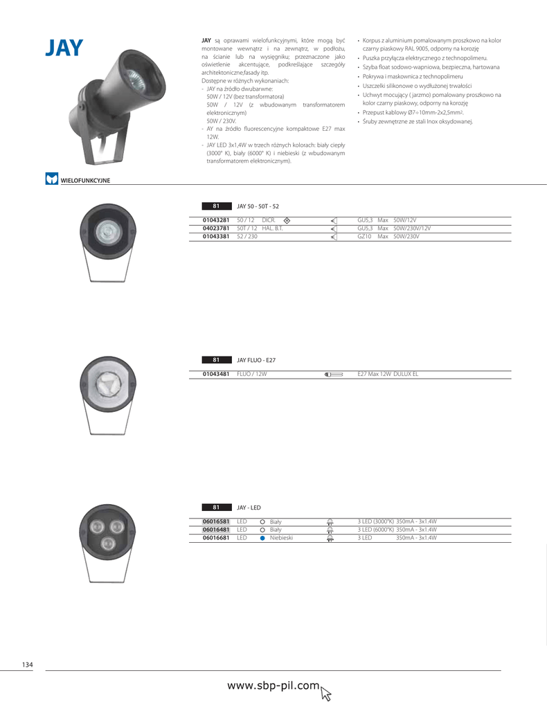 JAY JAY są oprawami wielofunkcyjnymi, które mogą być montowane wewnątrz i na zewnątrz, w podłożu, na ścianie lub na wysięgniku; przeznaczone jako oświetlenie akcentujące, podkreślające szczegóły architektoniczne,fasady itp. Dostępne w różnych wykonaniach: - JAY na źródło dwubarwne: 50W / 12V (bez transformatora) 50W / 12V (z wbudowanym transformatorem elektronicznym) 50W / 230V. - AY na źródło fluorescencyjne kompaktowe E27 max 12W. - JAY LED 3x1,4W w trzech różnych kolorach: biały ciepły (3000° K), biały (6000° K) i niebieski (z wbudowanym transformatorem elektronicznym). t ,PSQVT[BMVNJOJVNQPNBMPXBOZNQSPT[LPXPOBLPMPS czarny piaskowy RAL 9005, odporny na korozję t 1VT[LBQS[ZŕD[BFMFLUSZD[OFHP[UFDIOPQPMJNFSV t Szyba float sodowo-wapniowa, bezpieczna, hartowana t 1PLSZXBJNBTLPXOJDB[UFDIOPQPMJNFSV t 6T[D[FMLJTJMJLPOPXFPXZEVƒPOFKUSXBPžDJ t Uchwyt mocujący ( jarzmo) pomalowany proszkowo na kolor czarny piaskowy, odporny na korozję t 1S[FQVTULBCMPXZNNYNN2. t ĽSVCZ[FXOŢUS[OF[FTUBMJ*OPYPLTZEPXBOFK WIELOFUNKCYJNE 81 01043281 04023781 01043381 81 01043481 81 06016581 06016481 06016681 134 JAY 50 - 50T - 52 50 / 12 DICR. 50T / 12 HAL. B.T. 52 / 230 GU5,3 Max 50W/12V GU5,3 Max 50W/230V/12V GZ10 Max 50W/230V JAY FLUO - E27 FLUO / 12W E27 Max 12W DULUX EL JAY - LED LED LED LED Biały Biały Niebieski 3 LED (3000°K) 350mA - 3x1.4W 3 LED (6000°K) 350mA - 3x1.4W 3 LED 350mA - 3x1.4W max 0,6 kg CLASS II CLASS III IP 65 81 (cod. 01043281) 90 65 ax M LED Max 50W Max 12W Max 1,4W 20 H05RN-F 3G1,5 Ø7 146 201,5 Ø97 107 FB Ø7÷Ø10 ° 116 HR 2x2,5mm2 AKCESORIA A0459 14091981 14092081 14092181 14092202 A0460 A0459 A0460 A0461 A0462 81 81 81 A0461 A0462 Jarzmo 60 cm stalowe, kompletne w bazę z odlewu aluminiowego, pomalowane na kolor czarny piaskowy. Jarzmo 35 cm stalowe, kompletne w bazę z odlewu aluminiowego, pomalowane na kolor czarny piaskowy. Baza z odlewu aluminiowego, pomalowana na kolor czarny piaskowy. 1BMJLQSŢU [PDZOLPXBOFKTUBMJEPNPOUBƒVXQPEPƒV 135 SBP UWAGI NA TEMAT DOBORU I ZASTOSOWANIA PRODUKTÓW SZKLANE ZAMKNIĘCIA Szyby użyte w naszych oprawach są wykonane ze szkła hartowanego „bezpiecznego”, co oznacza, że ich ewentualne uszkodzenie powoduje rozsypanie się szkła na maleńkie fragmenty, które nie powodują zagrożenia dla osób i rzeczy. Szyby są produkowane przez huty szkła o automatycznym procesie produkcyjnym, przy ciągłej kontroli jakości. Przed zamontowaniem w naszych urządzeniach, szyby te są poddawane kolejnej wyrywkowej kontroli przez SBP i testowane na odpowiednią fragmentację przy rozbiciu. Niestety mimo wszystkich wyżej wymienionych zabezpieczeń nie można zupełnie wykluczyć ewentualnego uszkodzenia szyby. W niektórych przypadkach może to nastąpić (procentowo ≤0,3%) w pierwszych godzinach pracy oprawy i należy brać to pod uwagę. Aceton Octan etylowy Kwas arsenowy Kwas octowy ≤30% Kwas bromowy Kwas solny ≤20% Kwas cytrynowy ≤20% Kwas mrówkowy ≤30% Kwas azotowy ≤20% Kwas siarkowy ≤50% Klimat morski Rozpuszczony chlorek sodu Woda utleniona ≤40% Alkohol ≤30% Alkohol etylowy Kwas izopropylowy Amoniak ≤25% Dwutlenek węgla Aminobenzen Benzen Benzyna Keton Chlor (opary) Chloroform Chlorofenol Chlorek metylowy Chlorek wapnia Tempertyna Eter Eter naftowy Fenole Gliceryna Tłuszcze zwierzęce Tłuszcze roślinne Ług syntetyczny Metanol Olej mineralny Olej roślinny Olej silikonowy Tlenek węgla Ozon Soda Soda kaustyczna ≤2% Soda kaustyczna ≤10% Siarczan aluminium Siarczan miedzi Siarkowodór Tetrachlorek węgla Toluen Trichloroetylen Ksylen Stal nierdzewna ZANIECZYSZCZENIE ŚWIETLNE Coraz bardziej zwraca się uwagę na szkodliwą emisję światła w kierunku nieba powodującą zanieczyszczenie świetlne. Wdrażana jest coraz większa ilość przepisów regulujących to zjawisko, obligujących gremia decydujące o doborze opraw do stosowaniu ich w realizacjach iluminacyjnych. W naszym katalogu znajduje się wysoki wybór opraw spełniających powyższe wymogi, co umożliwia wykonanie instalacji zgodnej z lokalnymi normami. 10 Nie odporne Poliwęglan PC KOMPATYBILNOŚĆ CHEMICZNA Bardzo istotne jest, aby każdorazowo upewnić się (zwłaszcza przy użyciu opraw mających plastikową obudowę), że oprawy są zainstalowane w miejscach, w których mogą występować tylko takie czynniki chemiczne, które są kompatybilne z rodzajem materiału użytego do produkcji. Ponieważ nie ma takiego materiału, który jest odporny na wszystkie czynniki chemiczne, w miejscach ich występowania należy sprawdzić ich kompatybilność z rodzajem przewidzianej oprawy posługując się odpowiednią tabelą. Częściowo odporne Metakryl PMMA WARUNKI ZASTOSOWAŃ Urządzenia SBP są generalnie przeznaczone do pracy pod napięciem 230V/50Hz o współczynniku kompensacji mocy cosφ ≥0,9. Inne wersje urządzeń mogą być wyprodukowane na życzenie. Aby zapewnić sprawne, wieloletnie działanie naszych urządzeń prosimy przestrzegać poniższych zasad: - montaż urządzeń powinien być dokonywany przez osoby posiadające odpowiednie kwalifikacje. - instrukcje montażu powinny być uważnie czytane i przestrzegane, zwłaszcza fragmenty wskazujące na przeznaczenie i miejsce zastosowania, temperaturę pracy, napięcie zasilania, pozycję pracy, minimalną odległość od oświetlanej powierzchni. Powinny być również przestrzegane normalne zasady konserwacji, wymiana źródeł światła oraz komponentów elektrycznych po osiągnięciu „progu życia” lub uszkodzonych. Odporne Poliamid PA GWARANCJA Sprawne działanie wszystkich urządzeń SBP jest gwarantowane dwuletnią gwarancją ( patrz str.152 ). ODPORNOŚĆ NA CZYNNIKI CHEMICZNE Aluminium AL OGÓLNE Wszystkie produkty SBP są produkowane zgodnie z normami jakości określonymi certyfikatem UNI EN ISO 9001, zgodnym z normą europejską EN 60598-1 (CEI 34-21) oraz dyrektywami europejskimi L.V. 73/23 CEE, 93/68 CEE-EMC 89/336 CEE. Nasze produkty posiadają zna