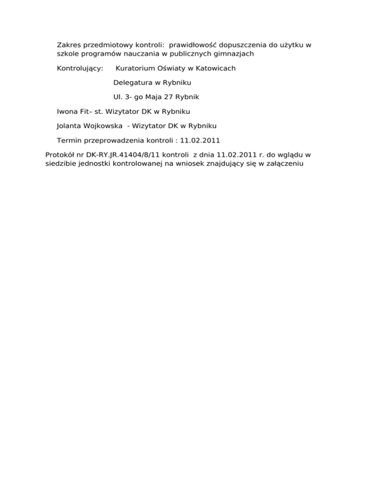 Zakres przedmiotowy kontroli: prawidłowość dopuszczenia do użytku w szkole programów nauczania w publicznych gimnazjach Kontrolujący: Kuratorium Oświaty w Katowicach Delegatura w Rybniku Ul. 3- go Maja 27 Rybnik Iwona Fit– st. Wizytator DK w Rybniku Jolanta Wojkowska - Wizytator DK w Rybniku Termin przeprowadzenia kontroli : 11.02.2011 Protokół nr DK-RY.JR.41404/8/11 kontroli z dnia 11.02.2011 r. do wglądu w siedzibie jednostki kontrolowanej na wniosek znajdujący się w załączeniu