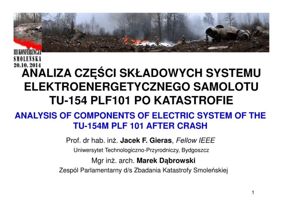 ANALIZA CZĘŚCI SKŁADOWYCH SYSTEMU ELEKTROENERGETYCZNEGO SAMOLOTU TU-154 PLF101 PO KATASTROFIE ANALYSIS OF COMPONENTS OF ELECTRIC SYSTEM OF THE TU-154M PLF 101 AFTER CRASH Prof. dr hab. inż. Jacek F. Gieras, Fellow IEEE Uniwersytet Technologiczno-Przyrodniczy, Bydgoszcz Mgr inż. arch. Marek Dąbrowski Zespól Parlamentarny d/s Zbadania Katastrofy Smoleńskiej 1 Analiza części składowych systemu elektroenergetycznego Spis tresci 1. Wprowadzenie 2. Części składowe ukladu elektropenergetycznego 3. Generatory 4. Uklady przetwarzania energii 5. Silniki elektryczne i aktuatory 6. Akumulatory 7. Swiatla ladowania 8. Pompy paliwowe 9. Przewody elektroenergetyczne 10.Wnioski 2 Analiza części składowych systemu elektroenergetycznego Wprowadzenie Niezalezni badacze Tragedii Smolenskiej w dniu 10 kwietna 2010 doszli do wniosku, ze samolot Tu-154M PLF 101 nie ulegl katastrofie w wyniku uderzenia w grunt, lecz rozpadl sie w powietrzu. Wniosek ten jest uzasadniony przez nastepujace fakty: • rozklad szczatkow • duza ilosc (dziesiatki tysiecy) drobnych czesci na polu katastrofy; • fragmenty poszycia samolotu na drzewach; • brak krateru; • brak paliwa oraz pozaru paliwa na ziemi w okolicach rzekomego zderzenia z brzoza Zdjecie satelitarne rozkladu szczatkow samolotu Tu-154M PLF : (1) elementy lekkie w tym stabilizatory; (2) silniki, elementy srodkowego i tylnego kadluba, ster; (3) kola podwozia, czesci srodkowych skrzydel, czesci srodkowego kadluba, pozostalosci kabiny3 pilotow , kola zapasowe. Analiza części składowych systemu elektroenergetycznego Czesci skladowe ukladu elektroenergetycznego Czesci skladowe systemu elektroenergetycznego: • generatory, t.j. generatory glowne wbudowane w silniki turbowentylatorowe oraz generator pomocniczej jednostki pradotworczej (APU); • przeksztaltniki, np. przeksztaltniki polprzewodnikowe oraz elektromaszynowe; • silniki elektryczne; • urzadzenia elektromagnetyczne, np. , zawory elektromagnetyczne actuatory, itp.; • akumulatory; • kable elektroenergetyczne. Schemat blokowy ukladu elektroenergetycznego samolotu Tu-154M. 4 Analiza części składowych systemu elektroenergetycznego Generatory Generatory glowne to trzy 40-kVA, 115/200 V, 400 Hz, 6000 rpm maszyny synchroniczne ГТ40ПЧ6 o wzbudzeniu elektromagnetycznym napedzane przez trzy silniki turbowentylatorowe Д-30КУ za posrednictwem ukladu mechanicznohydraulicznego o stalej predkosci (CSD). Generator synchroniczny ГТ40ПЧ6 o wzbudzeniu elektromagnetycznym Generator ГТ40ПЧ6 na silniku No 1 (lewym). Pokrywa silnika zostala usunieta. Fotografia wykonana miedzy 11 a 13 kwietnia 2010 ma miejscu katastrofy. Zrodlo: Aneks No 4.10.22 to 5 Raportu KBWL. Analiza części składowych systemu elektroenergetycznego Uklady przetwarzania energii Nie znaleziono zadnych elementow i ukladow przeksztaltnikowych na dostepnych fotografiach i filmach. Zdjecie obok przedstawia prostownik ВУ-6B ktory zasila szyny 27 V DC. Prostowniki ВУ-6 samolotu Tu154M PLF101 nie zostaly zidentyfikowane na dostepnych zdjeciach wykonanych po kotastrofie. Prostownik VU-6B 208 V 400 Hz/27 V DC bedacy na wyposazeniu samolotu Tu-154. Zrodlo: http://commons.wikimedia.org/wiki/File:VU6B-rectifying-device-on-Tu-154.jpg 6 Analiza części składowych systemu elektroenergetycznego Silniki elektryczne i aktuatory Silnik elektryczny pradu stalego Д-10 АРУ (D-10 ARU) jest integralna czescia hamulca elektromagnetycznego ТЭМ-4 do kontroli mechanizmu klap. Brand new Д-10 АРУ d.c. electric motor. Rozklad szczatkow samolotu Tu-154M PLF 101 na polu katastrofy przed ulica Kutuzowa na podstawie raportu MAK. 7 Analiza części składowych systemu elektroenergetycznego Silniki elektryczne i aktuatory Lokalizacja aktuatora srubowego klap i hamulca elektromagnetycznego ТЭМ-4 na dzialce N. Bodina przed ulica Gubenki. Zrodlo: opracowanie blogera Wielki55 8 Analiza części składowych systemu elektroenergetycznego Silniki elektryczne i aktuatory Hamulec elektromagnetyczny ТЭМ-4. Fotografia wykonana prawdopodobnie 10 kwietnia 2010 przed godz.18:44. Zrodlo: http://www.forum.smolensk.ws/viewtopic. php?p=6889622#p68 89622 Autor: MAKS. Aktuator srubowy klap znaleziony w poblizu szopy N. Bodina. Zrodlo: S. Amielin 9 Analiza części składowych systemu elektroenergetycznego Silniki elektryczne i aktuatory Czesci ukladu sterowania klap znalezione na polu katastrofy oraz zasada sterowania Aktuator srubowy napedu klap lewego klapami samolotu Tu-154M. 1 – klapa skrzydla (1), hamulec zewnetrzna, 2 – klapa wewnetrzna, 3 elektromagnetyczny ТЭМ-4 (2) and aktuator srubowy sterowania klapami reduktor (3). Fotografia wykonana zewnetrznymi, 4 – aktuator srubowy przez MAK. Source: sterowania klapami wewnetrznymi, 5 – www.faktysmolensk.gov.pl hamulec electromagnetyczny TEM-4 mechanizmu klap, 6 – wal transmisyjny, 7 – 10 silnik hydrauliczny. Zrodlo: S. Amielin Analiza części składowych systemu elektroenergetycznego Akumulatory Akumulatory niklowo-kadmowe 20НКБН-25-У3 sluza do: • rozruchu autonomicznego silnikow glownych oraz APU; • zasilaja w warunkach postoju na ziemi poszczegolne obciazenia, kiedy silniki oraz APU nie pracuja; • rozruchu silnikow podczas lotu • zasilania podczas lotu odbiorow pierwszej kategorii w warunkach awaryjnych. Akumulator niklowo-kadmowy 20НКБН-25-У3 Nie jest wiadomo, czy nieuszkodzone akumulatory byly akumulatorami pracujacymi w ukladzie elektroenergetycznym czy tez pochodza z “apteczki technicznej”. Nieuszkodzne akumulatory na polu katastrofy. Zrodlo: SuperVizjer_Smolensk_4.wmv (http://www.youtube.com/watch?v=dB08tmbl2TQ). 11 Analiza części składowych systemu elektroenergetycznego Akumulatory Sprezarka niskiego cisnienia (LPC) lewego silnika No 1 na polu katastrofy. (a) lopatki obracaly sie zanim silnik upadl na ziemie poniewaz ich konce sa pokryte ziemia; (b) przemiot w zoltej ramce prostokatnej obok LPC jest prawdopodobnie akumulatorem 20НКБН-25-У3. Zrod