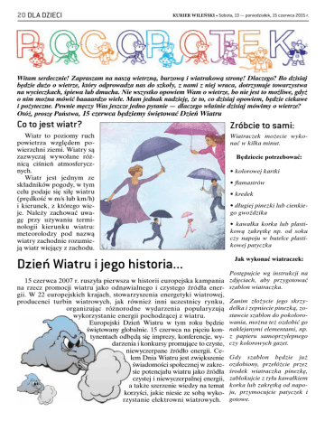 20 DLA DZIECI KURIER WILEŃSKI • Sobota, 13 — poniedziałek, 15 czerwca 2015 r. Witam serdecznie! Zapraszam na naszą wietrzną, burzową i wiatrakową stronę! Dlaczego? Bo dzisiaj będzie dużo o wietrze, który odprowadza nas do szkoły, z nami z niej wraca, dotrzymuje towarzystwa na wycieczkach, śpiewa lub dmucha. Nie wszystko opowiem Wam o wietrze, bo nie jest to możliwe, gdyż o nim można mówić baaaardzo wiele. Mam jednak nadzieję, że to, co dzisiaj opowiem, będzie ciekawe i pożyteczne. Pewnie męczy Was jeszcze jedno pytanie — dlaczego właśnie dzisiaj mówimy o wietrze? Otóż, proszę Państwa, 15 czerwca będziemy świętować Dzień Wiatru Co to jest wiatr? Zróbcie to sami: Wiatr to poziomy ruch powietrza względem powierzchni ziemi. Wiatry są zazwyczaj wywołane różnicą ciśnień atmosferycznych. Wiatr jest jednym ze składników pogody, w tym celu podaje się siłę wiatru (prędkość w m/s lub km/h) i kierunek, z którego wieje. Należy zachować uwagę przy używaniu terminologii kierunku wiatru: meteorolodzy pod nazwą wiatry zachodnie rozumieją wiatr wiejący z zachodu. Wiatraczek możecie wykonać w kilka minut. Dzień Wiatru i jego historia... Będziecie potrzebować: • kolorowej kartki • flamastrów • kredek • długiej pinezki lub cienkiego gwoździka • kawałka korka lub plastikową zakrętkę np. od soku czy napoju w butelce plastikowej patyczka Jak wykonać wiatraczek: Postępujcie wg instrukcji na 15 czerwca 2007 r. ruszyła pierwsza w historii europejska kampania zdjęciach, aby przygotować na rzecz promocji wiatru jako odnawialnego i czystego źródła ener- szablon wiatraczka. gii. W 22 europejskich krajach, stowarzyszenia energetyki wiatrowej, producenci turbin wiatrowych, jak również inni uczestnicy rynku, organizując różnorodne wydarzenia popularyzują wykorzystanie energii pochodzącej z wiatru. Europejski Dzień Wiatru w tym roku będzie świętowany globalnie. 15 czerwca na pięciu kontynentach odbędą się imprezy, konferencje, wydarzenia i konkursy promujące to czyste, niewyczerpane źródło energii. Celem Dnia Wiatru jest zwiększenie świadomości społecznej w zakresie potencjału wiatru jako źródła czystej i niewyczerpalnej energii, a także szerzenie wiedzy na temat korzyści, jakie niesie ze sobą wykorzystanie elektrowni wiatrowych. Zanim złożycie jego skrzydełka i zepniecie pinezką, zostawcie szablon do pokolorowania, można też ozdobić go naklejanymi elementami, np. z papieru samoprzylepnego czy kolorowych gazet. Gdy szablon będzie już ozdobiony, przełóżcie przez środek wiatraczka pinezkę, zablokujcie z tyłu kawałkiem korka lub zakrętką od napoju, przymocujcie patyczek i gotowe. DLA DZIECI 21 KURIER WILEŃSKI • Sobota, 13 — poniedziałek, 15 czerwca 2015 r. Tornado — niebezpieczna burza Pokoloruj rysunek Tornado — z hiszpańskiego „tronada” — burza — gwałtownie wirująca kolumna powietrza, będąca jednocześnie w kontakcie z powierzchnią ziemi i podstawą chmury cumulonimbusa. Tornada osiągają różne wielkości, jednak zwykle przyjmują postać widzialnego leja kondensacyjnego, węższym końcem dotykającego ziemi. Dolna część leja jest często otoczona chmurą odłamków i pyłu. Tornada zaobserwowano na każdym kontynencie, oprócz Antarktydy, jednak najwięcej tornad rocznie notuje się w Stanach Zjednoczonych. Większość tornad ma siłę wiatru nie większą niż 180 km/h i szerokość leja do 75 metrów i pozostaje w kontakcie z ziemią na tyle długo, by przemierzyć kilka kilometrów, ale niektóre osiągają prędkość wiatru ponad 480 km/h, szerokość leja 1,5 km i przemierzają do 100 km dotykając ziemi. Siłę tornad mierzy się w skali Fujity. Większość najbardziej niszczycielskich tornad formuje się w chmurach burzowych zwanych superkomórkami. W polskiej terminologii tornado jest określane mianem trąba powietrzna. Wiatrak i Wiatrołom Jakie są rodzaje wiatrów • Stałe — czyli nie zmieniające swój kierunek w ciągu całego roku. • pasaty • antypasaty • Sezonowe (okresowe) tj. wiatry zmieniające swój kierunek w cyklu rocznym lub dobowym. • monsun • Zmienne (lokalne) — zmieniają swój kierunek zależnie od lokalnych układów ośrodków barycznych. • monsun • bryza Ale dowcip! Dlaczego pszczoła brzęczy? Bo nie potrafi gwizdać! Wiatrak — najstarszy silnik wiatrowy. Wiatrak wynaleziono około roku 107 p.n.e. Jest poprzednikiem turbiny wiatrowej, którą czasami również nazywa się wiatrakiem. Dawniej powszechnie stosowa- ny do napędu młynów mielących i pomp odwadniających, a aktualnie w elektrowniach wiatrowych. Typy historyczne wiatraków: koźlak, paltrak, holender. Wiatraczkami nazywane są wiatraki — zabawki i (błędnie) rozmaitego rodzaju wentylatory. Wiatrołom — to drzewo połamane silnym wiatrem. Wiatrołomy to częsty efekt przechodzenia tornad i silniejszych wiatrów nad lasami. Wiatrołomy ze względu na duże zagrożenie są usuwane z terenu, jednak nie zawsze są to drzewa obumarłe i ich usuwanie wymaga odpowiedniego zezwolenia.