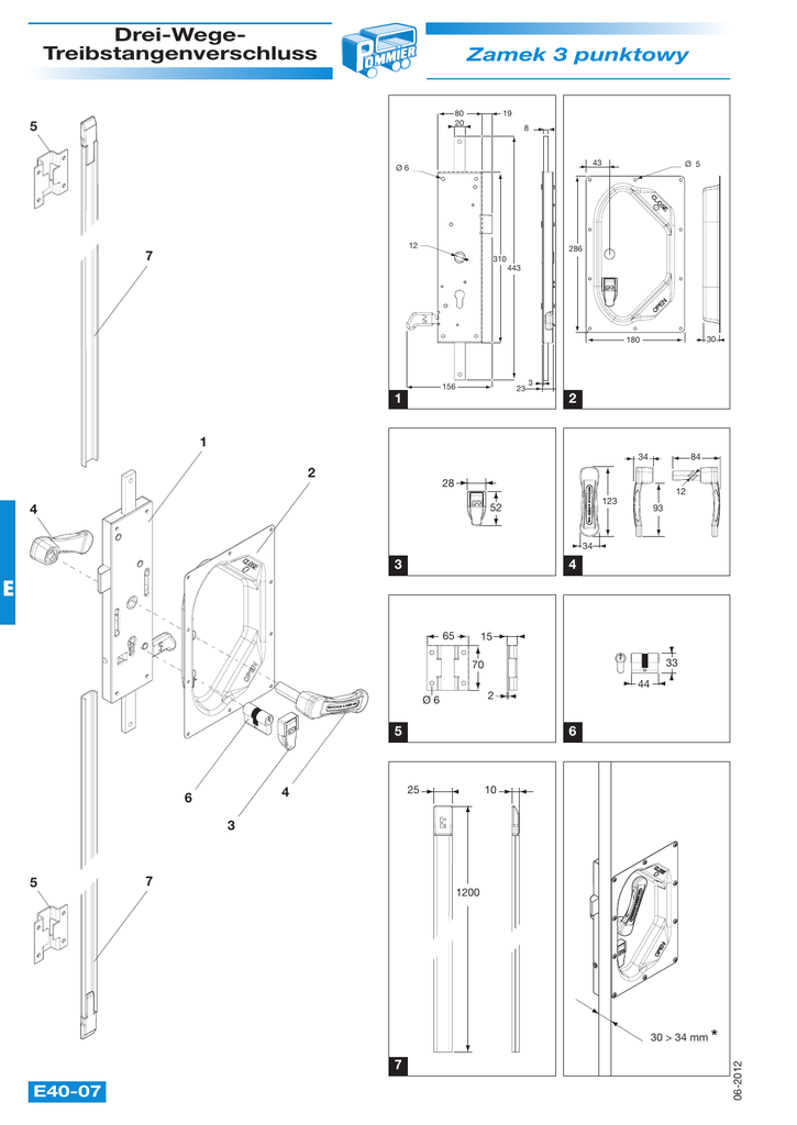 Drei-WegeTreibstangenverschluss Zamek 3 punktowy 80 20 5 19 8 43 Ø6 12 Ø 5 286 7 310 443 30 180 156 23 1 3 2 1 34 2 84 28 12 123 52 4 93 34 3 4 E 65 15 33 70 44 2 Ø6 5 25 4 6 6 10 3 5 7 1200 7 E40-07 06-2012 30 > 34 mm * Drei-WegeTreibstangenverschluss Pos. Pos. Bezug Referencja Zamek 3 punktowy Benennung Opis Gewicht Waga Anz. Ilość 22.43480FD Verschluss Set rechts (wie abgebildet) mit unterschiedlichen Schließzylindern. Kompletny zamek PRAWY/jak na rysunku/ z kombinacją bębenków 22.43480FG Wie zuvor, jedoch Set links. Zamek kompletny przeciwstawny do rysunku z kombinacją bębenków. 22.43481FD Verschluss Set rechts (wie abgebildet) mit Schließzylindern. Zamek kompletny PRAWY/jak na rysunku/ z jednakowym bębenkiem. 22.43481FG Wie zuvor, jedoch Set links. Zamek kompletny przeciwstawny do rysunku z tym samym bębenkiem. 22.43480ED Verschlusskörper, verzinkt, wie abgebildet. Kaseta zamka stal ocynk jak na rysunku. 22.43480EG Wie zuvor, jedoch spiegelbildlich. Kaseta zamka przeciwstawnado rysunku. 1 22.43480CD Verschlussschale mit Schlossabdeckung, wie abgebildet. Miska stal ocynk z klapką bębenka jak na rysunku. 1 22.43480CG Wie zuvor, jedoch spiegelbildlich. Miska zamka stal ocynk przeciwstawna do rysunku. t t 4,745 1 t t l 1 1 l 2,040 2 l l l l 0,490 1 l l Plastik-Schlossabdeckung, siehe Seite E15-01. Klapka bębenka z plastiku patrz str. E15-01. 0,015 1 l l l l 22.43480PO Plastik-Türgriff Set. Zespół kalmek , wewnętrzna z plastiku. 0,260 1 l l l l 22.43483GU Stangenführung, verzinkt. Prowadniki cięgien stal ocynk. 0,090 2 l l l l 22.43480CV Schließzylinder mit 2 verschiedenen Schlüsselkombinationen. Bębenek + 2 klucze różne kombinacje. 1 l l 22.43480MN Wie zuvor, jedoch mit gleicher Schlüsselnummer. Bębenek + 2 klucze bez kombinacji. l l 22.43483TR Verschlussstange, verzinkt (mit angeschweißtem Riegel). Cięgna stal ocynk /rygle spawane/. l l 3 19.04064 4 5 6 7 Komponenten Skład 0,130 1 E 0,815 2 l l OPTION / OPCJE 22.43481MD Zusatzmodul für elektrische Verriegelung, rechts (+LED). Moduł dodakowy do ryglowania elektrycznego kasety PRAWEJ + LED. 22.43481MG Zusatzmodul für elektrische Verriegelung, links (+LED). Moduł dodakowy do ryglowania elektrycznego kasety LEWEJ + LED. 0257.11173 Funkmodul (mit 2 Schlüsselanhänger-Fernbedienungen). Moduł zdalengo sterowania ( z dwoma pilotami). 8 9 l 1 l 1,300 l 0,400 1 l l l l l 220 50 12 V 9 06-2012 210 * Andere Dicken auf Anfrage. Dla innych głębokości prośimy o konsultacje. 27 8 E40-08