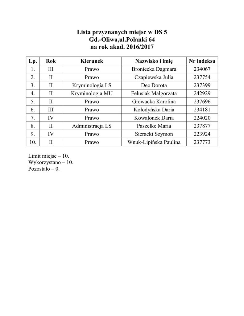 Lista przyznanych miejsc w DS 5 Gd.-Oliwa,ul.Polanki 64 na rok akad. 2016/2017 Lp. 1. 2. 3. 4. 5. 6. 7. 8. 9. 10. Rok III II II II II III IV II IV II Kierunek Prawo Prawo Kryminologia LS Kryminologia MU Prawo Prawo Prawo Administracja LS Prawo Prawo Limit miejsc – 10. Wykorzystano – 10. Pozostało – 0. Nazwisko i imię Broniecka Dagmara Czapiewska Julia Dec Dorota Felusiak Małgorzata Głowacka Karolina Kołodyńska Daria Kowalonek Daria Paszelke Maria Sieracki Szymon Wnuk-Lipińska Paulina Nr indeksu 234067 237754 237399 242929 237696 234181 224020 237877 223924 237773