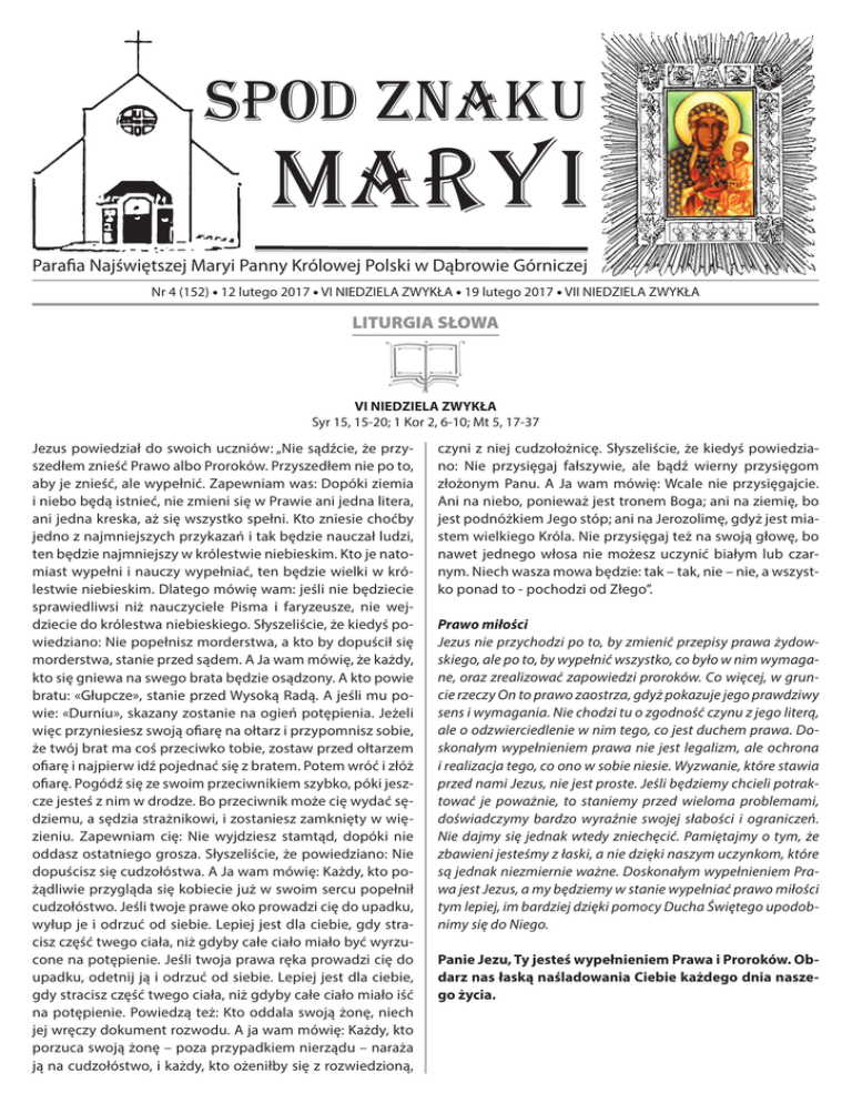 SPOD ZNAKU MARYI Parafia Najświętszej Maryi Panny Królowej Polski w Dąbrowie Górniczej Nr 4 (152) • 12 lutego 2017 • VI NIEDZIELA ZWYKŁA • 19 lutego 2017 • VII NIEDZIELA ZWYKŁA LITURGIA SŁOWA | VI NIEDZIELA ZWYKŁA Syr 15, 15-20; 1 Kor 2, 6-10; Mt 5, 17-37 Jezus powiedział do swoich uczniów: „Nie sądźcie, że przyszedłem znieść Prawo albo Proroków. Przyszedłem nie po to, aby je znieść, ale wypełnić. Zapewniam was: Dopóki ziemia i niebo będą istnieć, nie zmieni się w Prawie ani jedna litera, ani jedna kreska, aż się wszystko spełni. Kto zniesie choćby jedno z najmniejszych przykazań i tak będzie nauczał ludzi, ten będzie najmniejszy w królestwie niebieskim. Kto je natomiast wypełni i nauczy wypełniać, ten będzie wielki w królestwie niebieskim. Dlatego mówię wam: jeśli nie będziecie sprawiedliwsi niż nauczyciele Pisma i faryzeusze, nie wejdziecie do królestwa niebieskiego. Słyszeliście, że kiedyś powiedziano: Nie popełnisz morderstwa, a kto by dopuścił się morderstwa, stanie przed sądem. A Ja wam mówię, że każdy, kto się gniewa na swego brata będzie osądzony. A kto powie bratu: «Głupcze», stanie przed Wysoką Radą. A jeśli mu powie: «Durniu», skazany zostanie na ogień potępienia. Jeżeli więc przyniesiesz swoją ofiarę na ołtarz i przypomnisz sobie, że twój brat ma coś przeciwko tobie, zostaw przed ołtarzem ofiarę i najpierw idź pojednać się z bratem. Potem wróć i złóż ofiarę. Pogódź się ze swoim przeciwnikiem szybko, póki jeszcze jesteś z nim w drodze. Bo przeciwnik może cię wydać sędziemu, a sędzia strażnikowi, i zostaniesz zamknięty w więzieniu. Zapewniam cię: Nie wyjdziesz stamtąd, dopóki nie oddasz ostatniego grosza. Słyszeliście, że powiedziano: Nie dopuścisz się cudzołóstwa. A Ja wam mówię: Każdy, kto pożądliwie przygląda się kobiecie już w swoim sercu popełnił cudzołóstwo. Jeśli twoje prawe oko prowadzi cię do upadku, wyłup je i odrzuć od siebie. Lepiej jest dla ciebie, gdy stracisz część twego ciała, niż gdyby całe ciało miało być wyrzucone na potępienie. Jeśli twoja prawa ręka prowadzi cię do upadku, odetnij ją i odrzuć od siebie. Lepiej jest dla ciebie, gdy stracisz część twego ciała, niż gdyby całe ciało miało iść na potępienie. Powiedzą też: Kto oddala swoją żonę, niech jej wręczy dokument rozwodu. A ja wam mówię: Każdy, kto porzuca swoją żonę – poza przypadkiem nierządu – naraża ją na cudzołóstwo, i każdy, kto ożeniłby się z rozwiedzioną, czyni z niej cudzołożnicę. Słyszeliście, że kiedyś powiedziano: Nie przysięgaj fałszywie, ale bądź wierny przysięgom złożonym Panu. A Ja wam mówię: Wcale nie przysięgajcie. Ani na niebo, ponieważ jest tronem Boga; ani na ziemię, bo jest podnóżkiem Jego stóp; ani na Jerozolimę, gdyż jest miastem wielkiego Króla. Nie przysięgaj też na swoją głowę, bo nawet jednego włosa nie możesz uczynić białym lub czarnym. Niech wasza mowa będzie: tak – tak, nie – nie, a wszystko ponad to - pochodzi od Złego”. Prawo miłości Jezus nie przychodzi po to, by zmienić przepisy prawa żydowskiego, ale po to, by wypełnić wszystko, co było w nim wymagane, oraz zrealizować zapowiedzi proroków. Co więcej, w gruncie rzeczy On to prawo zaostrza, gdyż pokazuje jego prawdziwy sens i wymagania. Nie chodzi tu o zgodność czynu z jego literą, ale o odzwierciedlenie w nim tego, co jest duchem prawa. Doskonałym wypełnieniem prawa nie jest legalizm, ale ochrona i realizacja tego, co ono w sobie niesie. Wyzwanie, które stawia przed nami Jezus, nie jest proste. Jeśli będziemy chcieli potraktować je poważnie, to staniemy przed wieloma problemami, doświadczymy bardzo wyraźnie swojej słabości i ograniczeń. Nie dajmy się jednak wtedy zniechęcić. Pamiętajmy o tym, że zbawieni jesteśmy z łaski, a nie dzięki naszym uczynkom, które są jednak niezmiernie ważne. Doskonałym wypełnieniem Prawa jest Jezus, a my będziemy w stanie wypełniać prawo miłości tym lepiej, im bardziej dzięki pomocy Ducha Świętego upodobnimy się do Niego. Panie Jezu, Ty jesteś wypełnieniem Prawa i Proroków. Obdarz nas łaską naśladowania Ciebie każdego dnia naszego życia. VII NIEDZIELA ZWYKŁA Kpł 19, 1-2. 17-18; 1 Kor 3, 16-23; Mt 5, 38-48 Jezus powiedział do swoich uczniów: „Słyszeliście, że powiedziano: Oko za oko, ząb za ząb. A Ja wam mówię: Nie zwalczajcie zła złem, lecz jeśli cię ktoś uderzy w prawy policzek, nadstaw mu i drugi. A temu, kto chce się z tobą procesować o tunikę, oddaj także płaszcz. Jeśli cię ktoś zmusza, żebyś szedł z nim tysiąc kroków, idź z nim dwa tysiące. Daj temu, kto cię prosi, i nie odmawiaj temu, kto chce od ciebie pożyczyć. Słyszeliście, że powiedziano: Będziesz miłował swego bliźniego, a nieprzyjaciela będziesz nienawidził. A Ja wam mówię: Miłujcie waszych nieprzyjaciół i módlcie się za waszych prześladowców, abyście byli synami waszego Ojca, który jest w niebie. On sprawia, że słońce wschodzi dla złych i dobrych i zsyła deszcz dla sprawiedliwych i niesprawiedliwych. Jeśli bowiem miłujecie tylko tych, którzy was miłują, jakiej zapłaty możecie się spodziewać? Czy i celnicy tego nie czynią? I jeśli pozdrawiacie tylko swoich bliskich, to cóż szczególnego czynicie? Czy i poganie tak nie postępują? Bądźcie więc tak doskonali, jak doskonały jest wasz Ojciec Niebieski”. Stać się synem Bożym Talmud mówi, że dar deszczu jest większy niż dar Tory, gdyż ona została dana jedynie Izraelowi, natomiast deszcz swoim zasięgiem ogarnia wszystkich ludzi. Jeśli zdamy sobie sprawę z tego, jak ważna dla Żydów jest Tora, pierwszych pięć ksiąg Pisma Świętego, to zrozumiemy znaczenie tych słów. W doskonały sposób oddają one wezwanie Jezusa z dzisiejszej Ewangelii do tego, aby miłować wszystkich ludzi. Bóg jest dobry i swoją 