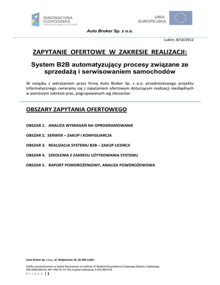 Auto Broker Sp. z o.o. Lublin; 8/10/2012 ZAPYTANIE OFERTOWE W ZAKRESIE REALIZACJI: System B2B automatyzujący procesy związane ze sprzedażą i serwisowaniem samochodów W związku z wdrażaniem przez firmę Auto Broker Sp. z o.o. przedmiotowego projektu informatycznego zwracamy się z zapytaniem ofertowym dotyczącym realizacji niezbędnych w poniższym zakresie prac, pogrupowanych wg obszarów: OBSZARY ZAPYTANIA OFERTOWEGO OBSZAR 1. ANALIZA WYMAGAŃ NA OPROGRAMOWANIE OBSZAR 2. SERWER – ZAKUP I KONFIGUARCJA OBSZAR 3. REALIZACJA SYSTEMU B2B – ZAKUP LICENCJI OBSZAR 4. SZKOLENIA Z ZAKRESU UŻYTKOWANIA SYSTEMU OBSZAR 5. RAPORT POWDROŻENIOWY, ANALIZA POWDROŻENIOWA Auto Broker Sp. z o.o., ul. Mełgiewska 10, 20-209 Lublin Spółka zarejestrowana w Sądzie Rejonowym w Lublinie, XI Wydział Gospodarczy Krajowego Rejestru Sądowego KRS 0000146570, NIP: 946-23-74-745, Kapitał zakładowy 3.025.000 PLN Strona |1 Auto Broker Sp. z o.o. ZAŁOŻENIA WYMOGÓW REALIZACJI POSZCZEGÓLNYCH OBSZARÓW OBSZAR 1. Analiza wymagań na oprogramowanie W ramach obszaru nr 1 zrealizowana zostanie następująca analiza, której skutkiem będzie określony cel. Analiza wymagań na oprogramowanie jest konieczna do tego, aby właściwie przygotowana została specyfikacja, a następnie na podstawie tych dokumentów wdrożone zostało oprogramowanie. W ramach tej analizy zostanie wykonany audyt oprogramowania, dokumentacji i sprzętu posiadanego przez firmę. Pozwoli to na określenie szczegółowych potrzeb w zakresie konfiguracji sprzętu i właściwe wykorzystanie planowanego do wdrożenia oprogramowania. Wykonanie tej analizy umożliwi także właściwie dobrać technologie informatyczne do rodzaju, poziomu bezpieczeństwa, wydajności i funkcjonalności planowanego do wdrożenia systemu. OBSZAR 2. Serwer - zakup i konfiguracja W ramach obszaru nr 2 zostanie zakupiony, a następnie skonfigurowany serwer. Minimalne wymagania serwera zostały określone w poniższej tabeli: Minimalne Wymagania Techniczne Procesor 4-rdzeniowy, prędkość procesora 2,4 GHz, Pamięć cache8 MB L3 Pamięć standardowa 4 GB Typ pamięci PC3-10600R (RDIMM) Wymagane oprogramowanie serwera Microsoft Windows Server 2008 R2 Standard PL OEM zakup licencji dostępowych dla 16 użytkowników Dodatkowo konieczna jest usługa wdrożenia i właściwej konfiguracji serwera dla potrzeb niezbędnych do prawidłowej pracy systemu B2B. Auto Broker Sp. z o.o., ul. Mełgiewska 10, 20-209 Lublin Spółka zarejestrowana w Sądzie Rejonowym w Lublinie, XI Wydział Gospodarczy Krajowego Rejestru Sądowego KRS 0000146570, NIP: 946-23-74-745, Kapitał zakładowy 3.025.000 PLN Strona |2 Auto Broker Sp. z o.o. OBSZAR 3. Realizacja systemu B2B – Zakup licencji Wdrożenie systemu B2B ma na celu automatyzację podstawowych procesów w firmie związanych z jej operacyjną działalnością. Zagadnienia te powinny zostać opisane na podstawie analizy przedwdrożeniowej, dokładnie określone i przełożone na język działania systemu, a następnie zaimplementowane. Założenia dotyczące automatyzacji procesów występujących w firmie Procesy związane ze sprzedażą samochodów Sprawdzenie cen Procesy związane ze sprzedażą części samochodowych Automatyzacja zamówień niskich stanów magazynowych Zamawianie części samochodowych w firmie partnerskiej Wsparcie obiegu dokumentów związanych ze sprzedażą części samochodowych Procesy związane ze sprzedażą i świadczeniem usług serwisowych Wycena zleceń serwisowych Obsługa zleceń serwisowych Wymagane jest posiadane własnych rozwiązań informatycznych klasy ERP, w których będzie możliwość automatyzowania w/w procesów i ich odpowiednie dostosowanie do charakteru bieżącej pracy Auto Broker. Założenia dotyczące skutków wdrożenia Realizacja projektu powinna przynieść następujące, wymierne korzyści biznesowe: skrócenie czasu i automatyzacja obsługi procesów: zakupu/ sprzedaży części samochodowych, zakupu/ sprzedaży samochodów, raportowania operacyjnego, zarządczego i importerskiego, weryfikacji płatności, generowania analiz rynkowych wprowadzenie wymiany elektronicznej dokumentów w oparciu standard równoważny z EDI, co pozwoli szybką wymianę informacji między oddziałami Wnioskodawcy a współpracującymi przedsiębiorstwami podgląd w trybie on-line stanów magazynowych części i pojazdów wyeliminowanie pomyłek i rozbieżności w ofertach cenowych wyeliminowanie pomyłek w procesie zamawiania części skrócenia czasu w procesie przygotowywania zamówień części i ich dostarczania skrócenia czasu w procesie przygotowywania zamówień samochodów skrócenia czasu rezerwacji samochodów znajdujących się w rozproszonych magazynach Wnioskodawcy i partnerów minimalizacja czasu poświęcanego na przygotowywanie raportów Auto Broker Sp. z o.o., ul. Mełgiewska 10, 20-209 Lublin Spółka zarejestrowana w Sądzie Rejonowym w Lublinie, XI Wydział Gospodarczy Krajowego Rejestru Sądowego KRS 0000146570, NIP: 946-23-74-745, Kapitał zakładowy 3.025.000 PLN Strona |3 Auto Broker Sp. z o.o. Założenia dotyczące stosowanej technologii Rozwiązanie informatyczne powinno być tak dobrane, aby cechowała je: możliwość jednoczesnej pracy wielu użytkowników, duża odporność na błędy, szybkość działania, wysoki poziom bezpieczeństwa, brak ograniczeń, w zakresie wynikającym z potrzeb firmy, odnośnie integracji innych systemów firmy oraz z systemami przedsiębiorców współpracujących. OBSZAR 4. Szkolenia z zakresu użytkowania systemu W tym obszarze planuje się szkolenia dla pracowników z zakresu funkcjonalności i obsługi zakupionego, dedykowanego oprogramowania. Szkolenie odbędzie się w siedzibie wnioskodawcy, wyłącznie dla pracowników wnioskodawcy, zostaną przeprowadzone specjalistyczne szkolenia z zakresu posługiwania się dedykowanym oprogramowaniem. Szkolenie zostanie przeprowadzone osobno dla pracowników poszczególnych działów i potr