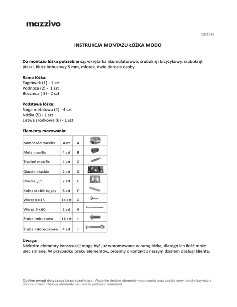 10/2015 INSTRUKCJA MONTAŻU ŁÓŻKA MODO Do montażu łóżka potrzebne są: wkrętarka akumulatorowa, śrubokręt krzyżykowy, śrubokręt płaski, klucz imbusowy 5 mm, młotek, dwie dorosłe osoby. Rama łóżka: Zagłówek (1) - 1 szt Podnóże (2) - 1 szt Bocznica ( 3) - 2 szt Podstawa łóżka: Noga metalowa (4) - 4 szt Nóżka (5) - 1 szt Listwa środkowa (6) - 1 szt Elementy mocowania: Mimośród maxifix 4szt A Mufa maxifix 4 szt B Trzpień maxifix 4 szt C Okucie płaskie 2 szt D Okucie „L” 2 szt E Kołek stabilizujący 8 szt F Wkręt 4 x 15 14 szt G Wkręt 5 x 60 2 szt H Śruba imbusowa 16 szt I Śruba młoteczkowa 4 szt J Uwaga: Niektóre elementy konstrukcji mogą być już wmontowane w ramę łóżka, dlatego ich ilość może ulec zmianę. W przypadku braku elementów, prosimy o kontakt z naszym działem obsługi klienta. Ogólne uwagi dotyczące bezpieczeństwa: Wszelkie drobne elementy mocowania oraz części ramy należy trzymać z dala od dzieci! Ciężkie elementy nie należy podnosić samemu! Instalacja elementów mocowania 1. Mimośrody maxifix (A) włóż do puszek nawierconych na końcach bocznic (3) w taki sposób, aby wytłoczone na nich strzałki skierowane były w stronę krótkiej krawędzi bocznic. 2. Kołek stabilizujący (F) umieść w 1,2 oraz 4 otworze podnóża (2) i dobij młotkiem do oporu. Do zamontowanych wcześniej muf maxifix (B) wkręć trzpienie maxifix (C) 3. Za pomocą śrub imbusowych (I) oraz kluczyka imbusowego 5 mm, przykręć metalowe nogi (4) do obu bocznic (3) według zaznaczonych otworów. 4. Okucia płaskie (E) przykręć za pomocą wkrętów 4x15 (G) do środkowej części zagłówka (1) i podnóża (2) według zaznaczonych otworów. Ogólne uwagi dotyczące bezpieczeństwa: Wszelkie drobne elementy mocowania oraz części ramy należy trzymać z dala od dzieci! Ciężkie elementy nie należy podnosić samemu! Montaż ramy łóżka 5. Złóż bocznice i podnóże (3 i 2), tak aby trzpienie (C) i kołki stabilizujące (F) weszły do otworów poziomych. Dociśnij mocno, aby elementy łóżka całkowicie się zeszły. 6. Mimośrody maxifix (A) przekręcić ruchem zgodnym z ruchem wskazówek zegara do oporu za pomocą śrubokręta krzyżakowego. 7. Postaw ramę łóżko na nóżki. UWAGA: Przy obracaniu łóżka wskazane jest aby dwie osoby złapały je po bokach i postawiły w taki sposób, aby nie opierać całego ciężary łóżka na nóżkach, ponieważ grozi to ich wyłamaniem. 8. Końcówkę śruby młoteczkowej (J) zamontuj w dolnej części bocznicy (3) za pomocą śrubokręta płaskiego w taki sposób aby środkowy otwór końcówki był widoczny przez dziurkę od strony zagłówka. Przyłóż zagłówek (1) do krawędzi łóżka a następnie wkręć śrubę młoteczkową (J) w otwory z zamontowanymi końcówkami. Ogólne uwagi dotyczące bezpieczeństwa: Wszelkie drobne elementy mocowania oraz części ramy należy trzymać z dala od dzieci! Ciężkie elementy nie należy podnosić samemu! Mocowanie podstawy łóżka 9. Do listwy środkowej (6) przykręć nóżkę (5) dwoma wkrętami 5x60 (H) według zaznaczonych otworów. 10. Do listwy środkowej (6) przykręć za pomocą wkrętów 4x15 (G) okucie „L” (E) na obu jej końcach. 11. Załóż okuciami „L”(E) na okuciach płaskich (D). Do tak złożonego łóżka można włożyć stelaż i materac. Ogólne uwagi dotyczące bezpieczeństwa: Wszelkie drobne elementy mocowania oraz części ramy należy trzymać z dala od dzieci! Ciężkie elementy nie należy podnosić samemu! Ogólne uwagi dotyczące bezpieczeństwa: Wszelkie drobne elementy mocowania oraz części ramy należy trzymać z dala od dzieci! Ciężkie elementy nie należy podnosić samemu!