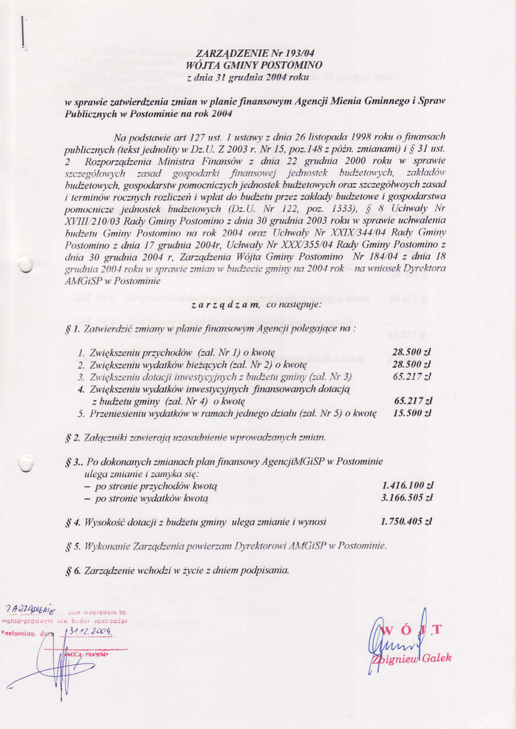 ZARZĄDZEME Nt 193/04 VO.ITA GMINY POSTOMINO z dnia 3I