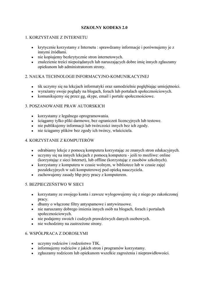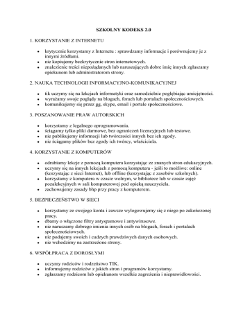 SZKOLNY KODEKS 2.0 1. KORZYSTANIE Z INTERNETU krytycznie korzystamy z Internetu : sprawdzamy informacje i porównujemy je z innymi źródłami. nie kopiujemy bezkrytycznie stron internetowych. znalezienie treści niepożądanych lub naruszających dobre imię innych zgłaszamy opiekunom lub administratorom strony. 2. NAUKA TECHNOLOGII INFORMACYJNO-KOMUNIKACYJNEJ tik uczymy się na lekcjach informatyki oraz samodzielnie pogłębiając umiejętności. wyrażamy swoje poglądy na blogach, forach lub portalach społecznościowych. komunikujemy się przez gg, skype, email i portale społecznościowe. 3. POSZANOWANIE PRAW AUTORSKICH korzystamy z legalnego oprogramowania. ściągamy tylko pliki darmowe, bez ograniczeń licencyjnych lub testowe. nie publikujemy informacji lub twórczości innych bez ich zgody. nie ściągamy plików bez zgody ich twórcy, właściciela. 4. KORZYSTANIE Z KOMPUTERÓW odrabiamy lekcje z pomocą komputera korzystając ze znanych stron edukacyjnych. uczymy się na innych lekcjach z pomocą komputera - jeśli to możliwe: online (korzystając z sieci Internet), lub offline (korzystając z zasobów szkolnych). korzystamy z komputera w czasie wolnym, w bibliotece lub w czasie zajęć pozalekcyjnych w sali komputerowej pod opieką nauczyciela. zachowujemy zasady bhp przy pracy z komputerem. 5. BEZPIECZEŃSTWO W SIECI korzystamy ze swojego konta i zawsze wylogowujemy się z niego po zakończonej pracy. dbamy o włączone filtry antyspamowe i antywirusowe. nie naruszamy dobrego imienia innych osób na blogach, forach i portalach społecznościowych. nie podajemy swoich i cudzych prawdziwych danych osobowych. nie wchodzimy na zastrzeżone strony. 6. WSPÓŁPRACA Z DOROSŁYMI uczymy rodziców i rodzeństwo TIK. informujemy rodziców z jakich stron i programów korzystamy. zgłaszamy rodzicom lub opiekunom wszelkie zagrożenia i nieprawidłowości.