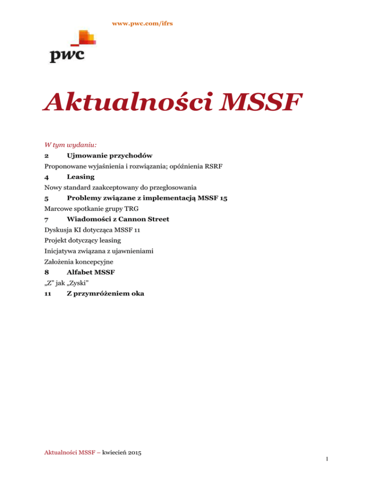 www.pwc.com/ifrs Aktualności MSSF W tym wydaniu: 2 Ujmowanie przychodów Proponowane wyjaśnienia i rozwiązania; opóźnienia RSRF 4 Leasing Nowy standard zaakceptowany do przegłosowania 5 Problemy związane z implementacją MSSF 15 Marcowe spotkanie grupy TRG 7 Wiadomości z Cannon Street Dyskusja KI dotycząca MSSF 11 Projekt dotyczący leasing Inicjatywa związana z ujawnieniami Założenia koncepcyjne 8 Alfabet MSSF „Z” jak „Zyski” 11 Z przymróżeniem oka Aktualności MSSF – kwiecień 2015 1 www.pwc.com/ifrs Rady proponują zmiany dotyczące przychodów; RSRF opóźnia datę wejścia w życie o rok W marcu RMSR (ang. IASB) i RSRF (ang. FASB) kontynuowały omawianie problemów związanych z wdrażaniem nowego standardu dotyczącego przychodów. RSRF odbyła spotkanie we własnym gronie, aby odłożyć o rok datę wejścia standardu w życie dla US GAAP – do 2018 roku, z możliwością wcześniejszego zastosowania w roku 2017. Ujmowanie przychodów pozostało najgorętszym tematem w marcu, gdy RSRF i RMSR kontynuowały debatę nad problemami związanymi z wdrażaniem nowego wspólnego standardu dotyczącego ujmowania przychodów. Rady zaproponują nowe praktyczne rozwiązanie, które ułatwi okres przejściowy. Rady uzgodniły też inne wyjaśnienia i rozwiązania, ale nie w pełni były zgodne w kwestii podejścia do tych problemów. Dodatkowo RSRF na oddzielnym spotkaniu postanowiła odłożyć o rok datę wejścia standardu w życie. RMSR będzie dyskutowała o dacie wejścia standardu w życie w tym miesiącu. Kluczowe decyzje Data wejścia w życie dla US GAAP RSRF przegłosowała odłożenie o rok daty wejścia standardu w życie. Nowy standard będzie obowiązywać w przypadku spółek publicznych od lat obrotowych rozpoczynających się po 15 grudnia 2017 r. (w przypadku spółek prywatnych będzie to 15 grudnia 2018 r.). Dozwolone jest wcześniejsze zastosowanie od 15 grudnia 2016 r. (pierwotna data wejścia w życie dla US GAAP). Okres przejściowy – zmiany do umów i umowy zakończone Zarówno RSRF, jak i RMSR zaproponują praktyczne rozwiązanie, które umożliwi jednostkom wykazywanie zmienionych umów na podstawie ceny transakcji na dzień zastosowania standardu po raz pierwszy. Jednostka dokona wówczas jednorazowej alokacji pojedynczej ceny sprzedaży (korzystając z wiedzy zgromadzonej od momentu zawarcia umowy) do wszystkich zrealizowanych i niezrealizowanych obowiązków wykonania świadczeń występujących w danej umowie od jej zawarcia. Rozwiązanie to eliminuje wymóg oddzielnego wykazywania każdej zmiany do umowy przez cały okres jej obowiązywania. To zwolnienie z powyższego wymogu zostało zaproponowane w odpowiedzi na obawy interesariuszy dotyczące kosztów i złożoności stosowania wytycznych w sprawie zmian do umów w przypadku umów długoterminowych, do których wprowadzono kilka modyfikacji. RMSR zaproponuje również rozwiązanie w ramach pełnego podejścia retrospektywnego, które da jednostkom możliwość nieprzekształcania umów, które zostały zakończone przy zastosowaniu poprzednich zasad obowiązujących przed najwcześniejszym z prezentowanych okresów. Jest to rozwiązanie podobne do zwolnienia przysługującego jednostkom stosującym Aktualności MSSF – kwiecień 2015 2 www.pwc.com/ifrs standardy MSSF po raz pierwszy, które nie muszą stosować nowego standardu dotyczącego przychodów do umów zakończonych w okresie, gdy obowiązywały poprzednie zasady rachunkowości, nawet gdyby nie zostały jeszcze zakończone w przypadku zastosowania do nich nowego standardu. RSRF nie zaproponuje tego rozwiązania. Prezentacja podatków od sprzedaży pobieranych od klientów RSRF zgodziła się na zaproponowanie praktycznego rozwiązania umożliwiającego jednostce albo (1) wybranie prezentacji netto dla wszystkich podatków, albo (2) zastosowanie nowego standardu dotyczącego przychodów do oceny, które podatki są nakładane na jednostkę, a które powinny być wyłączone z przychodów. RMSR nie zdecydowała się na przyjęcie tego rozwiązania. Jednostki sporządzające sprawozdania finansowe według MSSF już teraz mają obowiązek oceniania podatków od sprzedaży zgodnie z obowiązującymi wytycznymi. Wynagrodzenie niepieniężne RSRF zgodziła się wprowadzić wyjaśnienie, że wynagrodzenie niepieniężne należy wyceniać na moment zawarcia umowy oraz że ograniczenie dotyczące zmiennego wynagrodzenia ma zastosowanie wyłącznie do zmienności wynikającej z innych przyczyn niż postać wynagrodzenia. Propozycje będą wymagały ujmowania późniejszych zmian wartości godziwej wynagrodzenia bezgotówkowego w wyniku finansowym (tj. ich wyłączenia z przychodów z umów z klientami). Może to oznaczać znaczącą zmianę w stosunku do obecnej praktyki dla sporządzających sprawozdania finansowe według US GAAP. RMSR nie zaproponowała rozwiązania, lecz będzie przyglądała się działaniom RSRF i w razie potrzeby wróci do tematu w przyszłości. Ściągalność RSRF zdecydowała się na uściślenie przepisów dotyczących ściągalności, ale nie na zmianę zasad. Zaproponuje wyjaśnienie, że ocena ściągalności nie opiera się na tym, czy całe wynagrodzenie przyrzeczone w umowie zostanie otrzymane. Jednostki powinny analizować prawdopodobieństwo ściągnięcia wynagrodzenia, do którego będą uprawnione w zamian za towary lub usługi, które zostaną przekazane klientowi. Rada zaproponuje też wyjaśnienie rozumienia rozwiązania umowy w kontekście ustalenia, kiedy bezzwrotne płatności można ujmować jako przychody. RMSR wydawała się popierać kierunek obrany przez RSRF, ale decyzję o tym, czy i jak wyjaśnić wytyczne dotyczące ściągalności, podejmie dopiero na następnym spotkaniu. Wynagrodzenie z tytułu stosunku agencyjnego Pracownicy RSRF i RMSR przedstawili aktualne informacje na temat trwającego procesu zbierania opinii w sprawie stosunku agencyjnego, jednak Rady nie podjęły żad