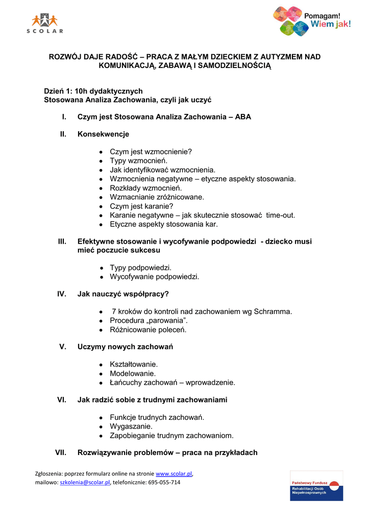 ROZWÓJ DAJE RADOŚĆ – PRACA Z MAŁYM DZIECKIEM Z AUTYZMEM NAD KOMUNIKACJĄ, ZABAWĄ I SAMODZIELNOŚCIĄ Dzień 1: 10h dydaktycznych Stosowana Analiza Zachowania, czyli jak uczyć I. Czym jest Stosowana Analiza Zachowania – ABA II. Konsekwencje III. Czym jest wzmocnienie? Typy wzmocnień. Jak identyfikować wzmocnienia. Wzmocnienia negatywne – etyczne aspekty stosowania. Rozkłady wzmocnień. Wzmacnianie zróżnicowane. Czym jest karanie? Karanie negatywne – jak skutecznie stosować time-out. Etyczne aspekty stosowania kar. Efektywne stosowanie i wycofywanie podpowiedzi - dziecko musi mieć poczucie sukcesu Typy podpowiedzi. Wycofywanie podpowiedzi. IV. Jak nauczyć współpracy? 7 kroków do kontroli nad zachowaniem wg Schramma. Procedura „parowania”. Różnicowanie poleceń. V. Uczymy nowych zachowań Kształtowanie. Modelowanie. Łańcuchy zachowań – wprowadzenie. VI. Jak radzić sobie z trudnymi zachowaniami Funkcje trudnych zachowań. Wygaszanie. Zapobieganie trudnym zachowaniom. VII. Rozwiązywanie problemów – praca na przykładach Zgłoszenia: poprzez formularz online na stronie www.scolar.pl, mailowo: [email protected], telefonicznie: 695-055-714 Dzień 2: 10h dydaktycznych I. Niezależne funkcjonowanie Na czym polega i co na nie się składa? Podstawowe umiejętności konieczne do rozpoczęcia pracy nad niezależnym funkcjonowaniem. II. Samoobsługa i czynności gospodarcze Czego uczyć? Dostosowanie wyboru nauczanej umiejętności do wieku, poziomu funkcjonowania i środowiska dziecka. III. Zabawa IV. Jak wspomagać dziecko podczas nauki zabawy i samodzielności? V. Wybór rodzaju podpowiedzi i wycofywanie. Wybór rodzaju wzmocnień, różnicowanie. Gospodarka żetonowa. Wybór sposobu uczenia: modelowanie, łańcuchy zachowań, trening prób powtórzonych, kształtowanie zachowań, plany aktywności. Łańcuchy zachowań VI. Znaczenie i funkcje umiejętności zabawy. Fazy rozwoju zabawy. Poziomy socjalizacji zabawy. Charakterystyka zabawy dziecka z autyzmem. Cel ostateczny - co to jest? Umiejętności konieczne. Ocena poziomu wyjściowego. Rodzaje łańcuchów. Plany Aktywności Cel ostateczny - co to jest? Umiejętności konieczne. Organizacja środowiska i dopasowanie Planów do indywidualnych potrzeb dziecka. Etapy wprowadzania planów aktywności. Rozszerzanie podążania za Planem. Zgłoszenia: poprzez formularz online na stronie www.scolar.pl, mailowo: [email protected], telefonicznie: 695-055-714 Dzień 3: 10h dydaktycznych I. Rozwijanie umiejętności organizacji czasu wolnego II. Czego i jak uczyć w zabawie manipulacyjnej? Czego i jak uczyć w zabawie w udawanie? Czego i jak uczyć w zabawie z podziałem na role? Jak łączyć rozwijanie zabawy z poziomami socjalizacji? Praca samodzielna jako umiejętność wczesnoszkolna. Analiza materiału filmowego. Rozwijanie samodzielności w toalecie: zabiegi higieniczne Łańcuch zachowań czy Plan Aktywności? Ćwiczenie: zaplanowanie nauki mycia rąk/zębów. Analiza materiału filmowego. III. Rozwijanie samodzielności w toalecie: Trening Czystości wg Bakera IV. Gotowość dziecka. Umiejętności składowe Treningu Czystości. Obserwacja rytmu wydalania. Tworzenie harmonogramu wydalania. Zasady wprowadzania. Prowadzenie dokumentacji. Rozpoznawanie potrzeby. Ćwiczenia z przeprowadzania poszczególnych etapów. Rozwijanie samodzielności w zakresie ubierania się Ocena, wybór umiejętności zgodnie z wiekiem i możliwościami motorycznymi dziecka. Przykłady łańcuchów zachowań i planów aktywności. V. Dodatkowo Rozwijanie innych umiejętności samoobsługowych na przykładach. Łączenie wielu umiejętności w codziennym funkcjonowaniu. Potencjalne trudności: co robić? Zgłoszenia: poprzez formularz online na stronie www.scolar.pl, mailowo: [email protected], telefonicznie: 695-055-714 Dzień 4: 10 h dydaktycznych Komunikacja daje radość – program Verbal Behavior I. Klasyfikacja zaburzeń językowych dzieci autystycznych Deficyty ilościowe. Deficyty jakościowe. Deficyty w pragmatycznym użyciu języka. II. Korzyści płynące z podejścia Verbal Behavior Język najważniejszym aspektem funkcjonowania dziecka. Funkcjonalna klasyfikacja języka wg Skinnera: - mand - nazywanie - umiejętności intrawerbalne - umiejętności echowe. - mowa bierna – rola słuchacza III. Operacje motywujące kluczem do efektywnego uczenia IV. Wykorzystanie deprywacji i nasycenia. Jak nauczyć małe dziecko mówić? Dlaczego zaczynamy od mandów. Nauczanie sytuacyjne. Komunikacja wspomagająca. V. Jak pracować z dzieckiem z echolalią VI. Typy echolalii. Możliwe funkcje echolalii. Bezpośrednie i pośrednie sposoby radzenia sobie z echolalią. Echolalia a nabywanie języka. Jak pracować z dzieckiem mówiącym? Teoria umysłu. Historyjki społeczne. Budowanie opowiadania. VII. Budowanie programu terapeutycznego Ocena funkcjonowania – VB MAPP, ABBLS. Wybór umiejętności. Budowanie programu terapeutycznego. Zgłoszenia: poprzez formularz online na stronie www.scolar.pl, mailowo: [email protected], telefonicznie: 695-055-714 TERMINY: szkolenie planowane jest w godzinach 9:00-17:00, w następującym terminie: 1. dzień: 20.09.2014 (sobota) 2. dzień: 21.09.2014 (niedziela) 3. dzień: 27.09.2014 (sobota) 4. dzień: 28.09.2014 (niedziela) KOSZT: Całkowity koszt szkolenia: 50,00zł Zgłoszenia: poprzez formularz online na stronie www.scolar.pl, mailowo: [email protected], telefonicznie: 695-055-714