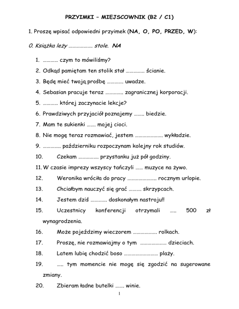 PRZYIMKI – MIEJSCOWNIK (B2 / C1) 1. Proszę wpisać odpowiedni przyimek (NA, O, PO, PRZED, W): 0. Książka leży ………………. stole. NA 1. ………… czym to mówiliśmy? 2. Odkąd pamiętam ten stolik stał …………… ścianie. 3. Będę mieć twoją prośbę …………. uwadze. 4. Sebasian pracuje teraz ………….. zagranicznej korporacji. 5. ………… której zaczynacie lekcje? 6. Prawdziwych przyjaciół poznajemy …….. biedzie. 7. Mam te sukienki ……. mojej cioci. 8. Nie mogę teraz rozmawiać, jestem …………………. wykładzie. 9. ………….. październiku rozpoczynam kolejny rok studiów. 10. Czekam ……………. przystanku już pół godziny. 11. W czasie imprezy wszyscy tańczyli …… muzyce na żywo. 12. Weronika wróciła do pracy ………………….. rocznym urlopie. 13. Chciałbym nauczyć się grać ………. skrzypcach. 14. Jestem dziś …………. doskonałym nastroju!! 15. Uczestnicy konferencji otrzymali ….. 500 zł wynagrodzenia. 16. Może pojeździmy wieczorem ………………. rolkach. 17. Proszę, nie rozmawiajmy o tym ………………… dzieciach. 18. Latem lubię chodzić boso ……………………… plaży. 19. ….. tym momencie nie mogę się zgodzić na sugerowane zmiany. 20. Zbieram ładne butelki ……. winie. 1 21. Mój szef zbyt często wymaga, żebym pracował ……….. godzinach. 22. …………….. Basi wyglądam o wiele młodziej. 23. Co dostałeś …… prezencie od kolegów? 2. Proszę przekształcić poniższe zdania, używając przyimków łączących się z miejscownikiem: 1. Zjem obiad i pójdę do kina. …………………………………………………………………………………………………………………………… 2. Mąż pomaga mi prowadzić dom. …………………………………………………………………………………………………………………………… 3. Zenek ma dziś zły humor. …………………………………………………………………………………………………………………………… 4. Dostałem mieszkanie dziadka. …………………………………………………………………………………………………………………………… 5. Jutro na zebraniu poruszymy ten problem. …………………………………………………………………………………………………………………………… Przyg.: Joanna Głóczyńska Odpowiedzi: Zadanie 1. 1. o, 2. przy, 3. na, 4. w, 5. o, 6. w, 7. po, 8. na, 9. w, 10. na, 11. przy, 12. po, 13. na, 14. w, 15. po, 16. na, 17. przy, 18. po, 19. w, 20. po, 21. po, 22. przy, 23. w. Zadanie 2. 1. Po zjedzeniu obiadu / Po obiedzie pójdę do kina. 2. Mąż pomaga mi w/przy prowadzeniu domu. 3. Zenek jest dziś w złym humorze. 4. Dostałem mieszkanie po dziadku. 5. Jutro porozmawiamy o tym problemie. 2