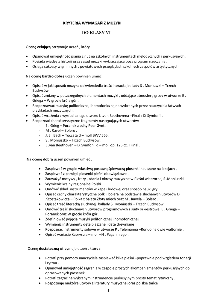 KRYTERIA WYMAGAŃ Z MUZYKI DO KLASY VI Ocenę celującą otrzymuje uczeń , który Opanował umiejętność grania z nut na szkolnych instrumentach melodycznych i perkusyjnych . Posiada wiedzę z historii oraz zasad muzyki wykraczająca poza program nauczania . Osiąga sukcesy w gminnych , powiatowych przeglądach szkolnych zespołów artystycznych. Na ocenę bardzo dobrą uczeń powinien umieć : Opisać w jaki sposób muzyka odzwierciedla treść literacką ballady S . Moniuszki – Trzech Budrysów . Opisać zmiany w poszczególnych elementach muzyki , oddające atmosferę grozy w utworze E . Griega – W grocie króla gór . Rozpoznawać muzykę polifoniczną i homofoniczną na wybranych przez nauczyciela łatwych przykładach muzycznych . Opisać wrażenia z wysłuchanego utworu L .van Beethovena –Finał z IX Symfonii . Rozpoznać charakterystyczne fragmenty następujących utworów: - E . Grieg – Poranek z suity Peer Gynt . - M . Ravel – Bolero . - J. S . Bach – Toccata d – moll BWV 565. - S . Moniuszko – Trzech Budrysów . - L .van Beethoven – IX Symfonii d – moll op .125 cz. I Finał . Na ocenę dobrą uczeń powinien umieć : Zaśpiewać w grupie właściwą postawą śpiewaczą piosenki nauczane na lekcjach . Zaśpiewać z pamięci piosenki pieśni obowiązkowe . Zauważyć motywy , frazy , zdania i okresy muzyczne w Pieśni wieczornej S .Moniuszki . Wymienić krainy regionalne Polski . Omówić skład instrumentów w kapeli ludowej oraz sposób nauki gry . Opisać cechy charakterystyczne polki i bolera na podstawie słuchanych utworów D .Szostakowicza – Polka z baletu Złoty miech oraz M . Ravela – Bolero . Opisać treść literacką słuchanej ballady S . Moniuszki – Trzech Budrysów . Omówić treść słuchanych utworów programowych z suity orkiestrowej E . Griega – Poranek oraz W grocie króla gór . Zdefiniować pojęcia muzyki polifonicznej i homofonicznej . Wymienić instrumenty dęte blaszane i dęte drewniane Rozpoznać instrumenty solowe w utworze P . Telemanna –Rondo na dwie waltornie . Opisać wariacje Kaprysu a – moll –N . Paganiniego . Ocenę dostateczną otrzymuje uczeń , który : Potrafi przy pomocy nauczyciela zaśpiewać kilka pieśni –poprawnie pod względem tonacji i rytmu . Opanował umiejętność zagrania w zespole prostych akompaniamentów perkusyjnych do opracowanych piosenek . Potrafi zagrać na wybranym instrumencie perkusyjnym prosty temat rytmiczny . Rozpoznaje niektóre utwory z literatury muzycznej oraz polskie tańce 1