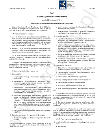 Dziennik Ustaw Nr 83 — 7252 — Elektronicznie podpisany przez Mariusz Lachowski Data: 2010.05.17 17:46:58 +02'00' Poz. 542 .go v.p l 542 ROZPORZĄDZENIE RADY MINISTRÓW z dnia 30 kwietnia 2010 r. w sprawie planów ochrony infrastruktury krytycznej Na podstawie art. 6 ust. 7 ustawy z dnia 26 kwietnia 2007 r. o zarządzaniu kryzysowym (Dz. U. Nr 89, poz. 590, z późn. zm.1)) zarządza się, co następuje: § 1. Rozporządzenie określa: 1) sposób tworzenia, aktualizacji oraz strukturę planów ochrony infrastruktury krytycznej opracowywanych przez właścicieli oraz posiadaczy samoistnych i zależnych obiektów, instalacji lub urządzeń infrastruktury krytycznej, zwanych dalej „operatorami infrastruktury krytycznej”; 2) warunki i tryb uznania spełnienia obowiązku posiadania planu odpowiadającego wymogom planu ochrony infrastruktury krytycznej. § 2. 1. Plan ochrony infrastruktury krytycznej, zwany dalej „planem”, sporządza się w postaci papierowej i elektronicznej. 3. Elementami struktury planu są: 1) dane ogólne: a) obejmujące nazwę i lokalizację infrastruktury krytycznej, ww w. b) pozwalające zidentyfikować operatora infrastruktury krytycznej: nazwa, adres i siedziba, numery REGON, NIP i KRS, c) pozwalające zidentyfikować zarządzającego przedsiębiorstwem w imieniu operatora infrastruktury krytycznej: nazwa, adres i siedziba, numery REGON, NIP i KRS, d) obejmujące w zakresie niezbędnym do realizacji zadań wynikających z ustawy z dnia 26 kwietnia 2007 r. o zarządzaniu kryzysowym, zwanej dalej „ustawą” — dane służbowe osoby, o której mowa w art. 6 ust. 5a ustawy, odpowiedzialnej za utrzymywanie kontaktów z podmiotami właściwymi w zakresie ochrony infrastruktury krytycznej, e) obejmujące imię i nazwisko osoby sporządzającej plan; 2) dane infrastruktury krytycznej obejmujące: a) charakterystykę i podstawowe parametry techniczne, 1) c) funkcjonalne połączenia z innymi obiektami, instalacjami, urządzeniami lub usługami; 3) charakterystyka: a) zagrożeń dla infrastruktury krytycznej oraz oceny ryzyka ich wystąpienia wraz z przewidywanymi scenariuszami rozwoju zdarzeń, b) zależności infrastruktury krytycznej od pozostałych systemów infrastruktury krytycznej oraz możliwości zakłócenia jej funkcjonowania w wyniku zakłóceń powstałych w pozostałych systemach infrastruktury krytycznej, c) zasobów własnych możliwych do wykorzystania w celu ochrony infrastruktury krytycznej, d) zasobów właściwych terytorialnie organów, możliwych do wykorzystania w celu ochrony infrastruktury krytycznej; 4) zasadnicze warianty: rcl 2. Plan w postaci elektronicznej sporządza się z wykorzystaniem standardowego oprogramowania komputerowego, umożliwiającego przenoszenie, kopiowanie i wymianę danych. b) plan (mapę) z naniesieniem lokalizacji obiektów, instalacji lub systemu, Zmiany wymienionej ustawy zostały ogłoszone w Dz. U. z 2009 r. Nr 11, poz. 59, Nr 65, poz. 553, Nr 85, poz. 716 i Nr 131, poz. 1076. a) działania w sytuacji zagrożenia lub zakłócenia funkcjonowania infrastruktury krytycznej, b) zapewnienia ciągłości funkcjonowania infrastruktury krytycznej, c) odtwarzania infrastruktury krytycznej; 5) zasady współpracy z właściwymi miejscowo: a) centrami zarządzania kryzysowego, b) organami administracji publicznej. 4. Plan podpisuje operator infrastruktury krytycznej. 5. Operator infrastruktury krytycznej może zawrzeć w planie inne elementy niewymienione w ust. 3, biorąc pod uwagę specyfikę infrastruktury krytycznej lub charakterystykę zagrożeń. 6. Do planu stosuje się przepisy o ochronie informacji niejawnych lub o ochronie tajemnicy przedsiębiorstwa. § 3. Operator infrastruktury krytycznej sporządza plan w terminie 9 miesięcy od daty otrzymania od dyrektora Rządowego Centrum Bezpieczeństwa, zwanego dalej „dyrektorem Centrum”, informacji o ujęciu w wykazie, o której mowa w art. 5b ust. 7 pkt 4 ustawy. § 4. 1. Plan wymaga uzgodnienia: 1) w zakresie ich dotyczącym z właściwymi terytorialnie: a) wojewodą, Dziennik Ustaw Nr 83 — 7253 — Poz. 542 5. Podmioty, o których mowa w ust. 1, są uprawnione do poprawiania w planie oczywistych pomyłek. c) komendantem wojewódzkim Policji, 6. Operator infrastruktury krytycznej przedkłada plan wraz z arkuszem uzgodnień do zatwierdzenia dyrektorowi Centrum w terminie 14 dni od daty dokonania ostatniego uzgodnienia. .go v.p l b) komendantem wojewódzkim Państwowej Straży Pożarnej, d) dyrektorem regionalnego zarządu gospodarki wodnej, e) wojewódzkim inspektorem nadzoru budowlanego, f) wojewódzkim lekarzem weterynarii, g) państwowym wojewódzkim inspektorem sanitarnym, h) dyrektorem urzędu morskiego; 7. W przypadku braku uzgodnienia ze względu na rozbieżność stanowisk, operator infrastruktury krytycznej przedkłada plan wraz z protokołem rozbieżności do zatwierdzenia dyrektorowi Centrum w terminie 14 dni od daty zakończenia uzgodnień ze wszystkimi podmiotami, o których mowa w ust. 1. 2) z ministrem lub kierownikiem urzędu centralnego, we właściwości którego znajduje się system, do którego została zaliczona dana infrastruktura krytyczna. 8. Dyrektor Centrum, po rozpatrzeniu ewentualnych rozbieżności, zatwierdza plan w terminie 90 dni od daty przedłożenia. Przepisy ust. 3—5 stosuje się odpowiednio. 2. Uzgodnienie następuje przez podpisanie arkusza uzgodnień przez: § 5. 1. Aktualizacja planów odbywa się w zależności od potrzeb, nie rzadziej jednak niż raz na dwa lata. 1) podmiot, o którym mowa w ust. 1 pkt 1 — w terminie 14 dni od daty otrzymania przez niego planu; 2. Wprowadzone zmiany wymagają uzgodnienia i zatwierdzenia, w trybie określonym w § 4. 2) ministra lub kierownika urzędu centralnego, o których mowa w ust. 1 pkt 2 — w terminie 45 dni od daty przedłożenia planu. § 6. 1. Operator infrastruktury krytycznej, który jest w posiadaniu innego planu, opracowanego na podstawie przepisów odrębnych i od