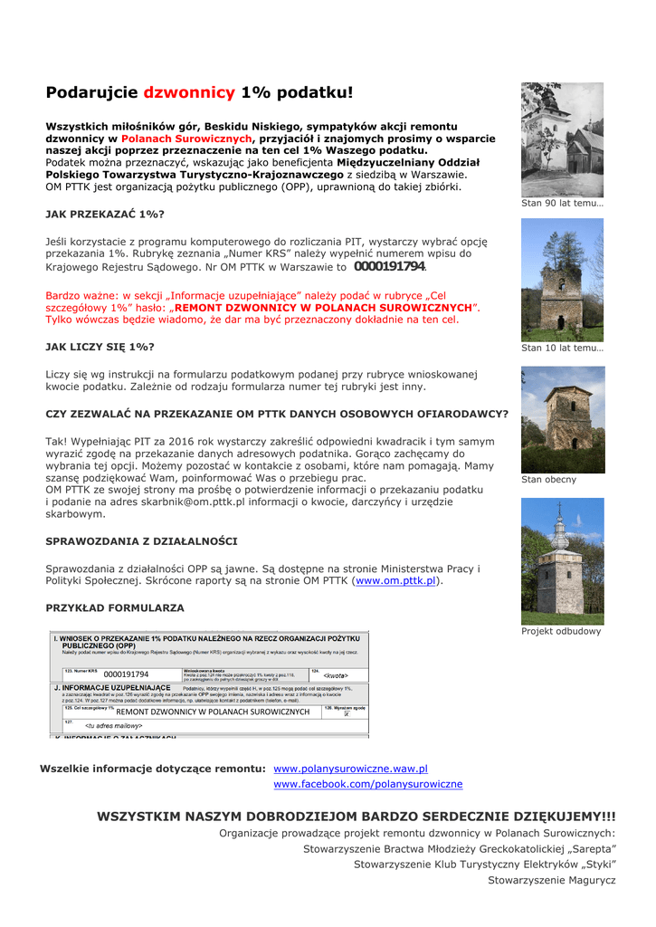 Podarujcie dzwonnicy 1% podatku! Wszystkich miłośników gór, Beskidu Niskiego, sympatyków akcji remontu dzwonnicy w Polanach Surowicznych, przyjaciół i znajomych prosimy o wsparcie naszej akcji poprzez przeznaczenie na ten cel 1% Waszego podatku. Podatek można przeznaczyć, wskazując jako beneficjenta Międzyuczelniany Oddział Polskiego Towarzystwa Turystyczno-Krajoznawczego z siedzibą w Warszawie. OM PTTK jest organizacją pożytku publicznego (OPP), uprawnioną do takiej zbiórki. Stan 90 lat temu… JAK PRZEKAZAĆ 1%? Jeśli korzystacie z programu komputerowego do rozliczania PIT, wystarczy wybrać opcję przekazania 1%. Rubrykę zeznania „Numer KRS” należy wypełnić numerem wpisu do Krajowego Rejestru Sądowego. Nr OM PTTK w Warszawie to 0000191794. Bardzo ważne: w sekcji „Informacje uzupełniające” należy podać w rubryce „Cel szczegółowy 1%” hasło: „REMONT DZWONNICY W POLANACH SUROWICZNYCH”. Tylko wówczas będzie wiadomo, że dar ma być przeznaczony dokładnie na ten cel. JAK LICZY SIĘ 1%? Stan 10 lat temu… Liczy się wg instrukcji na formularzu podatkowym podanej przy rubryce wnioskowanej kwocie podatku. Zależnie od rodzaju formularza numer tej rubryki jest inny. CZY ZEZWALAĆ NA PRZEKAZANIE OM PTTK DANYCH OSOBOWYCH OFIARODAWCY? Tak! Wypełniając PIT za 2016 rok wystarczy zakreślić odpowiedni kwadracik i tym samym wyrazić zgodę na przekazanie danych adresowych podatnika. Gorąco zachęcamy do wybrania tej opcji. Możemy pozostać w kontakcie z osobami, które nam pomagają. Mamy szansę podziękować Wam, poinformować Was o przebiegu prac. OM PTTK ze swojej strony ma prośbę o potwierdzenie informacji o przekazaniu podatku i podanie na adres [email protected] informacji o kwocie, darczyńcy i urzędzie skarbowym. Stan obecny SPRAWOZDANIA Z DZIAŁALNOŚCI Sprawozdania z działalności OPP są jawne. Są dostępne na stronie Ministerstwa Pracy i Polityki Społecznej. Skrócone raporty są na stronie OM PTTK (www.om.pttk.pl). PRZYKŁAD FORMULARZA Projekt odbudowy 0000191794 REMONT DZWONNICY W POLANACH SUROWICZNYCH Wszelkie informacje dotyczące remontu: www.polanysurowiczne.waw.pl www.facebook.com/polanysurowiczne WSZYSTKIM NASZYM DOBRODZIEJOM BARDZO SERDECZNIE DZIĘKUJEMY!!! Organizacje prowadzące projekt remontu dzwonnicy w Polanach Surowicznych: Stowarzyszenie Bractwa Młodzieży Greckokatolickiej „Sarepta” Stowarzyszenie Klub Turystyczny Elektryków „Styki” Stowarzyszenie Magurycz