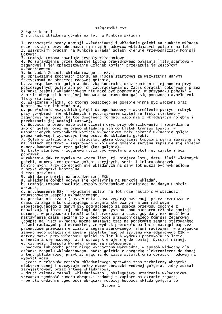 załączniki.txt Załącznik nr 1 Instrukcja wkładania gołębi na lot na Punkcie Wkładań 1. Rozpoczęcie pracy Komisji wkładaniowej i wkładanie gołębi na punkcie wkładań moŜe nastąpić przy obecności minimum 6 hodowców wkładających gołębie na lot. 2. Wszystkimi pracami na Punkcie Wkładań gołębi kieruje Przewodniczący Komisji Lotowej. 3. Komisja Lotowa powołuje Zespoły Wkładaniowe. 4. Po sprawdzeniu przez Komisję Lotową prawidłowego opisania listy startowo – zegarowej i jej opieczętowaniu Członek Komisji przekazuje ją Zespołowi Wkładaniowemu. 5. Do zadań Zespołu Wkładaniowego naleŜy : a. sprawdzanie zgodności zapisu na liście startowej ze wszystkimi danymi faktycznymi na obrączce rodowej gołębia, b. zaobrączkowanie gołębia obrączką kontrolną oraz zapisanie jej numeru przy poszczególnych gołębiach po ich zaobrączkowaniu. Zapis obrączki dokonywany przez członka Zespołu Wkładaniowego nie moŜe być poprawiany. W przypadku pomyłki w zapisie obrączki kontrolnej hodowca ma prawo domagać się ponownego wypełnienia listy startowej, c. wskazanie klatki, do której poszczególne gołębie winne być włoŜone oraz kontrolowanie ich włoŜenia, d. po włoŜeniu wszystkich gołębi danego hodowcy – wykreślenie pustych rubryk przy gołębiach nie wkładanych i podpisywanie czytelnie listy startowo – zegarowej na kaŜdej kartce dowolnego formatu wspólnie z wkładającym gołębie i przekazanie jej Komisji Lotowej, 6. Hodowca ma prawo osobiście uczestniczyć przy obrączkowaniu i sprawdzaniu swoich gołębi oraz ma prawo wkładania ich do klatek transportowych, w uzasadnionych przypadkach komisja wkładaniowa moŜe zakazać wkładania gołębi przez hodowcę i wyznaczyć inną osobę do wkładania gołębi. 7. Gołębie zaliczone do mistrzostw, gdzie obowiązuje typowana seria zapisuje się na listach startowo – zegarowych w kolumnie gołębie seryjne zapisuje się kolejno numery komputerowe tych gołębi (kod gołębia). 8. Listy startowo - zegarowe muszą być wypełnione czytelnie, czysto i bez poprawek w zakresie jak to wynika ze wzoru list, tj. miejsce lotu, data, ilość włoŜonych gołębi, numery komputerowe gołębi seryjnych, serii i koloru obrączek kontrolnych. Przy gołębiach nie wkładanych na dany lot muszą być wykreślone rubryki obrączki kontrolne i czas przylotu. 9. Wkładanie gołębi na urządzeniach ESK a. wkładanie gołębi odbywa się komisyjnie na Punkcie Wkładań, b. Komisja Lotowa powołuje Zespoły Wkładaniowe działające na danym Punkcie Wkładań, c. uruchomienie ESK i wkładanie gołębi na lot moŜe nastąpić w obecności dwuosobowego Zespołu Wkładaniowego, d. przekazanie czasu (nastawienia czasu zegara) następuje przez przekazanie czasu do zegara konstatującego z zegara sterowanym falami radiowymi współpracującego z danym ESK podłączonego za pomocą przewodu zgodnie z obowiązującą instrukcją obsługi danego systemu, pod nadzorem członka Komisji Lotowej. W przypadku niemoŜliwości przekazania czasu gdy dany ESK umoŜliwia nastawienie czasu ręcznie to w obecności przewodniczącego Komisji Zegarowej (podpis na liści wkładań) moŜna nastawić czas na podstawie zegara sterowanego falami radiowymi pod warunkiem, Ŝe wydruk protokołu po locie nastąpi poprzez przewodowe przekazanie czasu z zegara sterowanego falami radiowymi, w przypadku samowolnego odłączenia zegara satelitarnego od systemu wkaładaniowego ESK – anteny matki przy wkładaniu gołębi na lot lub wydruku protokołu po locie uniewaŜnia się hodowcy lot i sprawę kieruje się do Komisji Dyscyplinarnej. e. czynności Zespołu Wkładaniowego są następujące : - hodowca lub osoba przez niego wyznaczona wprowadza, w sposób widoczny dla członka zespołu wkładaniowego, nóŜkę gołębia z obrączką elektroniczną do danej anteny wkładaniowej przytrzymując ją do czasu wyświetlenia obrączki rodowej na wyświetlaczu, - jeden z członków zespołu wkładaniowego sprawdza stan techniczny obrączki elektronicznej i odczytuje pełny numer obrączki rodowej gołębia, który został zarejestrowany przez antenę wkładaniową, - drugi członek zespołu wkładaniowego , obsługujący urządzenie wkładaniowe, sprawdza zgodność numeru obrączki rodowej z zapisem na ekranie zegara, - po stwierdzeniu zgodności obrączki rodowej hodowca wkłada gołębia do Strona 1 załączniki.txt wyznaczonej klatki. f. w przypadku konieczności zmiany elektronicznej obrączki kontrolnej jednemu lub większej ilości gołębi w trakcie trwania sezonu lotowego naleŜy na wniosek hodowcy komisyjnie wykasować przyporządkowaną zgubioną lub zdefektowaną elektroniczną obrączkę kontrolną i przyporządkować nową zgodnie instrukcją danego systemu ESK. Przypadkami tymi mogą być : - zgubienie obrączki (powrót gołębia z lotu bez obrączki) – fakt ten winien być zgłoszony Zespołowi Wkładaniowemu przed rozpoczęciem wkładania gołębi na dany lot. Nie dopełnienie tego obowiązku wyklucza udział tego gołębia w tym locie. - uszkodzenie mechaniczne, - utrata zdolności rejestrowania, Wszelkie zmiany w spisie przyporządkowania obrączek ESK muszą być potwierdzone wydrukiem, który podpisany przez Zespół Wkładaniowy zabezpiecza Komisja Lotowa. Protokół przyporządkowania obrączki elektronicznej przed sezonem naleŜy dołączyć do dokumentacji polotowej źródłowej, natomiast protokół przyporządkowania nowej obrączki elektronicznej w czasie trwania sezonu lotowego musi być dołączony do listy wkładaniowej danego lotu w którym nastąpiła zmiana. g. w przypadku niezgodności numeru obrączki rodowej gołębia z wyświetlanym numerem na zegarze konstatującym naleŜy obrączkę elektroniczną zdjąć i zabezpieczyć przez Komisję Lotową, a gołębia wycofać z lotu. Fakt ten powinien być odnotowany w liście wkładań. Komisja Lotowa sporządza stosowny protokół i w stosunki do hodowcy naleŜy wszcz