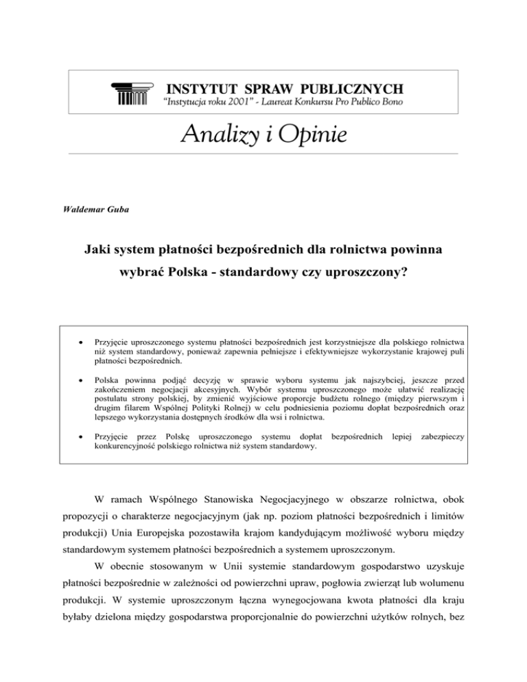 Waldemar Guba Jaki system płatności bezpośrednich dla rolnictwa powinna wybrać Polska - standardowy czy uproszczony? • Przyjęcie uproszczonego systemu płatności bezpośrednich jest korzystniejsze dla polskiego rolnictwa niż system standardowy, ponieważ zapewnia pełniejsze i efektywniejsze wykorzystanie krajowej puli płatności bezpośrednich. • Polska powinna podjąć decyzję w sprawie wyboru systemu jak najszybciej, jeszcze przed zakończeniem negocjacji akcesyjnych. Wybór systemu uproszczonego może ułatwić realizację postulatu strony polskiej, by zmienić wyjściowe proporcje budżetu rolnego (między pierwszym i drugim filarem Wspólnej Polityki Rolnej) w celu podniesienia poziomu dopłat bezpośrednich oraz lepszego wykorzystania dostępnych środków dla wsi i rolnictwa. • Przyjęcie przez Polskę uproszczonego systemu dopłat konkurencyjność polskiego rolnictwa niż system standardowy. bezpośrednich lepiej zabezpieczy W ramach Wspólnego Stanowiska Negocjacyjnego w obszarze rolnictwa, obok propozycji o charakterze negocjacyjnym (jak np. poziom płatności bezpośrednich i limitów produkcji) Unia Europejska pozostawiła krajom kandydującym możliwość wyboru między standardowym systemem płatności bezpośrednich a systemem uproszczonym. W obecnie stosowanym w Unii systemie standardowym gospodarstwo uzyskuje płatności bezpośrednie w zależności od powierzchni upraw, pogłowia zwierząt lub wolumenu produkcji. W systemie uproszczonym łączna wynegocjowana kwota płatności dla kraju byłaby dzielona między gospodarstwa proporcjonalnie do powierzchni użytków rolnych, bez Jaki system płatności bezpośrednich powinna wybrać Polska – standardowy czy uproszczony? względu na rodzaj produkcji rolnej. Prowadzenie produkcji nie byłoby warunkiem uzyskania przez gospodarstwo płatności uproszonych, nie byłoby też wymagane ugorowanie części (obecnie 10%) użytków rolnych w dużych gospodarstwach (powyżej 92 ton potencjalnej produkcji zbóż). Ziemia rolnicza musiałaby być jednak utrzymywana w odpowiedniej kulturze i zgodnie z wymogami ochrony środowiska. Kraje kandydujące miałyby możliwość stosowania systemu uproszczonego przez trzy lata z możliwością przedłużenia o kolejne 2 lata lub przejścia na system standardowy nawet po roku stosowania uproszczonego systemu. Dlaczego UE zaproponowała krajom kandydującym przyjęcie systemu uproszczonego? Analizując propozycję Unii Europejskiej wskazać można na kilka istotnych motywów. Po pierwsze, biorąc pod uwagę swoje doświadczenia w zakresie wdrażania i funkcjonowania systemu standardowego, strona unijna może podejrzewać, iż Polsce nie uda się w zakładanym terminie osiągnąć stanu gotowości do efektywnego zastosowania systemu standardowego (zarówno jeśli chodzi o przygotowanie instytucji jak i rolników). Tymczasem stopień wykorzystania płatności bezpośrednich przez kraje kandydackie byłby szczególnie istotny w sytuacji proponowanego niższego poziomu tych płatności. Po drugie, zgodnie z propozycjami Przeglądu Średniookresowego Agendy 2000 (Midterm Review) można było spodziewać się, że podobny system uproszczony zostanie przyjęty w krajach UE-15. Już w 2002 roku Unia wprowadziła pilotażowy uproszczony system płatności dla „małych gospodarstw” (Small-farmer scheme) uzyskujących rocznie nie więcej niż 1250 Euro płatności. UE podkreśla jednak, że w przypadku przyjęcia systemu standardowego polscy rolnicy nie mogliby korzystać z tego udogodnienia z uwagi na brak danych historycznych dotyczących kwot płatności dla poszczególnych gospodarstw. Po trzecie, płatności w systemie uproszczonym proponowane krajom kandydackim klasyfikowane byłyby w ramach WTO jako niezwiązane z produkcją (decoupled) i tym samym nie zniekształcające warunków konkurencji na rynkach międzynarodowych. Przyjęcie systemu uproszczonego przez kraje kandydujące ułatwiłoby UE obronę swoich rozwiązań systemowych wspomagających rolnictwo w czasie najbliższej rundy negocjacyjnej WTO dotyczącej liberalizacji polityki i handlu rolnego. Instytut Spraw Publicznych Analizy i Opinie, 3/2002, s. 2 Jaki system płatności bezpośrednich powinna wybrać Polska – standardowy czy uproszczony? Nowy kontekst negocjacyjny Kwestii wyboru systemu płatności bezpośrednich poświęcono w dotychczasowej debacie publicznej niewiele uwagi, a wstępne rekomendacje formułowano w oparciu o bardzo pobieżne rozpoznanie. Tłumaczyć można to tym, iż nie jest to problem stricte negocjacyjny, a Unia pozostawiła krajom kandydującym czas na podjęcie tej decyzji do dnia akcesji. Wydaje się jednak, że sytuacja uległa istotnej zmianie z uwagi na stanowisko unijne forsujące niski poziom płatności bezpośrednich w pierwszych latach po akcesji oraz polski postulat łagodzenia nierównych warunków konkurencji wynikających z niepełnych płatności. Polski postulat dotyczący wyjściowych proporcji między pierwszym i drugim filarem Wspólnej Polityki Rolnej jest ściśle powiązany z możliwością zastosowania uproszczonego systemu płatności bezpośrednich. Jednym z postulowanych przez stronę polską sposobów łagodzenia nierównych warunków konkurencji jest bowiem częściowe przybliżenie proporcji wykorzystania środków w ramach proponowanego budżetu rolnictwa do tych w krajach Piętnastki. Środki przeznaczone na drugi filar Wspólnej Polityki Rolnej (tzw. działania służące rozwojowi obszarów wiejskich, które są dużo trudniejsze w absorpcji), stanowią tam niespełna 10% budżetu, natomiast w proponowanym budżecie dla krajów kandydujących stanowią około 50%. W polskiej propozycji chodzi więc nie tylko o podniesienie poziomu płatności bezpośrednich (najważniejszy element pierwszego filaru WPR) kosztem tymczasowego zmniejszenia środków przewidzianych na drugi filar WPR, ale przede wszystkim o zapewnienie pełnej i efektywnej absorpcji środków 
