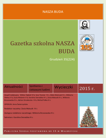 NASZA BUDA NASZA Gazetka szkolna NASZA BUDA Grudzień 35(224) Aktualności Spotkania z ciekawymi ludźmi Wycieczki Zespół redakcyjny: Wiktor Dębski VI b, Sara Tesmer IV c, Aleks Mańczak IV c, Wiktoria Oleksy V b, Zuzia Wolanin V b, Karolina Sieradzka IV c, Zosia Matusik IV c, Wiktoria Brzozowska IV c, Adrian Strzałeczka VI b, Michał Pałka IV c OPIEKUN: Anna Świerczyńska Redaktor naczelny: Zosia Matusik IV c Zastępca redaktora naczelnego: Wiktoria Brzozowska IV c Sekretarz: Karolina Sieradzka IV c PUBLICZNA SZKOŁA PODSTAWOWA NR 15 W WAŁBRZYCHU 2015 r. Gazetka szkolna NASZA BUDA Cześć! Oto przed Wami specjalne świąteczne wydanie gazetki szkolnej. W tym wydaniu będą wierszyki o świętach, przepisy na przepyszne dania wigilijne oraz mnóstwo śmiesznych dowcipów. To ostatni numer gazetki przed świętami, więc cała Redakcja życzy wszystkim wesołych świąt, wspaniałych prezentów i wspólnych chwil spędzonych z rodziną. Redakcja gazetki Gazetka szkolna NASZA BUDA Czy wiesz jak obchodzi się święta Bożego Narodzenia w innych krajach? Jeśli nie, to musisz koniecznie przeczytać mój artykuł. Anglia Dzieci w Anglii dla Mikołaja zostawiają ciasteczka z nadzieniem, dla jego reniferów marchewkę i miskę z wodą, a na kominku wieszają skarpety na prezenty. Potrawy, które najczęściej jedzą Anglicy to pieczony indyk, ziemniaki, brukselki i świąteczny pudding. Szwecja W Szwecji przed Bożym Narodzeniem domy zdobi się czerwonymi kwiatami, gwiazdą betlejemską i obowiązkowo tulipanami. Do dzieci nie przychodzi Mikołaj tylko Jultone, czyli świąteczny krasnoludek. Włochy Po włosku Boże Narodzenie to Il Natale. Na świątecznym stole mieści się 13 potraw, które głównie są zrobione z ryb i owoców morza. Choinkę we Włoszech ubiera się już 8 grudnia. Kolumbia Od 8 grudnia mieszkańcy Kolumbii śpiewają i tańczą na ulicach. Bożego Narodzenia w Kolumbii się nie obchodzi, tylko w ten dzień są organizowane huczne zabawy. Filipiny Świętowanie świąt zaczyna się już w listopadzie, gdy ludzie domy przystrajają kwiatami i liśćmi palmowymi. Dziewięć dni przed Bożym Narodzeniem mieszkańców Filipin budzi dziwię trąbki, który zaprasza ich do udziału w Mszy Świętej. Meksyk W Meksyku Boże Narodzenie obchodzi się 9 dni wcześniej niż w Polsce. Ludzie chodzą od domu do domu śpiewając radosne pieśni. Dzieci w Meksyku prezenty znajdują w kubkach z mąką lub piaskiem pod sufitem. Jeden z prezentów to dla nich niespodzianka, a dziecko musi odgadnąć który. Sara Tesmer kl. IV c Gazetka szkolna NASZA BUDA Choinka kojarzy Wam się pewnie ze świętami i wigilią. To macie rację. Myślę, że każdy z Was w wigilię lub kilka dni wcześniej ubiera choinkę, a potem otwiera prezenty, które znajdują się pod nią. Duża część ludzi uważa, że bez choinki nie ma świąt. A pomysłów na to jak choinka wygląda, z roku na rok nam przybywa… Wesołych świąt! Julia Panek Gazetka szkolna NASZA BUDA Krasnale i elfy Gotowe stoją, Już worek pełny na saniach czeka, Czemu Mikołaj drapie się w głowę? Co go tak martwi i na co czeka? A on tak liczy w głowie I mierzy Czy brzuch mu się zmieści W komina wieży! Więc jeśli znajdziesz prezent na dachu, Znaczy że wąski masz komin mój brachu! Zosia Matusik i Julia Panek Gazetka szkolna NASZA BUDA Adwent W Kościołach Katolickich okres trwający od I nieszporów czwartej z kolei poprzedzającej Święto Bożego Narodzenia niedzieli do zmierzchu 24 grudnia, okres przypominający oczekiwanie na powtórne przyjście Jezusa Chrystusa. Jednocześnie jest to czas poprzedzający pamiątkę pierwszego przyjścia – wcielenia, znanego pod nazwą narodzin Chrystusa. Na adwent składają się cztery niedziele adwentowe. W pierwszą z nich rozpoczyna się w Kościele Chrześcijańskich rok liturgicznym. Adwent to czas, w którym ewangeliccy katolicy mają uświadomić sobie, że oczekują na powtórne przyjście Jezusa Chrystusa. W okresie adwentu dominuje w liturgii kolor fioletowy. Kolorem tym w Kościołach ewangelickich nakrywa się ołtarz. W kościele katolickim kapłan zakłada do mszy świętej ornat w kolorze fioletowym, symbolizującym czas pokuty i przygotowania się do jednego z najważniejszych świąt, czasu pojednania z Bogiem i ludźmi, a w trzecią niedzielę różowy, który może być zastąpiony fioletowym. W Kościołach ewangelickich odprawiane są w tym czasie nabożeństwa adwentowe. Tradycją w Kościele katolickim są odprawiane w tym okresie o świcie msze, zwane roratami. Są to msze ku Maryi panny na pamiątkę tego, że przyjęła nowinę od Gabriela archanioła , zwiastującego, iż zostanie Matką Syna Bożego. Adwent, z punktu widzenia liturgii Kościoła katolickiego, można podzielić na dwa okresy: od początku adwentu do 16 grudnia (czas szczególnego oczekiwania na powtórne przyjście Jezusa Chrystusa na końcu czasów); od 17 grudnia do 24 grudnia (czas bezpośredniego przygotowania do uroczystości Narodzenia Pańskiego). Przygotował dla Was Michał Pałka IV c Gazetka szkolna NASZA BUDA Czerwony barszcz do picia Ten barszcz można przechowywać w lodówce w słoikach albo w butelkach bardzo długo, a nie trzeba go pasteryzować. Jest gotowy do picia, ale można do niego dodać śmietany rozrobionej z mąką i zrobić barszcz zabielany. Składniki 2 łyżeczki soli 3 łyżki cukru 1 opakowanie kminku 1 kg czerwonych buraków 1/2 kg marchewki 2 korzenie pietruszki 3 cebule pół niewielkiego selera pół główki czosnku kromka chleba razowego (opcjonalnie) Sposób przygotowania Przygotowanie: 30min. › +5dni fermentowanie › Gotowe w: 5dni30min. 1. Zagotować 10 litrów wody z dodatkiem 2 małych łyżek soli, 2-3 łyżek cukru i torebką kminku. Przestudzić - zalewa ma być letnia lub całkiem chłodna. 2. Jarzyny umyć, obrać i drobno pokroić lub zetrzeć na grubym tarle. Czosnek obrać. Cebulę drobno posiekać. 3. Zalać jarzyny, czosnek i c