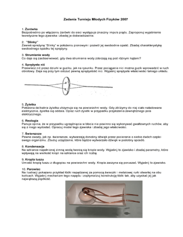=DGDQLD7XUQLHMX0áRG\FK)L]\NyZ 1. )DUyZND %H]SR UHGQLRSRZá F]HQLX*DUyZNLGRVLHFLZ\VW SXMH]QDF]Q\LPSXOVSUGX=DSURSRQXMZ\MDnienie WHRUHW\F]QHWHJR]MDZLVNDL]EDGDMMHGR ZLDGF]DOQLH 2. ”Slinky” * ³6OLQN\´ZSRáR*HQLXSLRQRZ\PLSR]ZyOMHMVZRERGQLHRSDü=EDGDMFKDUDNWHU\VW\N *\Q\ =DZLH VSUH \Q VZRERGQHJRVSDGNXWHMVSU 3. Strumienie wody &RGDMHVL ]DREVHUZRZDüJG\GZDVWUXPLHQLHZRG\]GHU]DMVL SRGUy*Q\PLNWDPL" 4. 6SU *\VWDQLü JDQLHQLFLPR*QDJX]LNZSURZDG]LüZ ruch SU]\W\PRGF]XüSHZQVSU *\VWRüQLFL:\MDQLMVSU *\VWHZáDFLZRFLWDNLHJRXNáDGX 3U]HZOHF]QLüSU]H]G]LXUNLZJX]LNXMDNQDU\VXQNX3U]H]SRFL REURWRZ\'DMHVL 5. )\OHWND * * 3RáR RQDGHOLNDWQLH \OHWNDXWU]\PXMHVL * QDSRZLHU]FKQLZRG\*G\]EOL*\P\GRQLHMFLDáRQDáDGRZDQH * * WU]QHJRSROD HOHNWU\F]QLH \OHWNDVL RGGDOD2SLV]UXFK \OHWNLZSU]\SDGNXSU]\áR HQLD]HZQ elektrycznego. 6. Reologia * 3DQXMHRSLQLD HZSU]\SDGNXXJU] (QL FLDZEáRFLHQLHSRZLQQRVL Z\NRQ\ZDüJZDáWRZQ\FKUXFKyZDE\ VL ]QLHJRZ\GRVWDü2SUDFXMPRGHOWHJR]MDZLVNDL]EDGDMMHJRZáD FLZR FL 7. ZLHUV]F]H Pewne owady, jaNQSZLHUV]F]HZ\WZDU]DMGRQRQ\G(ZL NSU]H]SRFLHUDQLHRVLHELHGZyFKF] FL VZHJRRUJDQL]PX=EXGXMXU] G]HQLHNWyUHE G]LHZ\WZDU]DáRG(ZL NZSRGREQ\VSRVyE 8. Kondensacja ZRGWZRU]VL NURSOHZRG\:\MDQLMWRzjawisko i zbadaj parametry, które QDZLHONRüNURSOLQDV]NODQFHRUD]LFKOLF]E 1DV]NODQFHQDSHáQLRQHM]LPQ ZSá\ZDM 9. Kropla tuszu 8PLH üNURSO WXV]X]GáXJRSLVXQDSRZLHU]FKQLZRG\.URSOD]DF]\QDVL SRUXV]Dü:\MDQLMWR]MDZLVNR 10. Parowiec G]DQHM]DSRPRFZLHF]NLLPHWDORZHMUXUNLRWZDUWHMQDREX FDFK:\MDQLMPHFKDQL]PWHJRQDS GXL]RSW\PDOL]XMNRQVWUXNFM áyGNLWDNDE\X]\VNDüMHMMDN QDMZL NV]SU GNRü 1DLOXVWUDFMLSRND]DQRSU]\NáDGáyGNLQDS NR 11. Narty wodne GNRüZ\PDJDQDGRWHJRDE\SU]HGPLRWFLJQL W\SU]H]OLQN SRSRZLHU]FKQLZRG\ ZQLHM"=EDGDMLVWRWQHSDUDPHWU\GRZLDGF]DOQLHRUD]WHRUHW\F]QLH -DNDMHVWPLQLPDOQDSU QLH]DQXU]DáVL 12. &LHNáHVRF]HZNL 2SUDFXMXNáDGFLHNá\FKVRF]HZHN]UHJXORZDQ RJQLVNRZ=EDGDMMDNRüRUD]PR*OLZH]DVWRVRZDQLDWHJR XNáDGX 13. Balonik 'RNRQDMSRPLDUX]PLDQZáDVQR FLRSW\F]Q\FKSRZáRNLEDORQLNDSRGF]DVMHJRQDGPXFKLZDQLD 14. 7U] VLHQLH]LHPL =DSURSRQXMPHFKDQL]PNWyU\E\XRGSRUQLáEXG\QNLQDWU] VLHQLD]LHPL:\NRQDMGRZLDGF]HQLDLZ\MDQLM otrzymane wyniki. 15. Dmuchawka =EDGDMUXFKSRFLVNXZHZQ WU]GPXFKDZNLUXU\]NWyUHMZ\GPXFKXMHVL VWU]Dá OXELQQ\SRFLVN2NUHO FXVWDPLX]\VNDüPDNV\PDOQSU GNRüZ\ODWXMFHJR MDNLHZDUXQNLSRZLQQ\E\üVSHáQLRQHDE\GPXFKDM pocisku. 16. Kaskada wodna 8PLH üSRIDáGRZDQ UXU QDSRFK\áRFL3R]ZyOZRG]LHSá\QüSU]H]UXU DQDVW SQLHRVWUR*QLH]DWU]\PDM WHJRXNáDGXJG\GRUXU\E dzie wkraplana woda. MHMSU]HSá\Z=EDGDM]DFKRZDQLHVL 17. Lodowe wybrzuszenie 3R]DPUR*HQLXZRG\ZSHZQ\FKZDUXQNDFKQD Z\EU]XV]HQLH=EDGDMWR]MDZLVNR 1DSHáQLMSODVWLNRZHQDF]\QLHSRMHPQLNQDOyGZRG SRZLHU]FKQLORGXWZRU]\VL