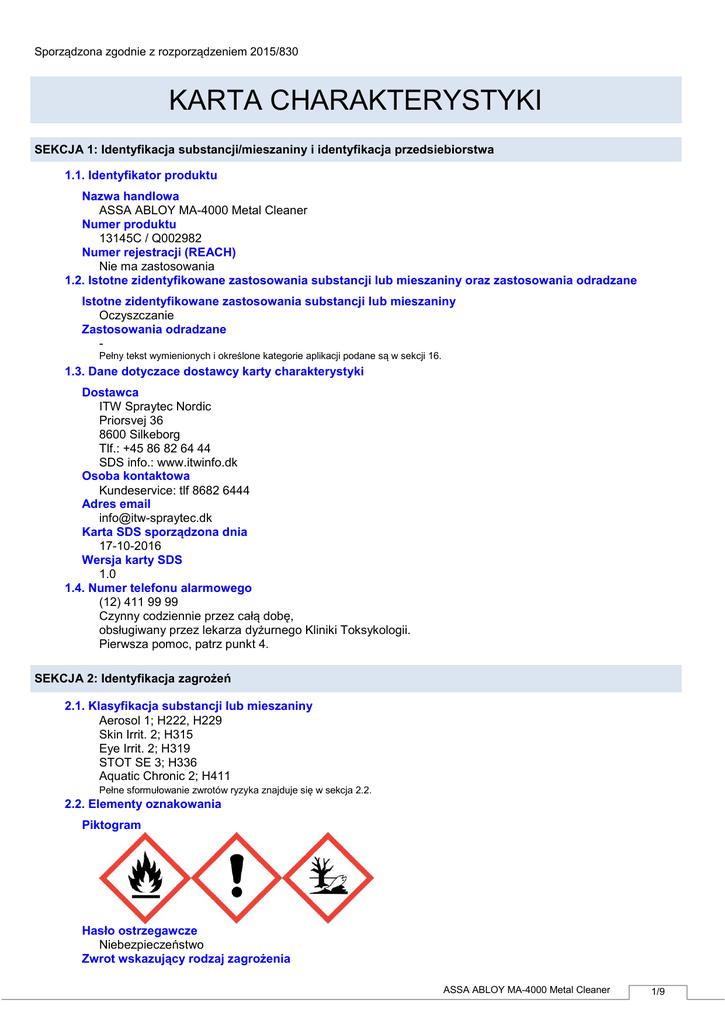 Sporządzona zgodnie z rozporządzeniem 2015/830 KARTA CHARAKTERYSTYKI SEKCJA 1: Identyfikacja substancji/mieszaniny i identyfikacja przedsiebiorstwa 1.1. Identyfikator produktu Nazwa handlowa ASSA ABLOY MA-4000 Metal Cleaner Numer produktu 13145C / Q002982 Numer rejestracji (REACH) Nie ma zastosowania 1.2. Istotne zidentyfikowane zastosowania substancji lub mieszaniny oraz zastosowania odradzane Istotne zidentyfikowane zastosowania substancji lub mieszaniny Oczyszczanie Zastosowania odradzane Pełny tekst wymienionych i określone kategorie aplikacji podane są w sekcji 16. 1.3. Dane dotyczace dostawcy karty charakterystyki Dostawca ITW Spraytec Nordic Priorsvej 36 8600 Silkeborg Tlf.: +45 86 82 64 44 SDS info.: www.itwinfo.dk Osoba kontaktowa Kundeservice: tlf 8682 6444 Adres email [email protected] Karta SDS sporządzona dnia 17-10-2016 Wersja karty SDS 1.0 1.4. Numer telefonu alarmowego (12) 411 99 99 Czynny codziennie przez całą dobę, obsługiwany przez lekarza dyżurnego Kliniki Toksykologii. Pierwsza pomoc, patrz punkt 4. SEKCJA 2: Identyfikacja zagrożeń 2.1. Klasyfikacja substancji lub mieszaniny Aerosol 1; H222, H229 Skin Irrit. 2; H315 Eye Irrit. 2; H319 STOT SE 3; H336 Aquatic Chronic 2; H411 Pełne sformułowanie zwrotów ryzyka znajduje się w sekcja 2.2. 2.2. Elementy oznakowania Piktogram Hasło ostrzegawcze Niebezpieczeństwo Zwrot wskazujący rodzaj zagrożenia ASSA ABLOY MA-4000 Metal Cleaner 1/9 Sporządzona zgodnie z rozporządzeniem 2015/830 Skrajnie łatwopalny aerozol. (H222) Pojemnik pod ciśnieniem: Ogrzanie grozi wybuchem. (H229) Działa drażniąco na skórę. (H315) Działa drażniąco na oczy. (H319) Może wywoływać uczucie senności lub zawroty głowy. (H336) Działa toksycznie na organizmy wodne, powodując długotrwałe skutki. (H411) Zwroty wskazujące środki ostrożności Ogólne Zapobieganie Przechowywać z dala od źródeł ciepła, gorących powierzchni, źródeł iskrzenia, otwartego ognia i innych źródeł zapłonu. Nie palić. (P210). Nie rozpylać nad otwartym ogniem lub innym źródłem zapłonu. (P211). Nie przekłuwać ani nie spalać, nawet po zużyciu. (P251). Stosować wyłącznie na zewnątrz lub w dobrze wentylowanym pomieszczeniu (P271). Stosować rękawice ochronne/odzież ochronną. (P280). Reagowanie Przechowywanie Chronić przed światłem słonecznym. Nie wystawiać na działanie temperatury przekraczającej 50 °C/122 °F. (P410+P412). Usuwanie Zawiera Benzyna lekka obrabiana wodorem (ropa naftowa) (<0,1 % w/w benzene (EINECS No 200-753-7)). 2.3. Inne zagrożenia Produkt zawiera organiczny rozpuszczalnik. Wielokrotne wystawienie na działanie organicznych rozcieńczalników może spowodowań uszkodzenia systemu nerwowego i narządów wewnętrznych, np. wątroby i nerek. Informacje uzupełniające na etykiecie Powtarzające się narażenie może powodować wysuszanie lub pękanie skóry. (EUH066) Inne VOC SEKCJA 3: Skład/ informacja o składnikach 3.1/3.2. Substancje/ Mieszaniny NAZWA: 7)). NUMERY IDENTYFIKACYJNE: ZAWARTOŚĆ: CLP KLASYFIKACJA: NAZWA: NUMERY IDENTYFIKACYJNE: ZAWARTOŚĆ: CLP KLASYFIKACJA: NAZWA: NUMERY IDENTYFIKACYJNE: ZAWARTOŚĆ: CLP KLASYFIKACJA: UWAGA: NAZWA: NUMERY IDENTYFIKACYJNE: ZAWARTOŚĆ: CLP KLASYFIKACJA: UWAGA: Benzyna lekka obrabiana wodorem (ropa naftowa) (<0,1 % w/w benzene (EINECS No 200-753CAS-nr: 64742-49-0 WEr-nr: 265-151-9 Nr indeksowy: 649-328-00-1 60-80% Flam. Liq. 2, STOT SE 3, Skin Irrit. 2, Asp. Tox. 1, Aquatic Chronic 2 H225, H304, H315, H336, H411 Gazy z ropy naftowej, skroplone (<0,1 % w/w 1,3-butadiene (EINECS No. 203-450-8)) CAS-nr: 68476-85-7 WEr-nr: 270-704-2 Nr indeksowy: 649-202-00-6 15-25% Comp. Gas, Flam. Gas 1 H220, H280 acetone CAS-nr: 67-64-1 WEr-nr: 200-662-2 Nr indeksowy: 606-001-00-8 10-15% Flam. Liq. 2, Eye Irrit. 2, STOT SE 3 H225, H319, H336, EUH066 SL carbon dioxide CAS-nr: 124-38-9 WEr-nr: 204-696-9 3-5% Comp. Gas H280 L (*) Pełne sformułowanie zwrotów ryzyka znajduje się w sekcji 16. Wartości graniczne dotyczące higieny pracy wymienione są w sekcji 8, jeśli są dostępne. ASSA ABLOY MA-4000 Metal Cleaner 2/9 Sporządzona zgodnie z rozporządzeniem 2015/830 S = organiczny rozpuszczalnik. Inne informacje Eye Cat. 2 Sum = Sum(Ci/S(G)CLi) = 1,0696 - 1,6044 Skin Cat. 2 Sum = Sum(Ci/S(G)CLi) = 5,3256 - 7,9884 N chronic (CAT 2) Sum = Sum(Ci/M(chronic)i*25*0.1*10^CATi) = 2,13024 - 3,19536 SEKCJA 4: Środki pierwszej pomocy 4.1. Opis środków pierwszej pomocy Ogólnie W razie wypadku: skontaktować się z lekarzem lub pogotowiem – zabrać ze sobą etykietę lub niniejszą kartę bezpieczeństwa. Lekarz może się zwrócić do Kliniki Medycyny Pracy i Środowiska w szpitalu. Jeśli objawy nie ustają, lub jeśli są wątpliwości co do stanu osoby poszkodowanej, trzeba się zwrócić po pomoc lekarską. Nigdy nie podawaj wody ani podobnych płynów osobie nieprzytomnej. Wdychanie Osobę należy umieścić na świeżym powietrzu i trzymać pod obserwacją. Kontakt ze skórą Należy usunąć zanieczyszczone ubranie i obuwie. Skórę, która weszła w kontakt z materiałem, należy umyć dokładnie wodą i mydłem. Można zastosować środki do czyszczenia skóry. NIE używać rozpuszczalników ani rozcieńczalników. Kontakt z oczami Usunąć ewentualne szkła kontaktowe. Natychmiast spłukać wodą (20-30 °C) przez przynajmniej 15 minut. Zawezwać lekarza. Połknięcia Dać osobie dużo płynu do picia i trzymać ją pod obserwacją. W przypadku złego samopoczucia: należy się natychmiast skontaktować z lekarzem i mieć przy sobie niniejszą kartę bezpieczeństwa lub etykietę produktu. Nie należy wywoływać wymiotów, jeśli lekarz tego nie zalecił. Ułożyć głowę nisko, tak, aby w razie wymiotów ich zawartość nie wróciła do ust i gardła. Oparzenie Płukać dużą ilością wody do ustania bólu i kontynuować 30 minut po ustaniu bólu. 4.2. Najważniejsze ostre i opóźnione objawy oraz skutki narażenia Działania neurotoksyczne: produkt 