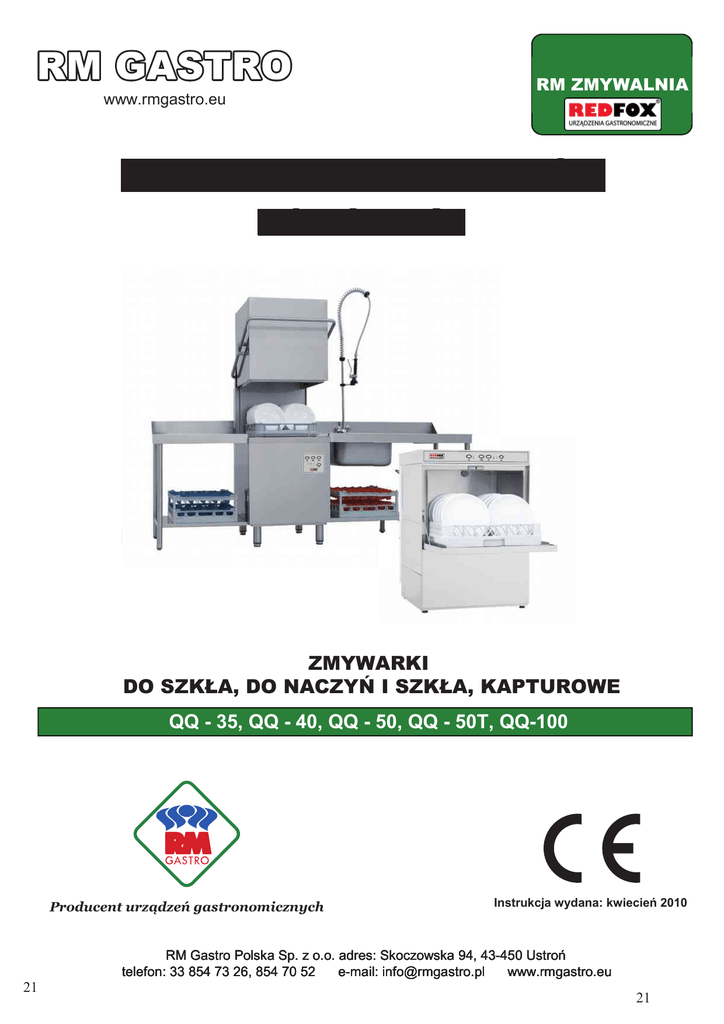 www.rmgastro.eu RM ZMYWALNIA INSTRUKCJA MONTAŻU I OBSŁUGI ZMYWARKI DO SZKŁA, DO NACZYŃ I SZKŁA, KAPTUROWE QQ - 35, QQ - 40, QQ - 50, QQ - 50T, QQ-100 Producent urządzeń gastronomicznych Instrukcja wydana: kwiecień 2010 RM Gastro Polska Sp. z o.o. adres: Skoczowska 94, 43-450 Ustroń telefon: 33 854 73 26, 854 70 52 e-mail: [email protected] www.rmgastro.eu 21 21 INSTRUKCJA OBSŁUGI ZMYWARKI DO NACZYŃ PL SPIS TREŚCI ROZ 1 WPROWADZENIE ...................................................................................................... 2 ROZ 2 INSTALACJA .............................................................................................................. 2 2.1 2.2 2.3 2.4 2.5 2.6 ROZPAKOWANIE ................................................................................................................ 2 WYBÓR MIEJSCA INSTALACJI .............................................................................................. 3 PODŁĄCZENIE ELEKTRYCZNE ............................................................................................. 3 PODŁĄCZENIE HYDRAULICZNE ............................................................................................ 4 PODŁĄCZENIE DO PRZEWODU SPUSTOWEGO ....................................................................... 4 ŚRODEK NABŁYSZCZAJĄCY I DETERGENT ............................................................................ 4 ROZ 3 3.1 ZAGROŻENIA I WAŻNE ZALECENIA ........................................................................ 5 STANDARDOWE WARUNKI EKSPLOATACYJN ......................................................................... 5 ROZ 4 4.1 4.2 4.3 4.4 4.5 4.6 OBSŁUGA URZĄDZENIA ........................................................................................... 6 LEGENDA I SYMBOLE ......................................................................................................... 6 WŁĄCZANIE URZĄDZENIA ................................................................................................... 6 PRZYGOTOWANIE KOSZA ................................................................................................... 6 WYBÓR I URUCHOMIENIE CYKLU ......................................................................................... 6 WYJMOWANIE WBUDOWANEGO FILTRA ............................................................................... 7 OPRÓŻNIANIE URZĄDZENIA ................................................................................................ 7 4.6.1 Urządzenia bez pompy spustowej ..................................................................... 7 4.6.2 Urządzenia z cyklem spustu (*opcjonalny)......................................................... 7 4.7 4.8 ROZ 5 5.1 5.2 5.3 5.4 REGENERACJA ŻYWIC (*OPCJONALNA) ................................................................................ 7 ZAKOŃCZENIE PRACY ........................................................................................................ 8 KONSERWACJA ........................................................................................................ 8 ZASADY OGÓLNE ............................................................................................................... 8 CZYSZCZENIE ................................................................................................................... 8 CZYSZCZENIE ZESPOŁU FILTRUJĄCEGO .............................................................................. 8 CZYSZCZENIE RAMION ZMYWAJĄCYCH ................................................................................ 9 ROZ 6 AUTOMATYCZNA DIAGNOSTYKA ........................................................................... 9 ROZ 7 UTYLIZACJA ............................................................................................................ 10 ROZ 8 OCHRONA ŚRODOWISKA ...................................................................................... 10 Producent zgodnie z prawem zastrzega sobie prawo własności do niniejszego dokumentu i zabrania jego powielania i rozpowszechniania w jakiejkolwiek formie bez swojego uprzedniego pisemnego zezwolenia. Producent zastrzega sobie prawo do wprowadzania dowolnych zmian mających na celu udoskonalenie produktu bez uprzedniego powiadomienia. 442447 M REV00 19-07-2013 U PL Strona 1 z 10 INSTRUKCJA OBSŁUGI ZMYWARKI DO NACZYŃ PL Roz 1 WPROWADZENIE Przestrogi zawarte w niniejszej instrukcji obsługi zawierają ważne wskazówki dotyczące bezpieczeństwa w różnych fazach instalacji, eksploatacji i konserwacji. Nieprzestrzeganie zaleceń podanych w dokumentacji dołączonej do urządzenia może stwarzać zagrożenia dla bezpieczeństwa i może spowodować natychmiastowe unieważnienie gwarancji. Przestrogi: Całą dokumentację należy starannie przechowywać w pobliżu urządzenia; należy ją przekazać serwisantom i użytkownikom obsługującym urządzenie oraz dbać o zachowanie jej w dobrym stanie poprzez wybór bezpiecznego miejsca jej przechowywania oraz zapewnienie ewentualnych kopii do częstego wglądu Przed przystąpieniem do jakiejkolwiek czynności w obrębie urządzenia użytkownik ma obowiązek przeczytania ze zrozumieniem niniejszej instrukcji i przyswojenia sobie zawartych w nim informacji. Zmywarka do naczyń przeznaczona jest wyłącznie do zastosowań profesjonalnych, a do jej instalacji, obsługi i konserwacji upoważniony jest wyłącznie przeszkolony personel przestrzegający zaleceń producenta. Gwarancja: Producent nie ponosi żadnej odpowiedzialności i nie udziela żadnej gwarancji za straty materialne lub obrażenia powstałe w wyniku nieprzestrzegania podanych instrukcji lub niewłaściwego korzystania z urządzenia. Nieprzestrzeganie zaleceń podanych w dokumentacji dołączonej do urządzenia może stwarzać zagrożenia dla bezpieczeństwa i może spowodować natychmiastowe unieważnienie gwarancji. Instalacja i naprawy przeprowadzone przez nieupoważnionych 