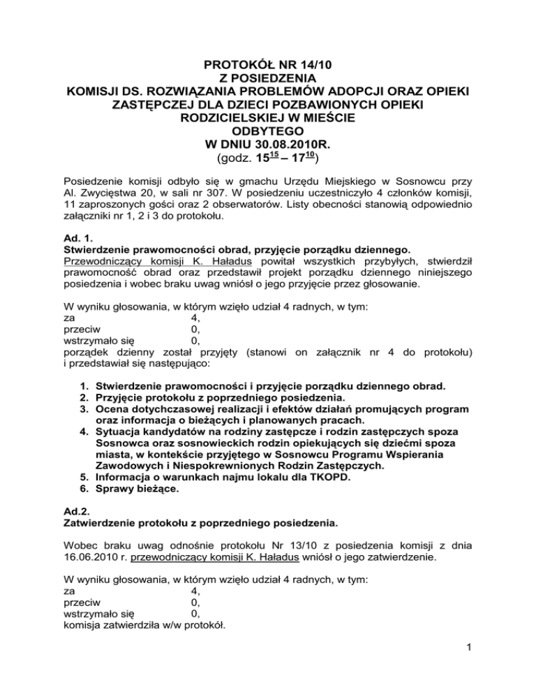 PROTOKÓŁ NR 14/10 Z POSIEDZENIA KOMISJI DS. ROZWIĄZANIA PROBLEMÓW ADOPCJI ORAZ OPIEKI ZASTĘPCZEJ DLA DZIECI POZBAWIONYCH OPIEKI RODZICIELSKIEJ W MIEŚCIE ODBYTEGO W DNIU 30.08.2010R. (godz. 1515 – 1710) Posiedzenie komisji odbyło się w gmachu Urzędu Miejskiego w Sosnowcu przy Al. Zwycięstwa 20, w sali nr 307. W posiedzeniu uczestniczyło 4 członków komisji, 11 zaproszonych gości oraz 2 obserwatorów. Listy obecności stanowią odpowiednio załączniki nr 1, 2 i 3 do protokołu. Ad. 1. Stwierdzenie prawomocności obrad, przyjęcie porządku dziennego. Przewodniczący komisji K. Haładus powitał wszystkich przybyłych, stwierdził prawomocność obrad oraz przedstawił projekt porządku dziennego niniejszego posiedzenia i wobec braku uwag wniósł o jego przyjęcie przez głosowanie. W wyniku głosowania, w którym wzięło udział 4 radnych, w tym: za 4, przeciw 0, wstrzymało się 0, porządek dzienny został przyjęty (stanowi on załącznik nr 4 do protokołu) i przedstawiał się następująco: 1. Stwierdzenie prawomocności i przyjęcie porządku dziennego obrad. 2. Przyjęcie protokołu z poprzedniego posiedzenia. 3. Ocena dotychczasowej realizacji i efektów działań promujących program oraz informacja o bieżących i planowanych pracach. 4. Sytuacja kandydatów na rodziny zastępcze i rodzin zastępczych spoza Sosnowca oraz sosnowieckich rodzin opiekujących się dziećmi spoza miasta, w kontekście przyjętego w Sosnowcu Programu Wspierania Zawodowych i Niespokrewnionych Rodzin Zastępczych. 5. Informacja o warunkach najmu lokalu dla TKOPD. 6. Sprawy bieżące. Ad.2. Zatwierdzenie protokołu z poprzedniego posiedzenia. Wobec braku uwag odnośnie protokołu Nr 13/10 z posiedzenia komisji z dnia 16.06.2010 r. przewodniczący komisji K. Haładus wniósł o jego zatwierdzenie. W wyniku głosowania, w którym wzięło udział 4 radnych, w tym: za 4, przeciw 0, 0, wstrzymało się komisja zatwierdziła w/w protokół. 1 Ad.3. Ocena dotychczasowej realizacji i efektów działań promujących program oraz informacja o bieżących i planowanych pracach. Naczelnik Wydziału Polityki Społecznej M. Ochęduszko – Ludwik odniosła się do działań promujących program; powiedziała, że dystrybucja ulotek została przeprowadzona przez Pocztę Polską, rozprowadzono również plakaty. Radny J. Bosak zaproponował rozdanie plakatów radnym. M. Małkiewicz z MOPS – u powiedziała, że zauważyła zainteresowanie ulotkami w dzielnicy Środula. Przewodniczący komisji K. Haładus zapytał, czy jest jakiś odzew na tą akcję w formie zgłoszeń do ośrodków. B. Kropka z Publicznego Ośrodka Adopcyjno – Opiekuńczego odpowiedziała, że w ośrodku kwalifikuje się jedna rodzina, która zgłosiła się w wyniku akcji i uczestniczy w spotkaniach z pedagogami i psychologami. Przedstawiła sytuację tej rodziny. M. Krawiec z Diecezjalnego Centrum Służby Rodzinie i Życiu poinformowała, że nie ma żadnych kandydatów do procesu kwalifikacji. M. Małkiewicz z MOPS – u stwierdziła, że zainteresowanie adopcją było większe przed wakacjami niż w okresie wakacyjnym. Przewodniczący komisji K. Haładus stwierdził, że ludzie, którzy dostają ulotki i widzą plakaty nie mają wiedzy, że chodzi o rodziny zastępcze i czym one są, dowiadują się tego dopiero po zapoznaniu z treścią. M. Mercik z WPI zaznaczył, że skuteczności dwuetapowej kampanii nie należy rozdzielać, ulotki i plakaty stanowiły wprowadzenie do drugiego etapu, jakim jest film. Poinformował, że wkrótce zostanie podpisana umowa z firmą, która pracuje nad scenariuszem. Przewodniczący komisji K. Haładus wspomniał o spotkaniach w ramach zespołu w Wydziale Polityki Społecznej, w których uczestniczyli przedstawiciele WPI, Publicznego Ośrodka Adopcyjnego, Ośrodka Diecezjalnego i MOPS – u; wskazano dwie rodziny zastępcze do udziału w filmie. M. Mercik z WPI dodał, że podjęto decyzję o niezatrudnianiu aktorów, ale osób pełniących funkcje rodzin zastępczych. Przewodniczący komisji K. Haładus zaznaczył, że dystrybucja filmu będzie wymagała współpracy z dyrekcją szkół i diecezją. Zapytał o informator internetowy dla zgłaszających się kandydatów. B. Kropka z Publicznego Ośrodka Adopcyjno – Opiekuńczego odpowiedziała, że dopracowanie informatora jest na etapie końcowym. 2 Przewodniczący komisji K. Haładus odniósł się do propozycji napisania bezpośredniego listu sygnowanego przez prezydenta bądź biskupa, stwierdził, że nie było woli zrealizowania tego pomysłu. Ad.4. Sytuacja kandydatów na rodziny zastępcze i rodzin zastępczych spoza Sosnowca oraz sosnowieckich rodzin opiekujących się dziećmi spoza miasta, w kontekście przyjętego w Sosnowcu Programu Wspierania Zawodowych i Niespokrewnionych Rodzin Zastępczych. Przewodniczący komisji K. Haładus powiedział o telefonie osoby, która opiekuje się chorym dzieckiem pochodzącym z innego miasta, zabranym z domu dziecka i czuje się niesprawiedliwie potraktowana w stosunku do rodzin objętych programem, w szczególności dodatkiem finansowym. B. Kropka z Publicznego Ośrodka Adopcyjno – Opiekuńczego odpowiedziała, że Ministerstwo nie odniosło się do dodatków, w piśmie podano, że każde umieszczenie dziecka poza powiatem wiąże się z porozumieniem pomiędzy powiatami, co jest związane z płatnością; powiat sosnowiecki może podpisywać umowy z rodziną, która mieszka poza powiatem. Przewodniczący komisji K. Haładus stwierdził, że powinno zostać zadane pytanie, czy sposób wypłaty dodatku, wynikającego z uchwały, dla rodzin spoza Sosnowca będzie legalne i w jaki sposób to zrealizować. Radny K. Winiarski stwierdził, że niejasna jest sprawa, jeżeli rodzina spoza Sosnowca bierze dziecko, którego pierwszym miejscem zamieszkania był Sosnowiec, czy jest możliwe wypłacenie zwiększonych kwot. A. Korpak Kierownik MOPS – Dział Rodzin Zastępczych powiedziała, że w podanym