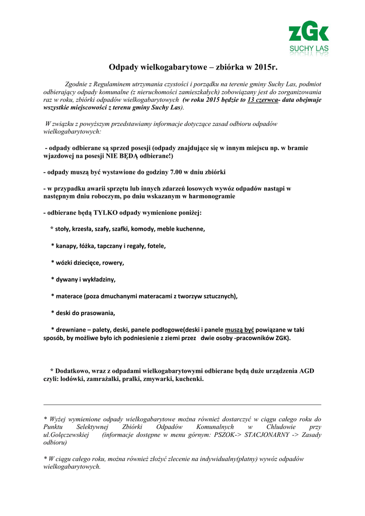 Odpady wielkogabarytowe – zbiórka w 2015r. Zgodnie z Regulaminem utrzymania czystości i porządku na terenie gminy Suchy Las, podmiot odbierający odpady komunalne (z nieruchomości zamieszkałych) zobowiązany jest do zorganizowania raz w roku, zbiórki odpadów wielkogabarytowych (w roku 2015 będzie to 13 czerwca- data obejmuje wszystkie miejscowości z terenu gminy Suchy Las). W związku z powyższym przedstawiamy informacje dotyczące zasad odbioru odpadów wielkogabarytowych: - odpady odbierane są sprzed posesji (odpady znajdujące się w innym miejscu np. w bramie wjazdowej na posesji NIE BĘDĄ odbierane!) - odpady muszą być wystawione do godziny 7.00 w dniu zbiórki - w przypadku awarii sprzętu lub innych zdarzeń losowych wywóz odpadów nastąpi w następnym dniu roboczym, po dniu wskazanym w harmonogramie - odbierane będą TYLKO odpady wymienione poniżej: * stoły, krzesła, szafy, szafki, komody, meble kuchenne, * kanapy, łóżka, tapczany i regały, fotele, * wózki dziecięce, rowery, * dywany i wykładziny, * materace (poza dmuchanymi materacami z tworzyw sztucznych), * deski do prasowania, * drewniane – palety, deski, panele podłogowe(deski i panele muszą być powiązane w taki sposób, by możliwe było ich podniesienie z ziemi przez dwie osoby -pracowników ZGK). * Dodatkowo, wraz z odpadami wielkogabarytowymi odbierane będą duże urządzenia AGD czyli: lodówki, zamrażalki, pralki, zmywarki, kuchenki. * Wyżej wymienione odpady wielkogabarytowe można również dostarczyć w ciągu całego roku do Punktu Selektywnej Zbiórki Odpadów Komunalnych w Chludowie przy ul.Golęczewskiej (informacje dostępne w menu górnym: PSZOK-> STACJONARNY -> Zasady odbioru) * W ciągu całego roku, można również złożyć zlecenie na indywidualny(płatny) wywóz odpadów wielkogabarytowych.