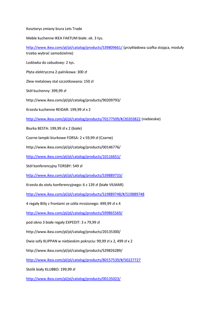 Kosztorys zmiany biura Lets Trade Meble kuchenne IKEA FAKTUM białe: ok. 3 tys. http://www.ikea.com/pl/pl/catalog/products/S39809661/ (przykładowa szafka stojąca, moduły trzeba wybrać samodzielnie) Lodówka do zabudowy: 2 tys. Płyta elektryczna 2-palnikowa: 300 zł Zlew metalowy stal szczotkowana: 150 zł Stół kuchenny: 399,99 zł http://www.ikea.com/pl/pl/catalog/products/90209793/ Krzesła kuchenne REIDAR: 199,99 zł x 2 http://www.ikea.com/pl/pl/catalog/products/70177509/#/20203822 (niebieskie) Biurka BESTA: 199,99 zł x 2 (białe) Czarne lampki biurkowe FORSA: 2 x 59,99 zł (Czarne) http://www.ikea.com/pl/pl/catalog/products/00146776/ http://www.ikea.com/pl/pl/catalog/products/10116651/ Stół konferencyjny TORSBY: 549 zł http://www.ikea.com/pl/pl/catalog/products/S39889733/ Krzesła do stołu konferencyjnego: 6 z 139 zł (białe VILMAR) http://www.ikea.com/pl/pl/catalog/products/S19889748/#/S19889748 4 regały Billy z frontami ze szkła mrożonego: 499,99 zł x 4 http://www.ikea.com/pl/pl/catalog/products/S99865569/ pod okno 3 białe regały EXPEDIT: 3 x 79,99 zł http://www.ikea.com/pl/pl/catalog/products/20135300/ Dwie sofy KLIPPAN w niebieskim pokryciu: 99,99 zł x 2, 499 zł x 2 http://www.ikea.com/pl/pl/catalog/products/S29826289/ http://www.ikea.com/pl/pl/catalog/products/80157539/#/50227727 Stolik biały KLUBBO: 199,99 zł http://www.ikea.com/pl/pl/catalog/products/00135023/ wieszaki Pulpo Andy niebieski: 2 x 84 zł http://czerwonamaszyna.pl/wieszak-pulpo-andy-pastelowy-niebieski,10073,p.html lustro na korytarz MONGSTAD: 399,99 zł http://www.ikea.com/pl/pl/catalog/products/00081591/ Lampy wiszące: 2 sztuki HEKTAR: 2 x 199,99 zł http://www.ikea.com/pl/pl/catalog/products/60215205/ kabina prysznicowa – 500 zł ceramika – 1000 zł glazura i terakota w łazience kuchni i przedpokoju: ok 3000 zł