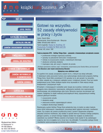 Gotowi na wszystko. 52 zasady efektywnoœci w pracy i ¿yciu Autor: David Allen T³umaczenie: Anna Kucharczyk - Barycza ISBN: 978-83-246-1581-0 Tytu³ orygina³u: Ready for Anything: 52 Productivity Principles for Work and Life Format: A5, stron: 192 Twórca programu GTD – Getting Things Done – ponownie o fenomenalnym zarz¹dzaniu czasem: • prze³omowe strategie organizacji osobistej • sposoby na pobudzenie twórczoœci i kreatywnoœci • metody na oczyszczanie umys³u z nieistotnych informacji • skuteczne schematy dzia³ania • inspiruj¹ce rady, jak ruszyæ z impetem do przodu „Strategia opanowania nadmiaru zajêæ i obowi¹zków, proponowana przez Davida Allena, jest bezcenna!” – Ken Blanchard, autor ksi¹¿ki Jednominutowy Mened¿er Najwy¿szy czas okie³znaæ czas! To zupe³nie inne zasady zarz¹dzania czasem ni¿ te, z którymi siê dot¹d zetkn¹³eœ. Z w³aœciwym sobie poczuciem humoru oraz wykorzystuj¹c skutecznoœæ programu Getting Things Done, David Allen przedstawi Ci 52 sposoby na to, jak sprawiæ, by wszystko, co robisz, wi¹za³o siê z mniejszym nak³adem pracy i mniejszym stresem. Poza tym ka¿de podejmowane przez Ciebie dzia³anie bêdzie teraz wyzwala³o w Tobie wiêcej energii, kreatywnoœci i pozytywnych myœli. W ka¿dym z motywuj¹cych rozdzia³ów autor skupia siê na jednej z istotnych zasad osi¹gania stanu odprê¿enia i opanowania, zdobywania swobody oraz wypracowania bezstresowego, ale produktywnego stylu ¿ycia. Wreszcie nauczysz siê panowaæ nad czasem. Osi¹gniesz to dziêki realizacji poszczególnych lekcji, pogrupowanych wed³ug czterech g³ównych tematów: • oczyszczenie umys³u • skupienie uwagi • stworzenie struktur zapewniaj¹cych sukces • podjêcie skutecznego dzia³ania Rewolucyjny system Getting Things Done potwierdza tezê, ¿e ludzie na ca³ym œwiecie, mimo ró¿nic kulturowych i zawodowych, poszukuj¹ takich w³aœnie informacji i mo¿liwoœci zmian. Czy czujesz siê czasem przyt³oczony prac¹ i ¿yciem? Desperacko pragniesz odzyskaæ utracone mo¿liwoœci, aby dzia³aæ w sposób twórczy? Szukasz nowego podejœcia, jakiegoœ systemu, w ramach którego móg³byœ dzia³aæ bez wzglêdu na okolicznoœci zawodowe czy osobiste? Wiedza zawarta w tej ksi¹¿ce mo¿e wydaæ Ci siê zaskakuj¹co znajoma, lecz nie ze wzglêdu na to, ¿e ju¿ siê z ni¹ zetkn¹³eœ. To wszystko zas³uga intuicji i bezb³êdnie wykorzystuj¹cego jej istnienie planu dzia³ania. EFEKTYWNA KONCENTRACJA 77 18. Im jaśniejszy cel, tym więcej metod na dojście do niego Oto niezwykły paradoks świata dóbr materialnych: im konkretniejsza jest wizja czy zamiary, tym większą mogą wyzwolić kreatywność. Im większa nasza wiedza o celu, w jakim robimy to, co robimy, tym większa wolność jest nam dana, by badać wszelkie możliwe sposoby na osiągnięcie wybranego celu. Im więcej wiemy o tym, dlaczego organizujemy przyjęcie dla pracowników, kącik do wypoczynku, zatrudniamy asystentkę, piszemy jakiś program komputerowy, przeprowadzamy fuzję z inną firmą, tym więcej zyskamy nowych i wyjątkowych pomysłów i innych niestereotypowych możliwości osiągnięcia sukcesu. Powiedz mi, gdzie mieszkasz… KONCENTRACJA WYNIKAJĄCA Z CELU to od wielu lat najważniejszy element moich wykładów, kursów, szkoleń i konsultacji dla menedżerów. Jeśli nie wiemy, po co mamy coś robić, brakuje nam motywacji, jasności i ukierunkowania. Jeśli znamy cel naszych działań — robimy coś na spotkanie, na potrzeby druku broszury, dla firmy — wówczas mamy kryterium, którym kierujemy się przy dokonywaniu wyborów i dążeniu do osiągnięcia sukcesu, a także motywację, dzięki której możemy pokonać lub obejść przeszkody utrudniające skuteczne działanie. Ostatnio jednak zastanawiałem się nad liczbą różnych procedur i procesów, które kierują działaniami ludzkimi, a które wymagają zmian. Zostały utworzone przez kogoś na jakimś etapie, gdyż zapewne do pewnego momentu istniało takie zapotrzebowanie, jednak obecnie nie ma ono już znaczenia. Zacząłem się nad tym dłużej zastanawiać, ponieważ 78 GOTOWI NA WSZYSTKO zaobserwowałem, iż niektóre pomieszczenia biurowe dla kadry zarządzającej były praktycznie w całości niefunkcjonalne z punktu widzenia osobistej wydajności. Brakowało miejsca na kluczowe elementy komunikacji osobistej, koszyki zadań, najważniejsze dokumenty, nie było dostępu do drukarek, było za mało półek na książki i inne poradniki, z których często się korzysta itd. Biurka wprawdzie były przeogromne, ale mało kto z nich korzystał, aby ich nie zniszczyć. W przeszłości tak urządzone pomieszczenia biuroDoskonałość we miały robić wrażenie na klientach czy petentach — środków dany szef mógł sobie pozwolić na taką ilość drewniai pomieszanie celów nych mebli biurowych, choć miał tak mało pracy! zdają się, moim Spójrzcie, co za tron! Uwaga, król idzie! Jednak ludzie, zdaniem, najlepiej którzy przebywają w takich miejscach, mają bardzo charakteryzować nasz wiek. różne potrzeby i priorytety. Są tam po to, aby wykony— ALBERT EINSTEIN wać swoją pracę, szybko komunikować się z innymi i panować nad wszystkim. Tak zorganizowane biura to przeżytek. Nie służą one bieżącym celom. Należy je przemeblować, przearanżować i unowocześnić. Pracując od wielu lat z różnymi klientami, zauważyłem, iż w wielu firmach odbywa się mnóstwo cotygodniowych zebrań pracowników. Nigdy nie ma na nich pełnej frekwencji i rzadko kiedy wynika z nich coś konstruktywnego. Tego rodzaju spotkania odbywają się często zwłaszcza w nowych zespołach i działach, a wynika to z tego, iż funkcjonują od niedawna, w związku z czym wszyscy pracownicy powinni być jednakowo wdrożeni i poinformowani o wszystkim. Kiedy jednak urok nowości minie, a wszystko odbywa się zgodnie z rutyną, zapotrzebowanie na cotygodniowe posiedzenia de facto maleje, choć są one n