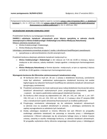 numer postępowania: 36/NHR-K/2015 Bydgoszcz, dnia 17 września 2015 r. Postępowanie konkursowe prowadzone będzie w oparciu o przepisy ustawy z dnia 15 kwietnia 2011 r. o działalności leczniczej (t. j. Dz. U. z 2015 poz. 618), oraz ustawy z dnia 27 sierpnia 2004 r. o świadczeniach opieki zdrowotnej finansowanej ze środków publicznych (t.j. Dz. U. z2015 poz. 581) SZCZEGÓŁOWE WARUNKI KONKURSU OFERT Przedmiotem konkursu są następujące świadczenia: ZAKRES 1 - udzielanie świadczeń zdrowotnych przez lekarza specjalistę w zakresie chorób wewnętrznych w Klinice Endokrynologii i Diabetologii oraz Klinice Medycyny Ratunkowej: Miejsce udzielania świadczeń jest: • Klinika Endokrynologii i Diabetologii, • Klinika Medycyny Ratunkowej. Udzielający zamówienia przewiduje przyjęcie 1 osoby z określonymi kwalifikacjami zawodowymi: • specjalizacja w zakresie/dziedzinie chorób wewnętrznych. Przedmiot konkursu obejmuje udzielanie świadczeń medycznych w: • Klinice Endokrynologii i Diabetologii w dni robocze od 7:25 do 15:00 w miesiącu, dyżury medyczne w dni robocze, soboty niedziele i święta zgodnie z miesięcznym harmonogramem pracy. • Klinice Medycyny Ratunkowej w formie dyżurów medycznych, w tym co najmniej 3 dyżury od 8:00 do 15:00 zgodnie z miesięcznym harmonogramem pracy. Wymagania konieczne dla Oferentów zainteresowanych świadczeniem usług. a) W konkursie ofert w myśl art. 26 ust. 1 ustawy o działalności leczniczej, zamówienie może być udzielone podmiotowi wykonującemu działalność leczniczą lub osobie legitymującej się nabyciem fachowych kwalifikacji do udzielania świadczeń zdrowotnych (przyjmujący zamówienie). b) Przedmiot zamówienia nie może wykraczać poza rodzaj działalności leczniczej lub zakres świadczeń zdrowotnych wykonywanych przez przyjmującego zamówienie, zgodnie z wpisem do rejestru podmiotów wykonujących działalność leczniczą c) Do konkursu ofert stosuje się odpowiednio art. 140, art. 141, art. 146 ust. 1, art. 147150, 151 ust. 1, 2, 4-6, art. 152, 153 i art. 154 ust. 1 i 2 ustawy z dnia 27 sierpnia 2004 roku o świadczeniach opieki zdrowotnej finansowanych ze środków publicznych d) Przyjmujący zamówienie zobowiązuje się do udzielania świadczeń zdrowotnych w zakresie oraz na zasadach określonych w umowie, a udzielający zamówienia do zapłaty wynagrodzenia za udzielanie tych świadczeń. e) Osoby udzielające świadczeń w imieniu Oferenta lub sam Oferent (w przypadku osobistego udzielania świadczeń) nie pozostają w stosunku pracy z Udzielającym zamówienie i Oferent zobowiąże się do utrzymania takiego stanu w trakcie trwania umowy, zawartej w wyniku niniejszego konkursu, w zakresie świadczeń zdrowotnych. W przypadku wyłonienia oferty oferenta związanego stosunkiem pracy z Udzielającym zamówienia, oferent (w przypadku osobistego udzielania świadczeń) zobowiązuje się do rozwiązania umowy o pracę z dniem zawarcia umowy o świadczenia zdrowotne. Do konkursu mogą przystąpić tylko i wyłącznie osoby spełniające wymagania określone w przepisach szczególnych oraz niniejszych Szczegółowych Warunków Konkursu (dalej SWK). W sprawach nieuregulowanych w SWK stosuje się obowiązujące przepisy prawa. WYMOGI FORMALNE W ZAKRESIE PRZYGOTOWANIA OFERTY 1. Ofertę należy sporządzić w języku polskim zgodnie z SWK, w formie maszynopisu lub wydruku i dołączyć od niej wymagane załączniki (dopuszczalne jest wypełnienie załączników przy użyciu długopisu lub pióra czytelnym pismem). 2. Oświadczenia i dokumenty złożone w języku obcym powinny być przetłumaczone przez tłumacza przysięgłego. Tekst tłumaczenia wraz z dokumentem oryginalnym należy dołączyć do oferty. 3. Wszelkie poprawki, przekreślenia lub zmiany w ofercie powinny być parafowane przez Oferenta. 4. Formularz ofertowy należy opracować na załączonym druku „OFERTA”. 5. Oferent nie może dokonywać żadnych zmian we wzorze druku „OFERTA”. 6. Do formularza oferty należy dołączyć wszelkie wymagane w SWK dokumenty. 7. Jeżeli dokument przedstawiony jest w postaci kserokopii – konieczne jest jego poświadczenie „za zgodność z oryginałem” przez Oferenta, opatrzone podpisem Oferenta i w miarę możliwości pieczątką imienną. 8. Udzielający zamówienia może żądać w trakcie postępowania konkursowego oryginału lub notarialnie poświadczonej kopii dokumentu załączonego przez Oferenta wyłącznie wtedy, gdy przedstawiona przez Oferenta kopia dokumentu jest nieczytelna lub budzi wątpliwości co do jej autentyczności. 9. Kompletna oferta powinna składać się z: 1) formularza ofertowego Załącznik nr 1. 2) dokumentów potwierdzających kwalifikacje zawodowe (zgodne z zał. nr 1). 10. Oferty złożone po wyznaczonym terminie lub nadane jako przesyłka pocztowa, niezależnie od daty nadania, będą odrzucane, jeżeli wpłyną do kancelarii szpitala po terminie zakreślonym do ich złożenia. 11. Oferent może złożyć tylko jedną ofertę w jednym, wybranym przez siebie zakresie. Złożenie większej liczby ofert spowoduje odrzucenie każdej z nich. 12. Propozycje rozwiązań alternatywnych lub wariantowych nie będą brane pod uwagę. 13. Oferenci ponoszą wszelkie koszty związane z przygotowaniem i złożeniem oferty. TERMIN, MIEJSCE ORAZ SPOSÓB SKŁADANIA OFERT 1. Oferty należy składać w zamkniętej (zaklejonej) kopercie w dniach od 17.09.2015 r. do 21.09.2015 r. do godz. 12:00 (wyłącznie w dni powszednie) w Biurze Podawczym Szpitala przy ul. M. Skłodowskiej-Curie 9. 2. Ofertę wraz ze wszystkimi załącznikami należy umieścić w kopercie opatrzonej napisem: „ Konkurs ofert nr ……na udzielanie świadczeń zdrowotnych w zakresie ….. ogłoszenia (należy wpisać nr zakresu, na który składana jest oferta) nie otwierać przed 21.09.2015 r. godz. 12:30” 3. 4. Na wniosek Oferent otrzyma pisemne potwierdzenie złożenia oferty wraz z numerem jakim została oznakowan