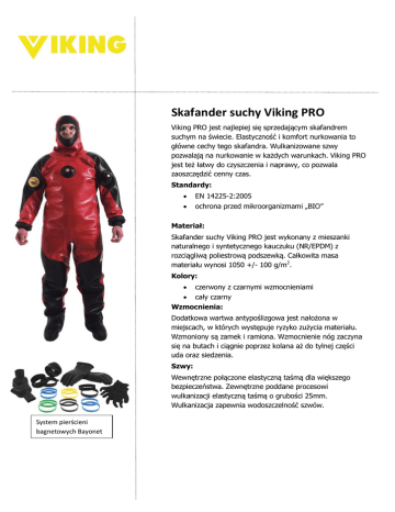 Skafander suchy Viking PRO Viking PRO jest najlepiej się sprzedającym skafandrem suchym na świecie. Elastyczność i komfort nurkowania to główne cechy tego skafandra. Wulkanizowane szwy pozwalają na nurkowanie w każdych warunkach. Viking PRO jest też łatwy do czyszczenia i naprawy, co pozwala zaoszczędzić cenny czas. Standardy: EN 14225-2:2005 ochrona przed mikroorganizmami „BIO” Materiał: Skafander suchy Viking PRO jest wykonany z mieszanki naturalnego i syntetycznego kauczuku (NR/EPDM) z rozciągliwą poliestrową podszewką. Całkowita masa materiału wynosi 1050 +/- 100 g/m2. Kolory: czerwony z czarnymi wzmocnieniami cały czarny Wzmocnienia: Dodatkowa wartwa antypoślizgowa jest nałożona w miejscach, w których występuje ryzyko zużycia materiału. Wzmoniony są zamek i ramiona. Wzmocnienie nóg zaczyna się na butach i ciągnie poprzez kolana aż do tylnej części uda oraz siedzenia. Szwy: Wewnętrzne połączone elastyczną taśmą dla większego bezpieczeństwa. Zewnętrzne poddane procesowi wulkanizacji elastyczną taśmą o grubości 25mm. Wulkanizacja zapewnia wodoszczelność szwów. System pierścieni bagnetowych Bayonet Zamek błyskawiczny: Magnetyczny zamek błyskawiczny typu Heavy Duty długości 90cm jest w standardzie z czerwonym kombinezonem. Niemagnetyczny zamek błyskawiczny jest w standardzie z kombinezonem czarnym. Zawory: Standardowa konfiguracja zawiera następujące zawory zamontowane na talerzach mocujących: Środek klatki piersiowej: zawór dolotowy SI Tech Wąż: 80 cm, mocowany szybkozłączką CEJN lewe ramię: podwójny zawór upustowy Viking z dodanymi dwoma zaworami grzybkowymi dla zwiększenia bezpieczeństwa Alteratywnie: Niemagnetyczny zawór dolotowy, zawór dolotowy Apeks. Niemagnetyczne węże. Zawór upustowy Apeks, niemagnetyczny zawór upustowy. Buty: Standardowe buty są przedłużeniem nogawki z wytrzymałą, elastyczną podeszwą doszytą do końca. Jest antypoślizgowa i zapewnia dobrą przyczepność. Zaczepy na płetwy znajdują się na pięcie. Alternatywnie: Buty z neoprenowym ociepleniem od wewnątrz, buty nitrylowe ze stalowymi noskami i śródstopiem., buty PVC. Kryza szyjna: Skafander Viking PRO jest standardowo wyposażony w lateksową kryzę Surveyor. Alternatywnie: Butelkowa, lateksowa kryza szyjna, kryza neoprenowa, system szybkiego zakładania kołnierza ułatwiający jego wymianę. Kaptur: Viking PRO może zostać wyposażony w następujące werjse kaptura: Rękawice lateksowe kaptur lateksowy Surveyor + kaptur wewnętrzny ocieplający kaptur neoprenowy z dopasowanym uszczelnieniem twarzy kaptur Smoothskin kauczukowy kaptur Turbo w kolorze czarnym kauczukowy kaptur Magnum w kolorze czarnym Jeśli kombinezon jest wyposażony w system szybkiego zakładania kołnierza to są dostępne jeszcze inne lateksowe i neoprenowe kaptury. Manszety: Standardowo dołączone lateksowe manszety PRO. Alternatywnie: Lateksowe manszety Heavy Duty, lateksowe manszety butelkowe, krótkie manszety stożkowe. Opcje mocowania rękawic: Zestaw naprawczy Aby zapewnić wodoszczelność kombinezonu można użyć systemu pierścieni gumowych z dopasowanym zewnętrznym pierścieniem i luźnym plastikowym pierścieniem, który będzie utrzymywał lateksowe uszczelnienie na swoim miejscu. Drugą opcją jest system pierścieni bagnetowych Bayonet z plastikowym pierścieniem zamocowanym do rękawa i wymienne mankiety utrzymywane w miejscu za pomocą plastikowego pierścienia. Do obydwóch systemów można zastosować rękawice lateksowe, z tworzywa Viton/kauczuku butylowego lub rękawice nitrylowe/chloroprenowe. Do każdego skafandra dołączane są: -torba, szelki, instrukcja obsługi, zestaw naprawczy, środki do konserwacji zamka Właściwości materiału: Właściwość: Grubość Waga Odporność na rozciąganie Odporność na rozdarcie Odporność na przekłucie Odporność na ścieranie Wynik: 1.20 mm +/- 0.10 mm 2 1050 gm/m2 +/- 100 g/m osnowa: min 800 N/50mm wątek: min 650 N / 50 mm osnowa: min 45N wątek: min 45N min 60N min 7000 cykli Standard: ISO 3801 ISO 1421 ISO 4674 pr EN 863 ISO 5470-1 H18, 250 g Tabela wyników z testów HZ (Viking PRO nie spełnia wymagań HZ wskutek nie zaliczenia testu na przenikanie cieczy B) Substancja Czas przenikania w min Kwas siarkowy H2SO4 (ciekły) Materiał >480 Stopień ochrony Wysoki Szwy >480 Wysoki Zamek >480 Wysoki Materiał >480 Wysoki Szwy >480 Wysoki Zamek >480 Wysoki Materiał >480 Wysoki Szwy >480 Wysoki Zamek >480 Wysoki Materiał >480 Wysoki Szwy >480 Wysoki Zamek >480 Wysoki Materiał 20 nie zdany Szwy 19 nie zdany Zamek 48 Niski Materiał 213 Wysoki Szwy 117 Wysoki Zamek >480 Wysoki Wodorotlenek sodu NaOH (ciekły) Izopropanol Toluen 0,05% (ciekły) Ciecz B (70% izooktan & 30% toluen) Ciecz F (80% olej parafinowy & 20% metylonaftalen) Minimalny czas przenikania wymagany to 20 minut. Niski stopień ochrony = 20-60 minut Wysoki stopień ochrony = >60 minut