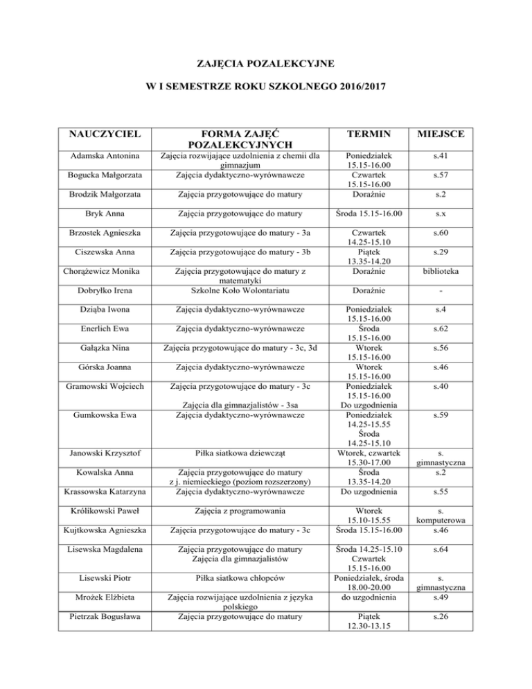ZAJĘCIA POZALEKCYJNE W I SEMESTRZE ROKU SZKOLNEGO 2016/2017 NAUCZYCIEL FORMA ZAJĘĆ POZALEKCYJNYCH TERMIN MIEJSCE Adamska Antonina Brodzik Małgorzata Zajęcia przygotowujące do matury Poniedziałek 15.15-16.00 Czwartek 15.15-16.00 Doraźnie s.41 Bogucka Małgorzata Zajęcia rozwijające uzdolnienia z chemii dla gimnazjum Zajęcia dydaktyczno-wyrównawcze Bryk Anna Zajęcia przygotowujące do matury Środa 15.15-16.00 s.x Brzostek Agnieszka Zajęcia przygotowujące do matury - 3a s.60 Ciszewska Anna Zajęcia przygotowujące do matury - 3b Czwartek 14.25-15.10 Piątek 13.35-14.20 Doraźnie biblioteka Doraźnie - Poniedziałek 15.15-16.00 Środa 15.15-16.00 Wtorek 15.15-16.00 Wtorek 15.15-16.00 Poniedziałek 15.15-16.00 Do uzgodnienia Poniedziałek 14.25-15.55 Środa 14.25-15.10 Wtorek, czwartek 15.30-17.00 Środa 13.35-14.20 Do uzgodnienia s.4 Chorążewicz Monika Dobryłko Irena Zajęcia przygotowujące do matury z matematyki Szkolne Koło Wolontariatu Dziąba Iwona Zajęcia dydaktyczno-wyrównawcze Enerlich Ewa Zajęcia dydaktyczno-wyrównawcze Gałązka Nina Zajęcia przygotowujące do matury - 3c, 3d Górska Joanna Zajęcia dydaktyczno-wyrównawcze Gramowski Wojciech Zajęcia przygotowujące do matury - 3c Gumkowska Ewa Zajęcia dla gimnazjalistów - 3sa Zajęcia dydaktyczno-wyrównawcze Janowski Krzysztof Piłka siatkowa dziewcząt Kowalska Anna Krassowska Katarzyna Zajęcia przygotowujące do matury z j. niemieckiego (poziom rozszerzony) Zajęcia dydaktyczno-wyrównawcze Królikowski Paweł Zajęcia z programowania Kujtkowska Agnieszka Zajęcia przygotowujące do matury - 3c Lisewska Magdalena Zajęcia przygotowujące do matury Zajęcia dla gimnazjalistów Lisewski Piotr Piłka siatkowa chłopców Mrożek Elżbieta Zajęcia rozwijające uzdolnienia z języka polskiego Zajęcia przygotowujące do matury Pietrzak Bogusława s.57 s.2 s.29 s.62 s.56 s.46 s.40 s.59 s. gimnastyczna s.2 s.55 Wtorek 15.10-15.55 Środa 15.15-16.00 s. komputerowa s.46 Środa 14.25-15.10 Czwartek 15.15-16.00 Poniedziałek, środa 18.00-20.00 do uzgodnienia s.64 Piątek 12.30-13.15 s. gimnastyczna s.49 s.26 Poniatowski Grzegorz Zajęcia przygotowujące do matury Sanford Teresa Sarbiewska Anna Zajęcia rozwijające uzdolnienia z języka angielskiego Zajęcia dla gimnazjalistów - 3sa Sypniewska Mariola Zajęcia dydaktyczno-wyrównawcze - kl. 2sa Tobolewska Anna Zajęcia przygotowujące do matury Tomaszczyk Ewa Rytm, muzyka, taniec - zajęcia przy muzyce Walkiewicz Katarzyna Piłka siatkowa chłopców w gimnazjum Weichhaus-Kończyk Elżbieta Witkowska Jolanta Koło Kresowe Zajęcia przygotowujące do matury -3c Wróblewski Michał - 3d Koszykówka dziewcząt i chłopców Załubski Wiesław Zyśk Magdalena Poniedziałek 15.10-15.55 Czwartek 8.00-8.45 Wtorek 15.10-15.55 Wtorek 15.20-16.05 Piątek 14.25-15.10 Poniedziałek 17.00-18.00 Poniedziałek, środa, piątek 15.30-17.00 Doraźnie s.48 s.62 s.57 s.45 s.30 s. gimnastyczna s. gimnastyczna s.27 s. gimnastyczna Koło Strzeleckie Czwartek 14.25-15.10 Piątek 14.25-15.10 Wtorek 15.30-18.30 Czwartek 16.00-17.30 Doraźnie s.41 Przygotowanie do bierzmowania Doraźnie s.5 Strzelnica