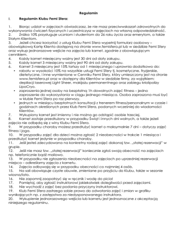 Regulamin I. Regulamin Klubu Femi Sfera: 1. Biorąc udział w zajęciach oświadczasz, że nie masz przeciwwskazań zdrowotnych do wykonywania ćwiczeń fizycznych i uczestniczysz w zajęciach na własną odpowiedzialność. 2. Zniżka 10% przysługuje uczniom i studentom do 26 roku życia oraz emerytom, a także Stałym Klientom. 3. Jeżeli chcesz korzystać z usług Klubu Femi Sfera wypełnij formularz osobowy – obowiązkową Kartę Klienta dostępną na stronie www.femisfera.pl lub w siedzibie Femi Sfery oraz wykup jednorazowe wejście na zajęcia lub karnet, zgodnie z obowiązującym cennikiem. 4. Każdy karnet miesięczny ważny jest 30 dni od daty zakupu. 5. Każdy karnet 3 miesięczny ważny jest 90 dni od daty zakupu. 6. Karnet 3 miesięczny jest 15% tańszy od 1 miesięcznego i uprawnia dodatkowo do: • rabatu w wysokości 10% na wszystkie usługi Femi Sfery tj. kosmetyczne, fryzjerskie, dietetyczne, i inne wymienione w Cenniku Femi Sfery, który umieszczony jest na stronie www.femisfera.pl oraz w dostępny dla Klientów w siedzibie firmy, za wyjątkiem: depilacji laserowej Light Sheer, makijażu permanentnego oraz zabiegu kriolipolizy LipoCryo. • zaproszenia jednej osoby na bezpłatną 1h dowolnych zajęć fitness – jedno zaproszenie do wykorzystania w ciągu jednego miesiąca. Osoba zaproszona musi być w klubie Femi Sfera po raz pierwszy. • jednych w miesiącu bezpłatnych konsultacji z trenerem fitness/personalnym w czasie i godzinach określonych przez Klub Femi Sfera, podanych wcześniej do wiadomości Klientów. 7. Wykupiony karnet jest imienny i nie można go odstąpić osobie trzeciej. 8. Karnet zostaje przedłużony w przypadku Świąt i innych dni wolnych, a także jeżeli zajęcia nie odbędą się z winy Klubu Femi Sfera. 9. W przypadku choroby możesz przedłużyć karnet o maksymalnie 7 dni – dotyczy zajęć fitness i joga. 10. W przypadku zajęć dla dzieci można zgłosić 2 nieobecności w trakcie 1 miesiąca i przedłużyć karnet jedynie w przypadku choroby. 11. Jeśli jesteś zdecydowana na konkretny rodzaj zajęć dokonaj tzw. „stałej rezerwacji” w grupie. 12. Jeśli nie masz tzw. „stałej rezerwacji” koniecznie zgłoś swoją obecność na zajęciach np. telefonicznie bądź mailowo. 13. W przypadku nie zgłoszenia nieobecności na zajęciach po uprzedniej rezerwacji miejsca – odkreślamy zajęcia z karnetu. 14. Zajęcia odbywają się w przypadku obecności co najmniej 4 osób. 15. Na sali obowiązuje czyste obuwie, zmieniane po przyjściu do Klubu, także w sezonie wiosna/lato. 16. Nie zapomnij zaopatrzyć się w ręcznik i wodę do picia! 17. Pamiętaj, aby zgłosić instruktorowi jakiekolwiek dolegliwości przed zajęciami. 18. Nie wychodź z zajęć bez podania przyczyny instruktorowi. 19. Klub Femi Sfera zastrzega sobie prawo do odwołania zajęć i zmian w grafiku wynikających np. z zastępstwa za niedysponowanego instruktora. 20. Wykupienie jednorazowego wejścia lub karnetu jest jednoznaczne z akceptacją niniejszego regulaminu. II. Status Stałego Klienta: 1. Status Stałego Klienta przysługuje osobie, która przez okres 5 miesięcy bez przerwy dokonywała zakupu karnetu na zajęcia fitness, joga lub zajęć dla dzieci. 2. Status Stałego Klienta uprawnia do 10% na zakup kolejnych karnetów. 3. Status Stałego Klienta uprawnia do rabatu w wysokości 10% na wszystkie usługi Femi Sfery tj. kosmetyczne, fryzjerskie, dietetyczne, i inne wymienione w Cenniku Femi Sfery, który umieszczony jest na stronie www.femisfera.pl oraz w dostępny dla Klientów w siedzibie firmy, za wyjątkiem: depilacji laserowej Light Sheer, makijażu permanentnego oraz zabiegu kriolipolizy LipoCryo. 4. Status Stałego Klienta uprawnia do zaproszenia jednej osoby na bezpłatną 1h dowolnych zajęć fitness – jedno zaproszenie do wykorzystania w ciągu jednego miesiąca. Osoba zaproszona musi być w klubie Femi Sfera po raz pierwszy. 5. Status stałego Klienta uprawnia do jednych w miesiącu bezpłatnych konsultacji z trenerem fitness/personalnym w czasie i godzinach określonych przez Klub Femi Sfera, podanych wcześniej do wiadomości Klientów. 6. Status Stałego Klienta uprawnia do przedłużenia karnetu o maksymalnie 14 dni w przypadku choroby. 7. Status Stałego Klienta zostaje anulowany w momencie, gdy ciągłość w dokonywaniu zakupu karnetów zostaje zerwana, tj, przerwa między wygaśnięciem jednego karnetu a wykupieniem kolejnego jest dłuższa niż 14 dni. III. Praktyka jogi 1. Jogę praktykujemy z pustym żołądkiem, co najmniej 2 godziny przed zajęciami nie spożywaj dużego posiłku. 2. Jeżeli jesteś w ciąży, zgłoś się do instruktora i pokaż pisemne zaświadczenie o braku przeciwwskazań do praktyki jogi. 3. Panie podczas menstruacji mają oddzielny cykl asan, dlatego zgłoś ten fakt instruktorowi przed zajęciami. 4. Strój do jogi przede wszystkim nie może krępować ruchów, ćwiczymy boso. 5. Weź ze sobą skarpety i bluzę – przydadzą się w czasie relaksu.