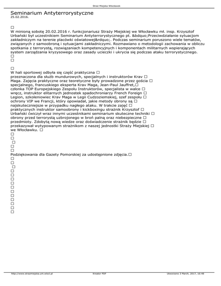 Straż Miejska Włocławek Seminarium Antyterrorystyczne 25.02.2016. W minioną sobotę 20.02.2016 r. funkcjonariusz Straży Miejskiej we Włocławku mł. insp. Krzysztof Urbański był uczestnikiem Seminarium Antyterrorystycznego pt. „Przeciwdziałanie sytuacjom zakładniczym na terenie placówki oświatowej”. Podczas seminarium poruszono wiele tematów, związanych z samoobroną i sytuacjami zakładniczymi. Rozmawiano o metodologii zachowania w obliczu spotkania z terrorystą, rozwiązaniach kompetencyjnych i komponentach militarnych wspierających system zarządzania kryzysowego oraz zasady ucieczki i ukrycia się podczas ataku terrorystycznego. W hali sportowej odbyła się część praktyczna przeznaczona dla służb mundurowych, specjalnych i instruktorów Krav Maga. Zajęcia praktyczne oraz teoretyczne były prowadzone przez gościa specjalnego, francuskiego eksperta Krav Maga, Jean-Paul Jauffret, członka TOP Europejskiego Zespołu Instruktorów, specjalista w walce wręcz, instruktor elitarnych jednostek spadochroniarzy French Foreign Legion, szkoleniowiec Krav Maga w Legii Cudzoziemskiej, szef zespołu ochrony VIP we Francji, który opowiadał, jakie metody obrony są najskuteczniejsze w przypadku nagłego ataku. W trakcie zajęć praktycznych instruktor samoobrony i kickboxingu strażnik Krzysztof Urbański ćwiczył wraz innymi uczestnikami seminarium skuteczne techniki obrony przed terrorystą uzbrojonego w broń palną oraz niebezpieczne przedmioty. Zdobytą nową wiedze oraz doświadczenie strażnik będzie przekazywał wytypowanym strażnikom z naszej jednostki Straży Miejskiej we Włocławku. Podziękowania dla Gazety Pomorskiej za udostępnione zdjęcia. http://www.strazmiejska.um.wlocl.pl Kreator PDF Utworzono 3 March, 2017, 16:48